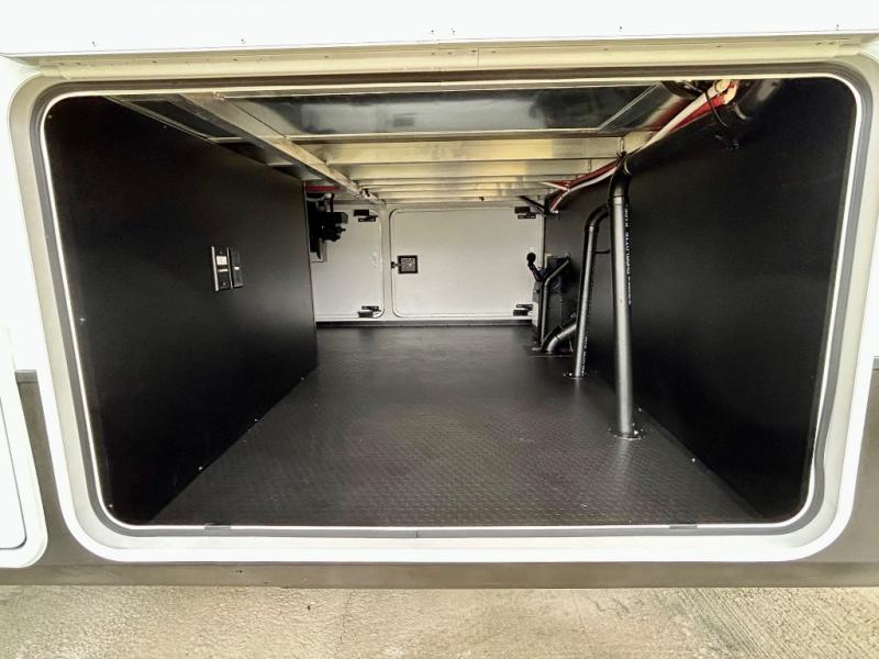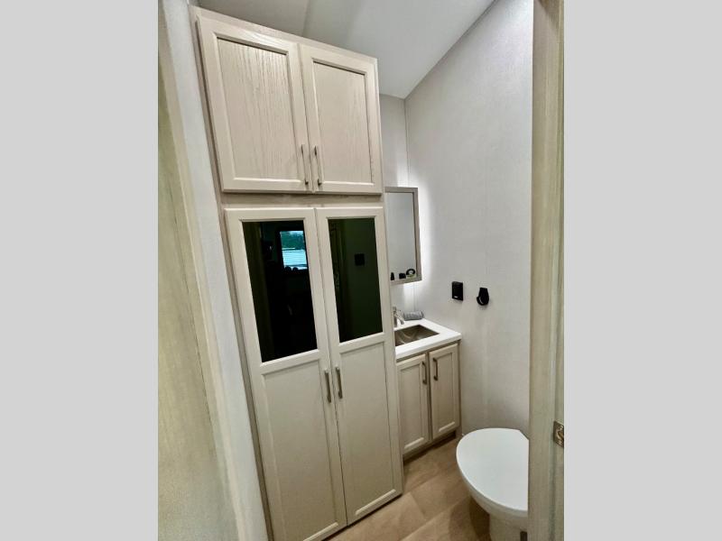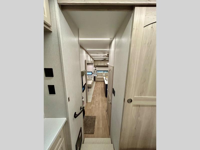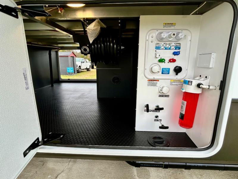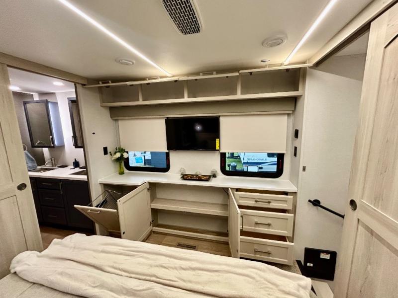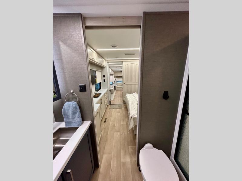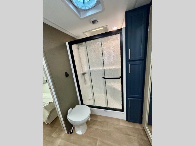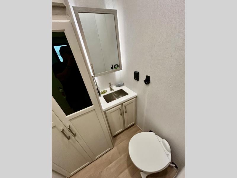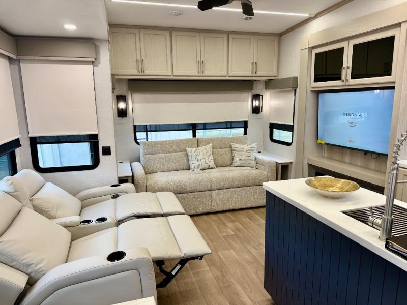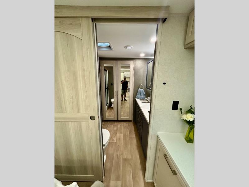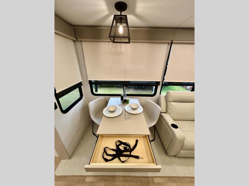 Everyone will stay clean with a bath and a half in this fifth wheel! The kitchen has a pantry big enough for everyone's favorite snacks, a gas cooktop, and a kitchen island to prepare your best meals. You can have game night indoors at the table and chairs or set up a table and chairs underneath the two power awnings. The rear living area offers a comfortable place to watch the big game too with a sofa/sleeper and theater seating directly across from the entertainment center with a 50" Smart TV and fireplace. Two can get ready at once in the front bathroom featuring a vanity with dual sinks, and since there is washer and dryer prep, you have the option to make wash day easier!