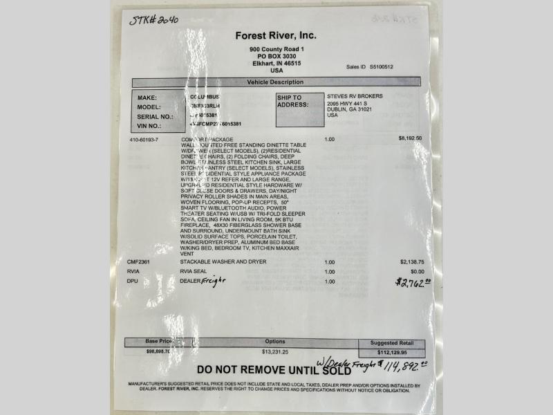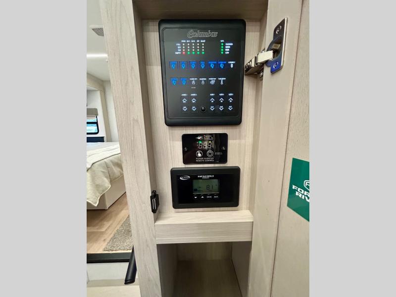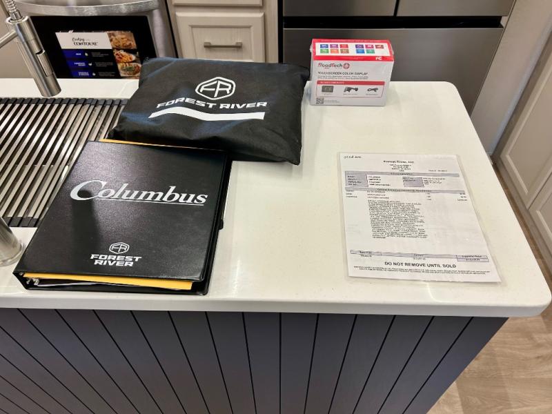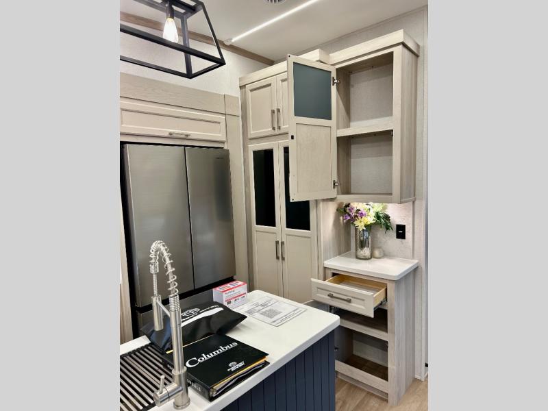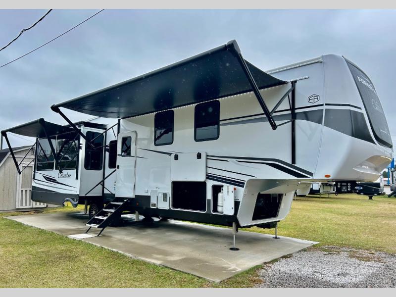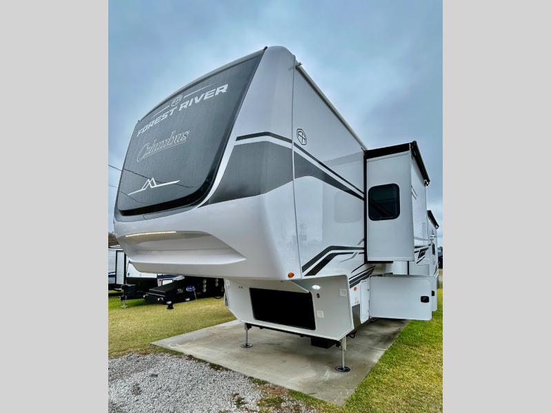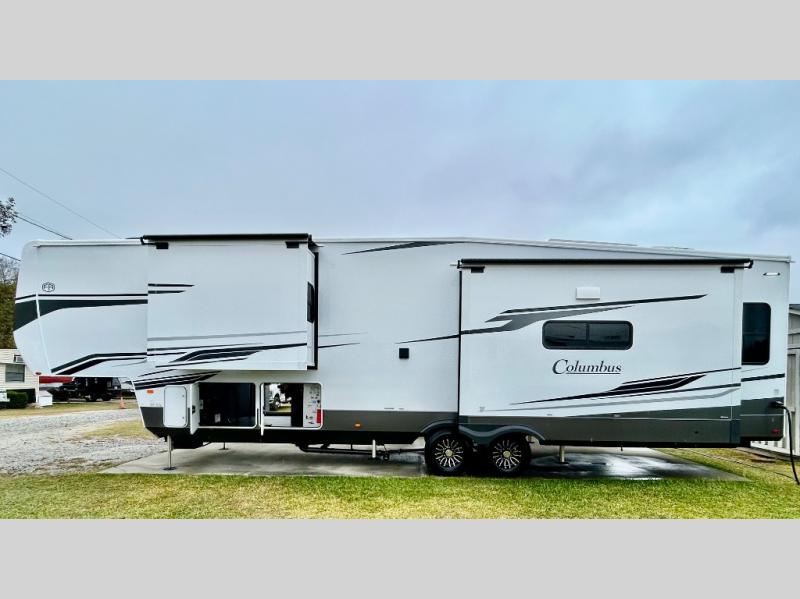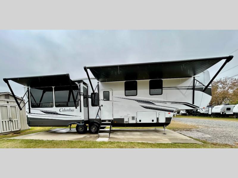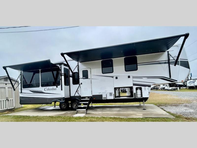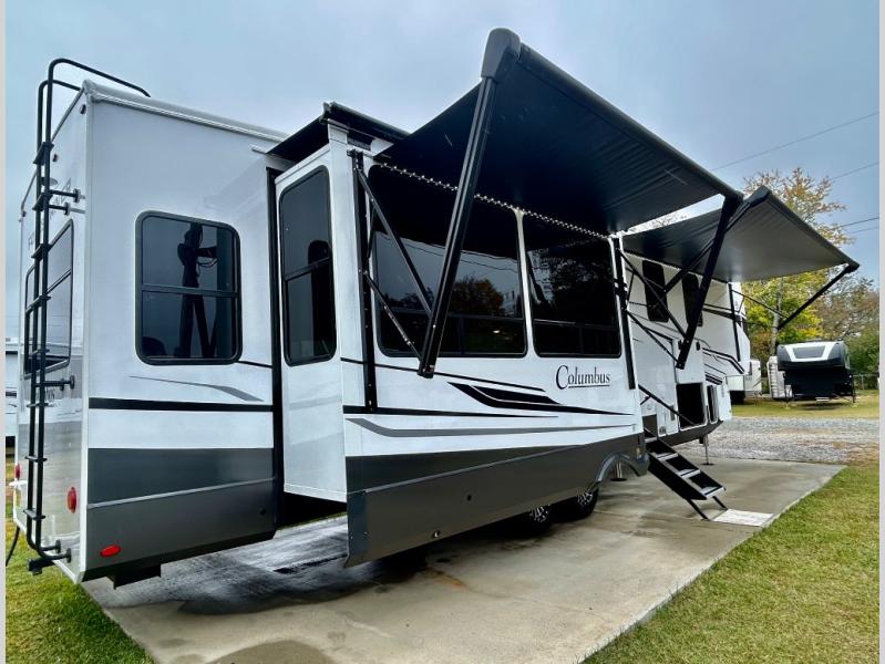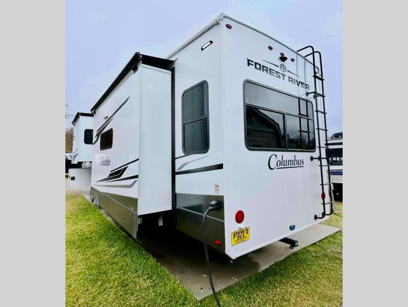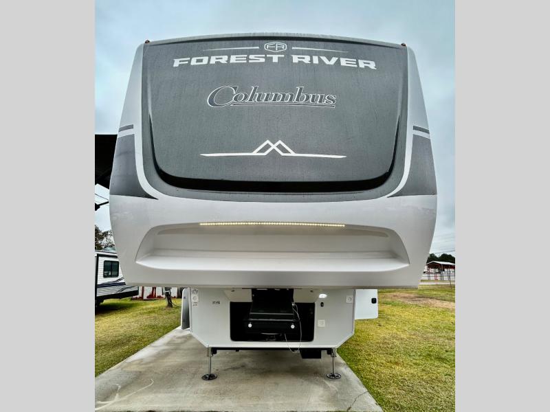 Experience a different camping life with residential furnishings and high-end features in each one of these Forest River Columbus fifth wheels! Durable construction begins with a 101" wide body, an all-welded aluminum frame superstructure, and high-gloss fiberglass vacuum bonded walls and slide out ends with dual Azdel. You will appreciate the Lippert axles, MORryde CRE 3000 suspension system, and 16" wheels with nitrogen-filled tires for a smooth tow from home to campground. Additional exterior features include a tire pressure monitoring system, a heated utility convenience center, an outside sprayer, and slam latch on all the storage doors. Inside, you'll be met with many luxurious amenities, including residential style crown molding throughout, roller day/night shades, upgraded true solid surface countertops in the bath and kitchen, plus solid wood steps.