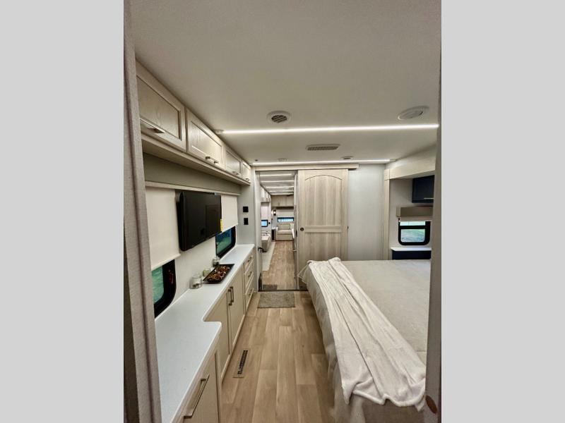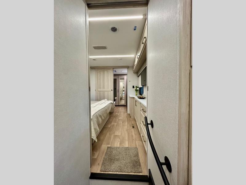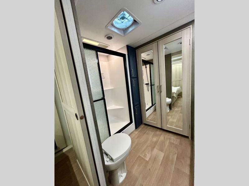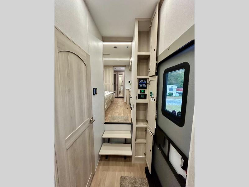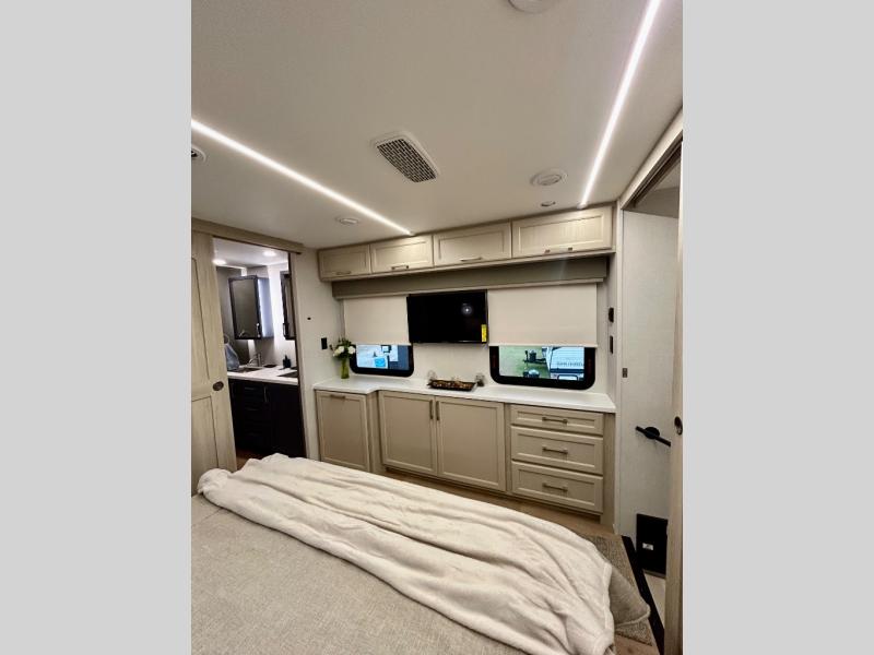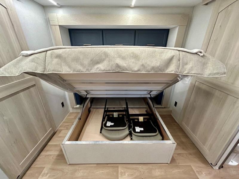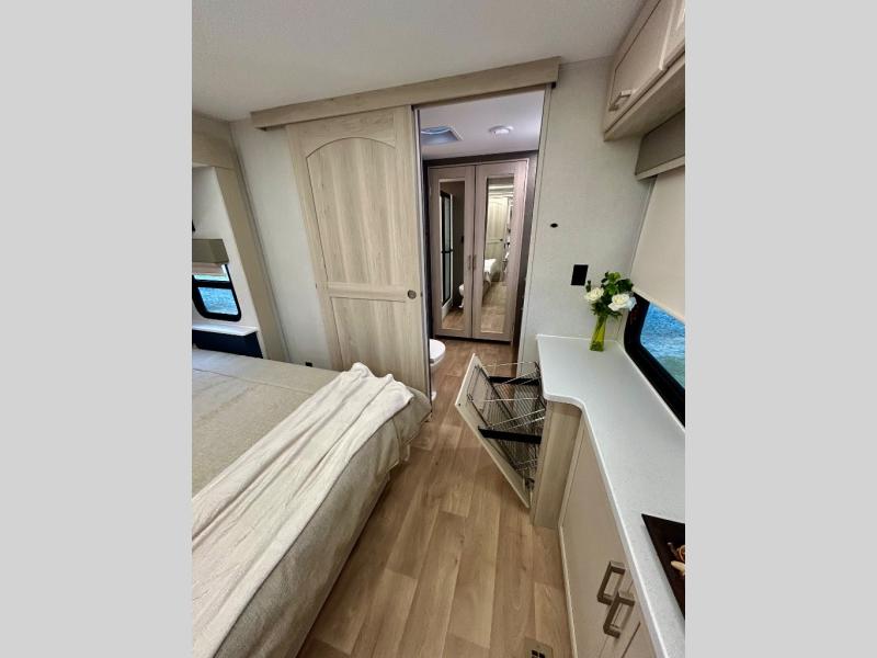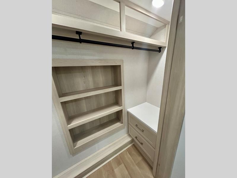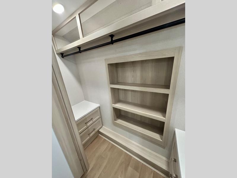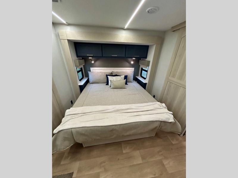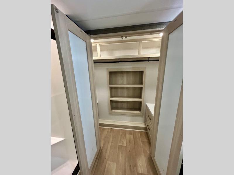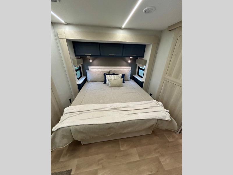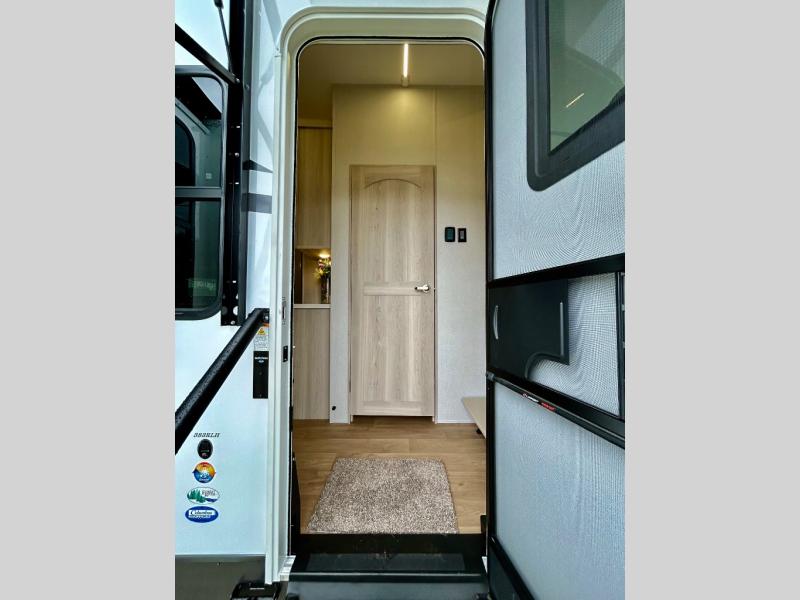 Experience a different camping life with residential furnishings and high-end features in each one of these Forest River Columbus fifth wheels! Durable construction begins with a 101" wide body, an all-welded aluminum frame superstructure, and high-gloss fiberglass vacuum bonded walls and slide out ends with dual Azdel. You will appreciate the Lippert axles, MORryde CRE 3000 suspension system, and 16" wheels with nitrogen-filled tires for a smooth tow from home to campground. Additional exterior features include a tire pressure monitoring system, a heated utility convenience center, an outside sprayer, and slam latch on all the storage doors. Inside, you'll be met with many luxurious amenities, including residential style crown molding throughout, roller day/night shades, upgraded true solid surface countertops in the bath and kitchen, plus solid wood steps.