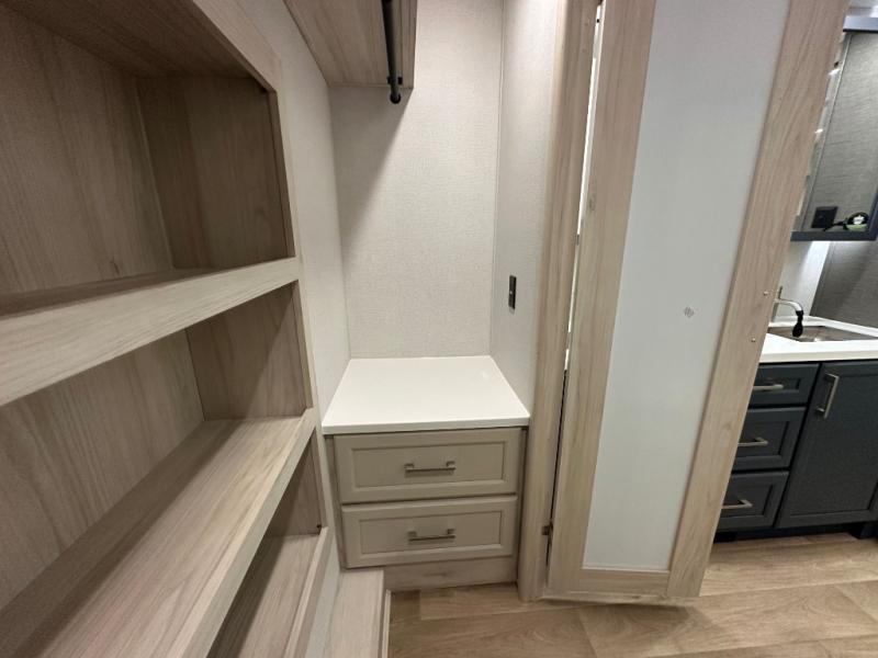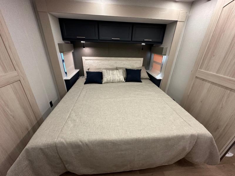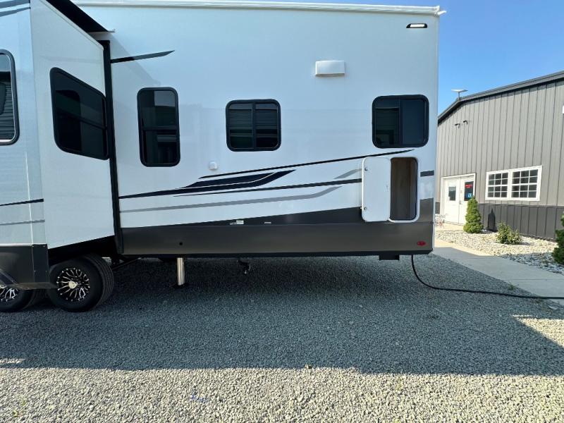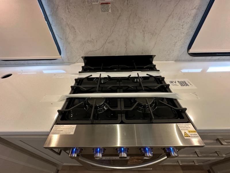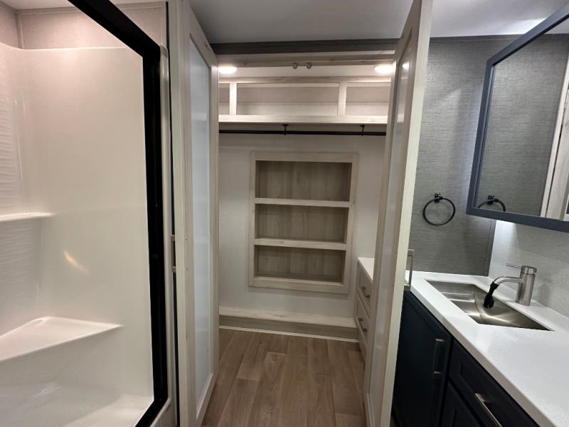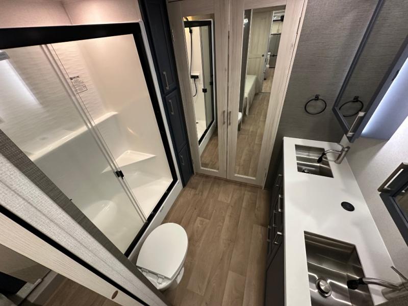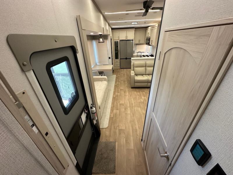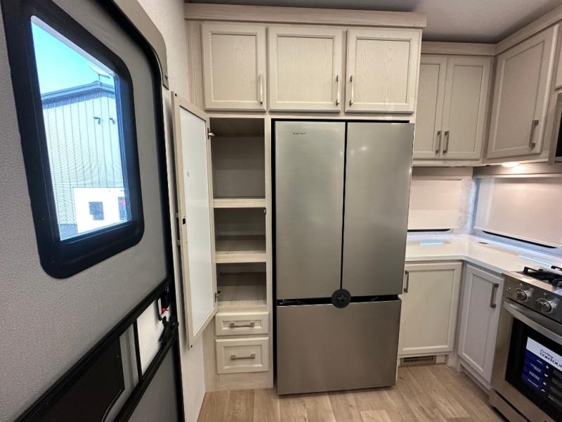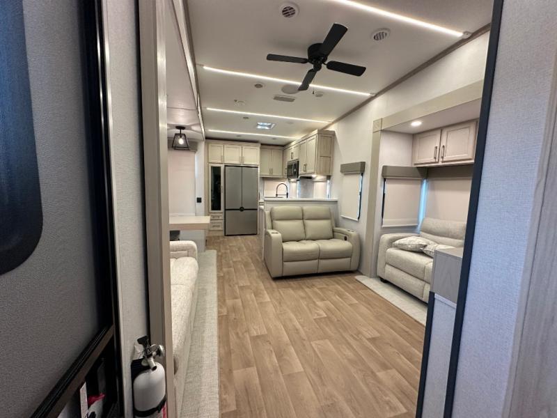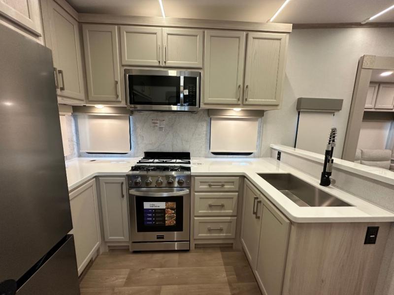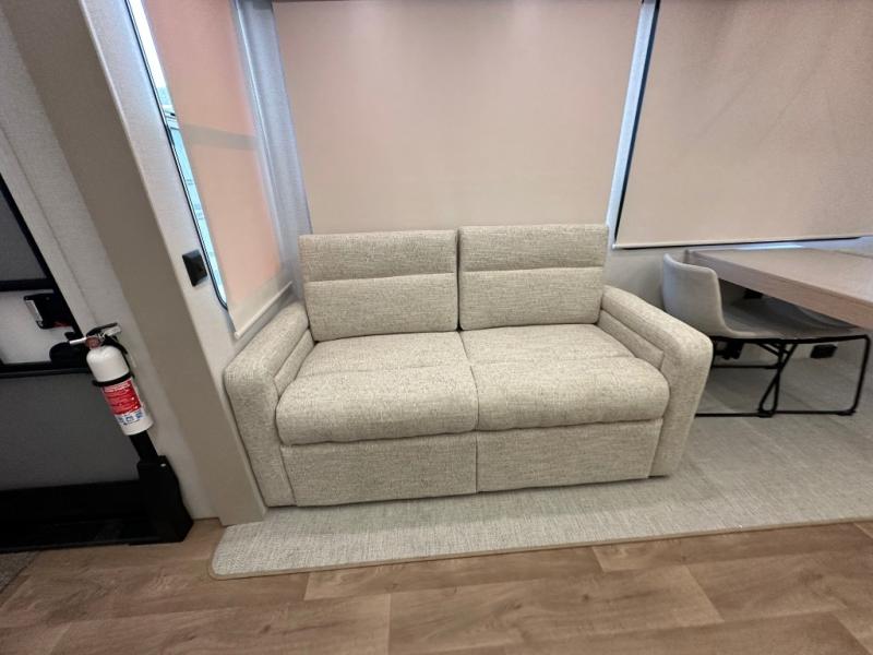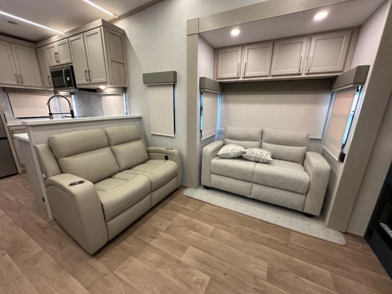 You won't believe all that this fifth wheel has to offer! Starting with the rear kitchen which has plenty of countertop space to prepare your delicious meals, a gas cooktop with a stainless steel 24" oven to cook them, and a large single bowl stainless steel sink for easy clean up. The living area has opposing sofas and a theater seat with USB charging and storage across from an entertainment center with 50" Smart TV. The half bathroom is close to the living area so you can get back to watching your movie faster. You will feel right at home sleeping in the master suite on a slide out king bed across from a dresser and hamper to keep your space tidy, plus entrance into the front full bathroom. Inside the bathroom, you will find a vanity with dual sinks for two to get ready at once, a spacious shower with a seat, and a walk-in closet for clothes, shoes, and more!
