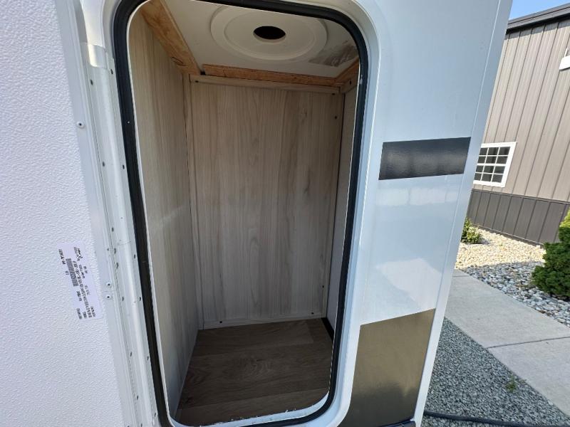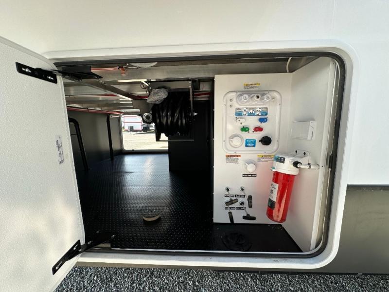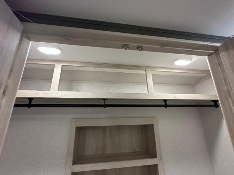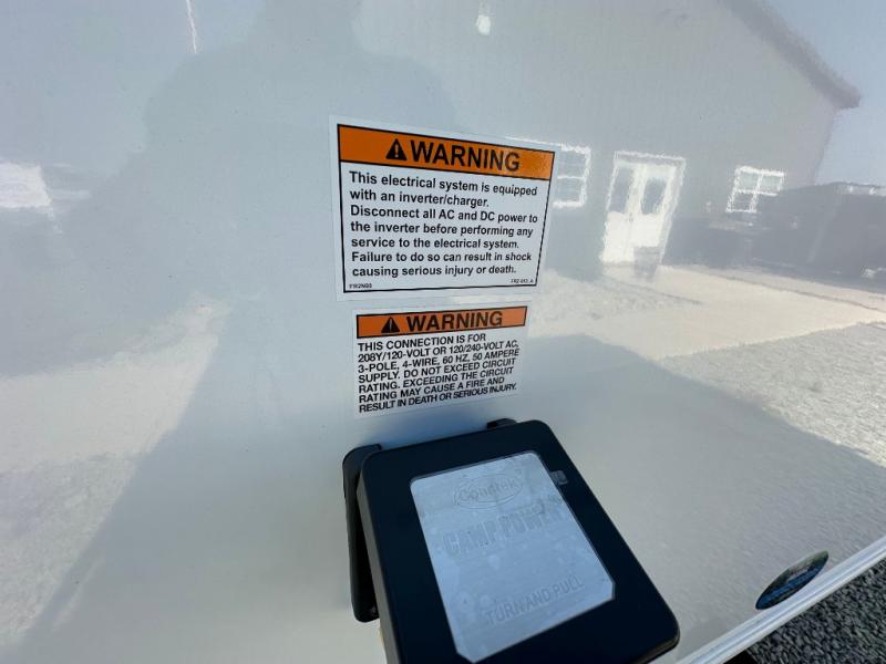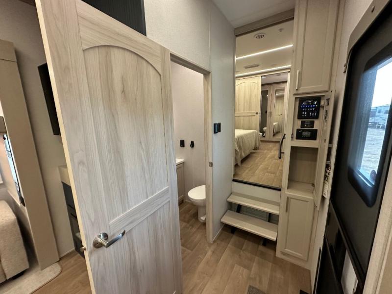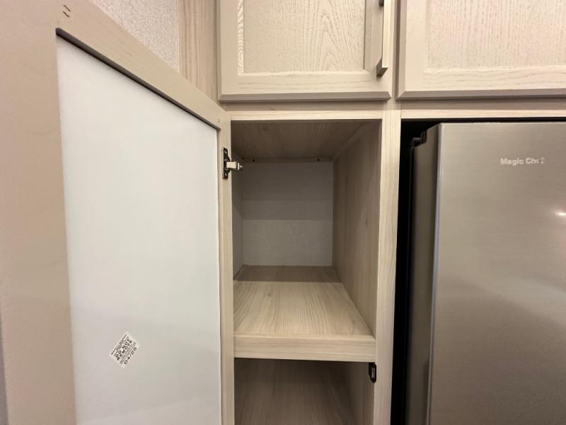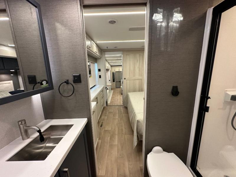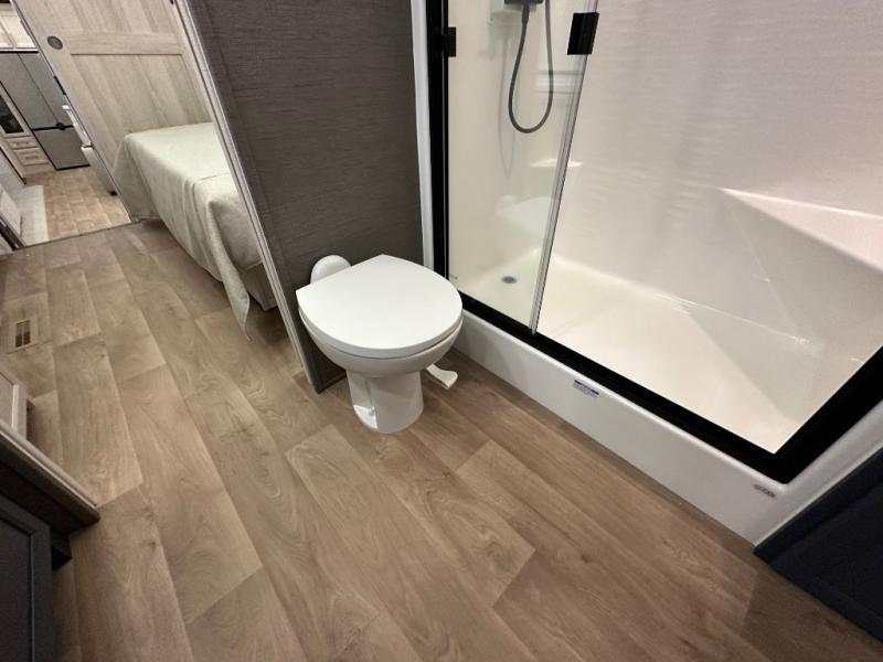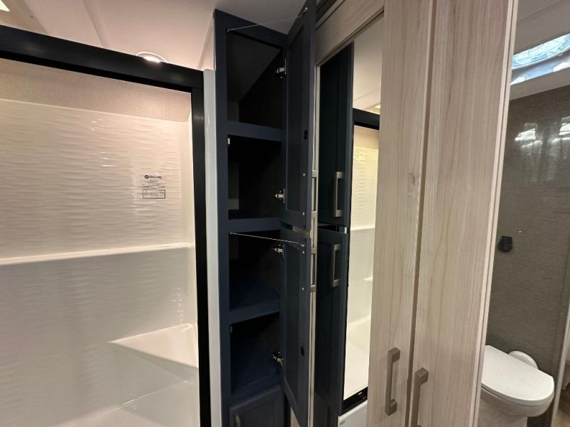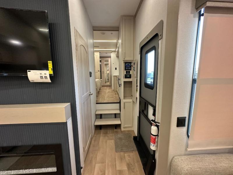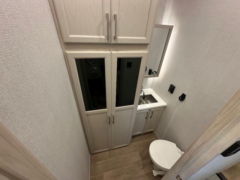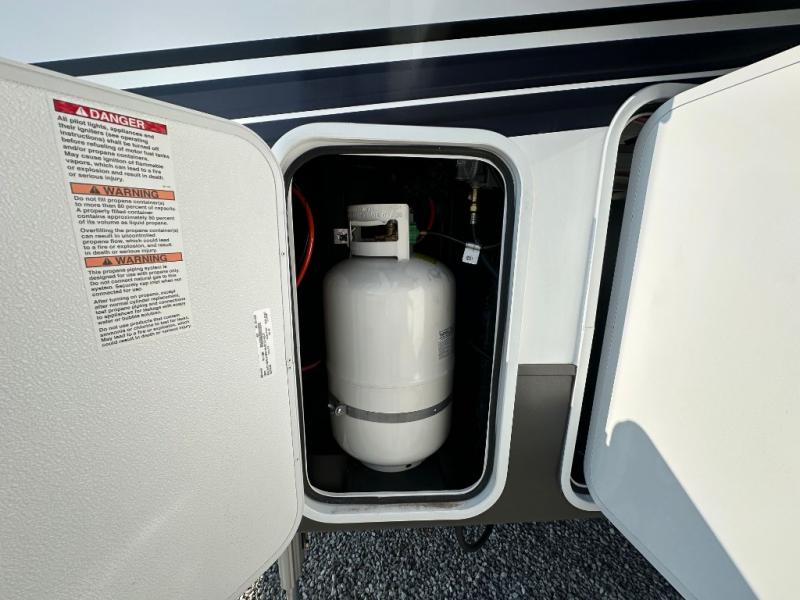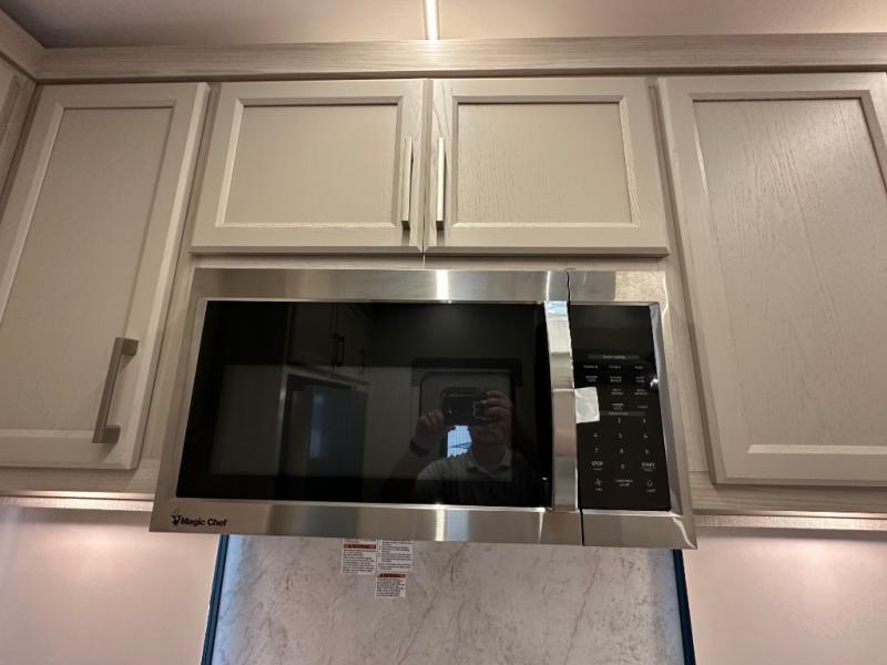 You won't believe all that this fifth wheel has to offer! Starting with the rear kitchen which has plenty of countertop space to prepare your delicious meals, a gas cooktop with a stainless steel 24" oven to cook them, and a large single bowl stainless steel sink for easy clean up. The living area has opposing sofas and a theater seat with USB charging and storage across from an entertainment center with 50" Smart TV. The half bathroom is close to the living area so you can get back to watching your movie faster. You will feel right at home sleeping in the master suite on a slide out king bed across from a dresser and hamper to keep your space tidy, plus entrance into the front full bathroom. Inside the bathroom, you will find a vanity with dual sinks for two to get ready at once, a spacious shower with a seat, and a walk-in closet for clothes, shoes, and more!