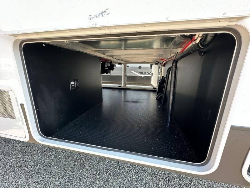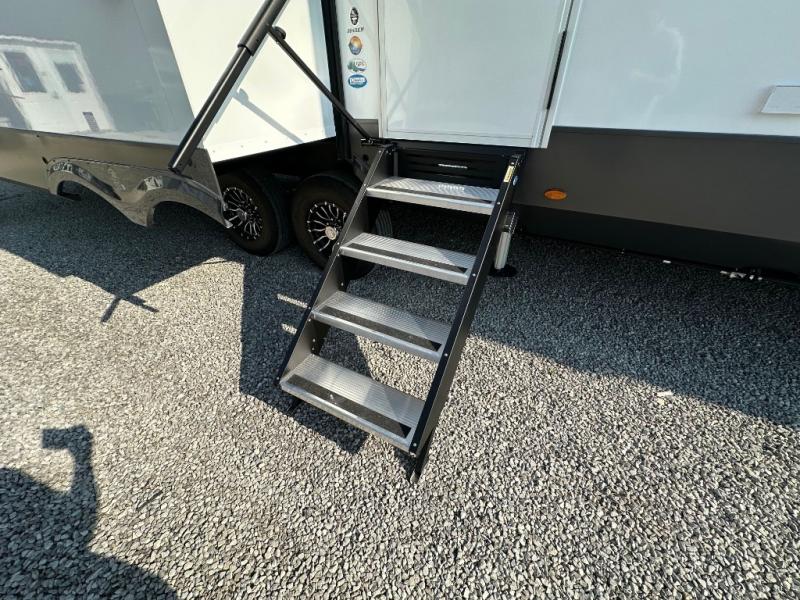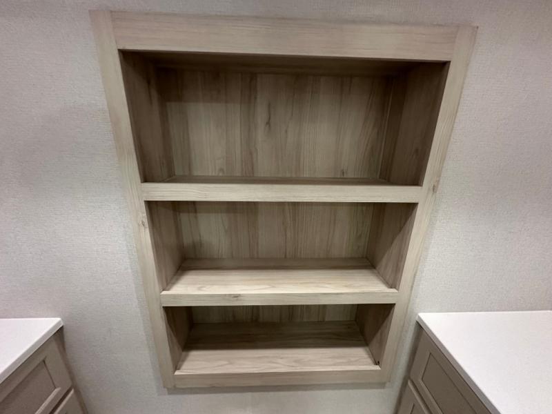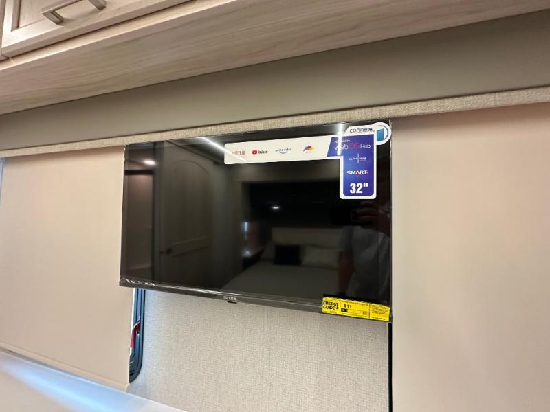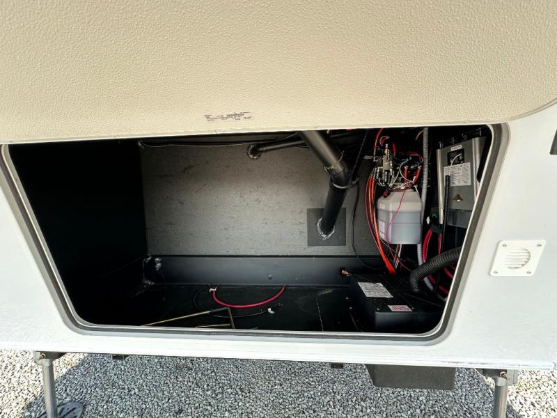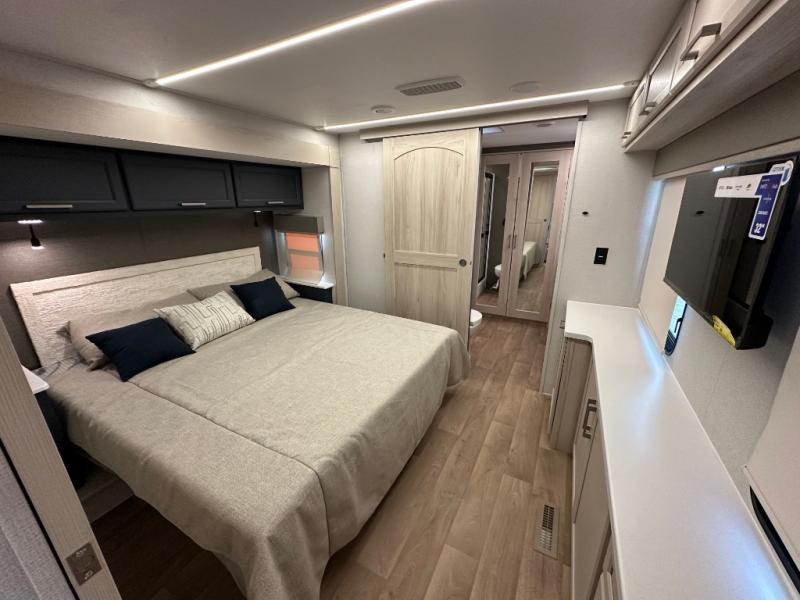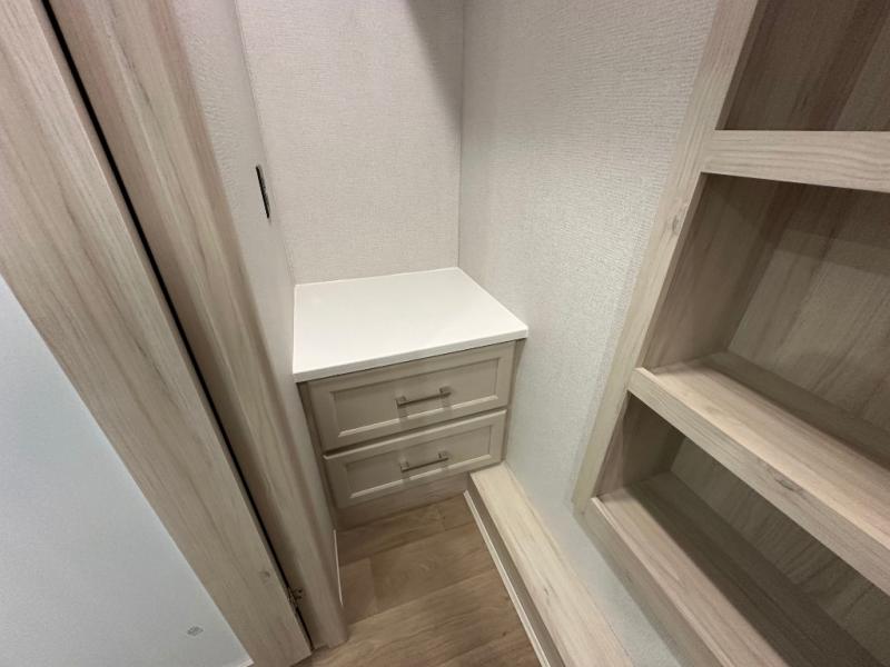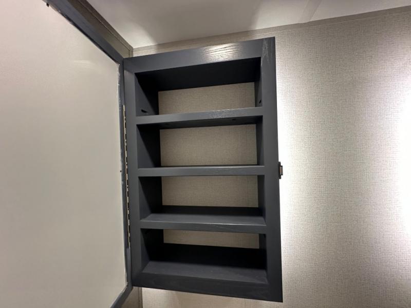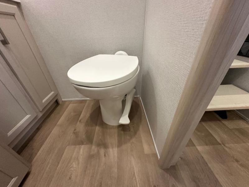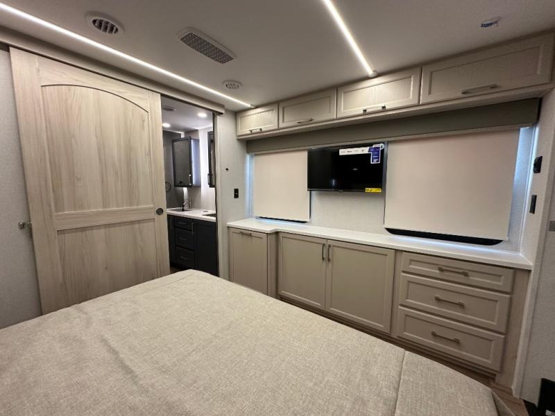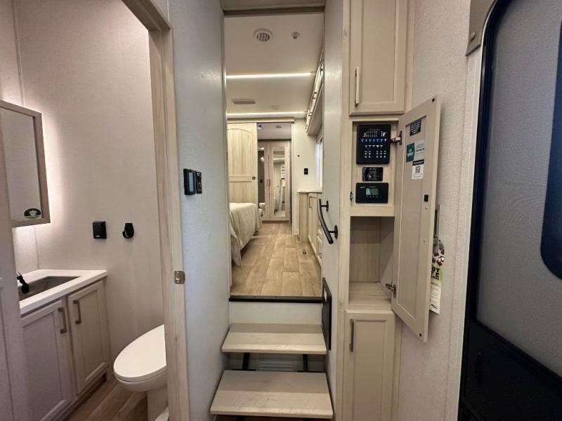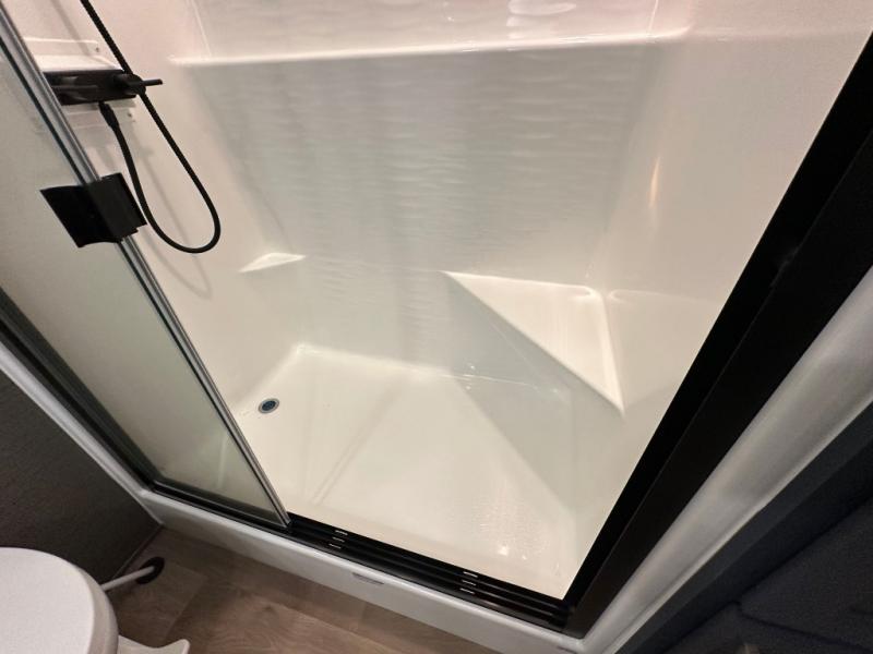 You won't believe all that this fifth wheel has to offer! Starting with the rear kitchen which has plenty of countertop space to prepare your delicious meals, a gas cooktop with a stainless steel 24" oven to cook them, and a large single bowl stainless steel sink for easy clean up. The living area has opposing sofas and a theater seat with USB charging and storage across from an entertainment center with 50" Smart TV. The half bathroom is close to the living area so you can get back to watching your movie faster. You will feel right at home sleeping in the master suite on a slide out king bed across from a dresser and hamper to keep your space tidy, plus entrance into the front full bathroom. Inside the bathroom, you will find a vanity with dual sinks for two to get ready at once, a spacious shower with a seat, and a walk-in closet for clothes, shoes, and more!