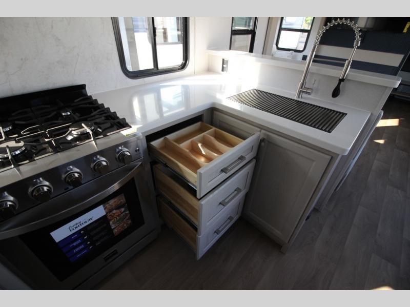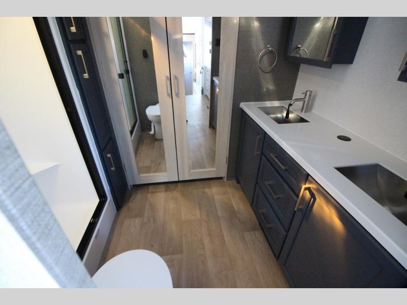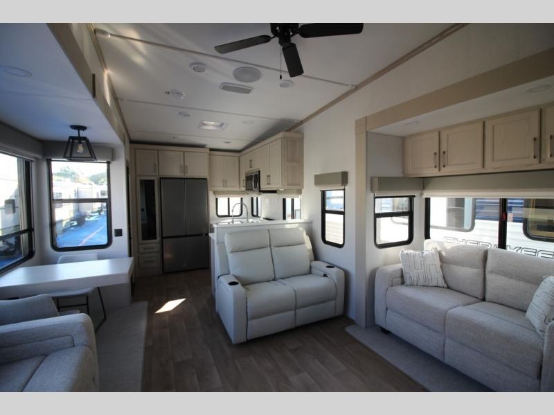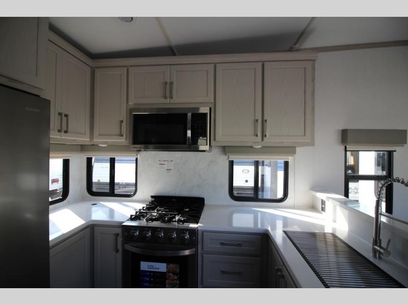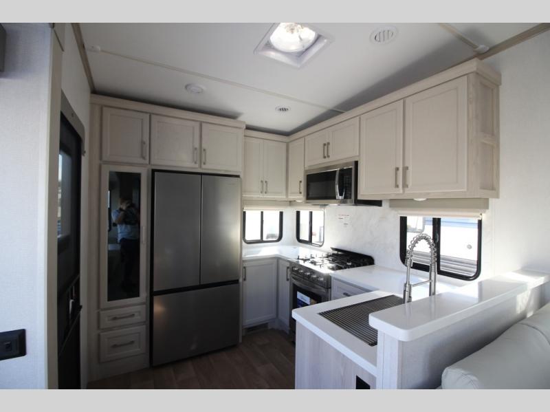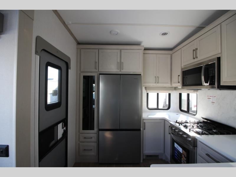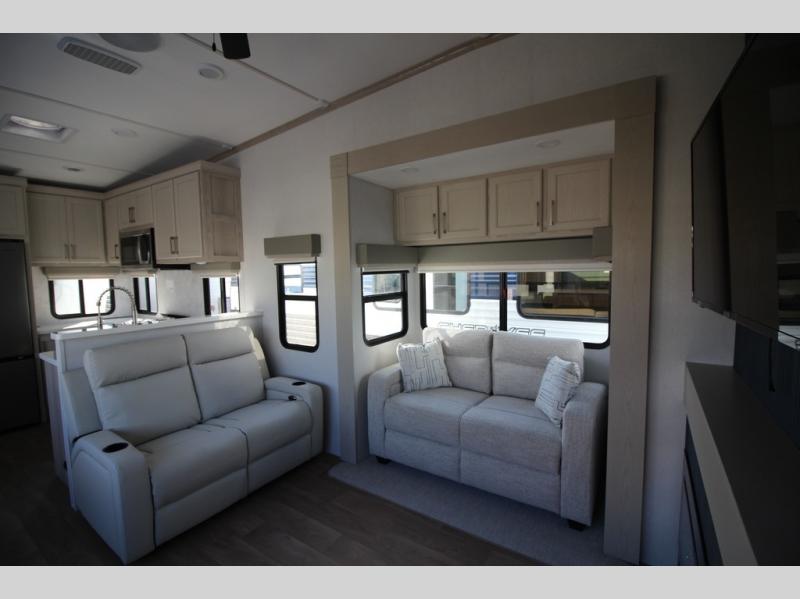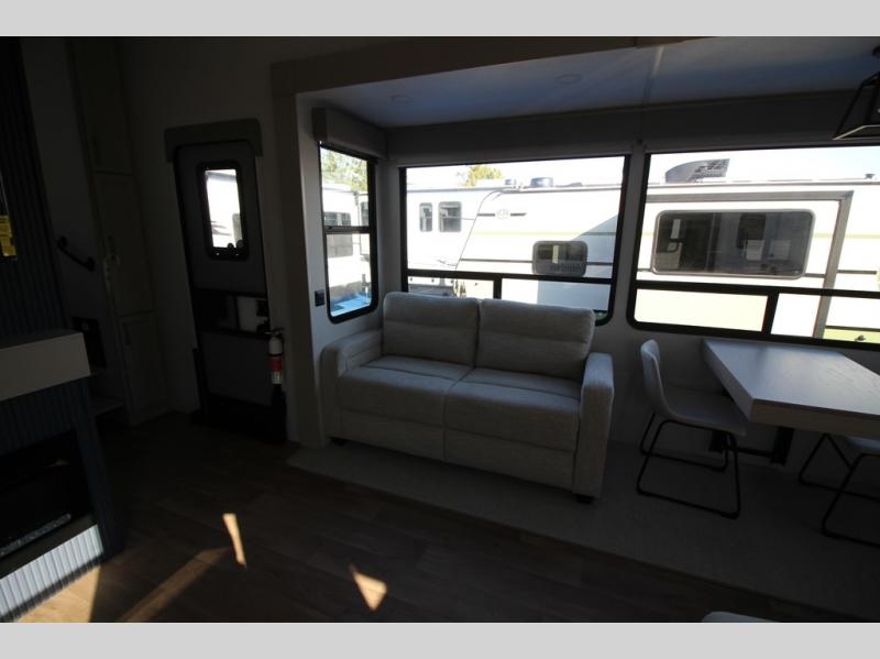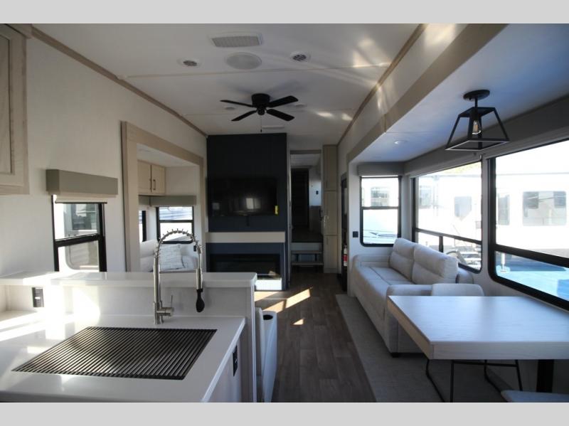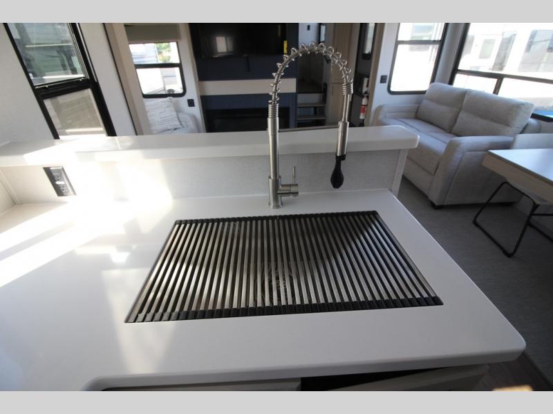 You won't believe all that this fifth wheel has to offer! Starting with the rear kitchen which has plenty of countertop space to prepare your delicious meals, a gas cooktop with a stainless steel 24" oven to cook them, and a large single bowl stainless steel sink for easy clean up. The living area has opposing sofas and a theater seat with USB charging and storage across from an entertainment center with 50" Smart TV. The half bathroom is close to the living area so you can get back to watching your movie faster. You will feel right at home sleeping in the master suite on a slide out king bed across from a dresser and hamper to keep your space tidy, plus entrance into the front full bathroom. Inside the bathroom, you will find a vanity with dual sinks for two to get ready at once, a spacious shower with a seat, and a walk-in closet for clothes, shoes, and more!