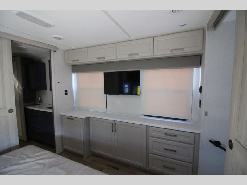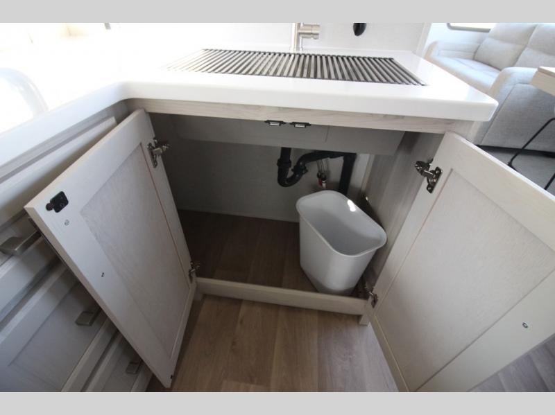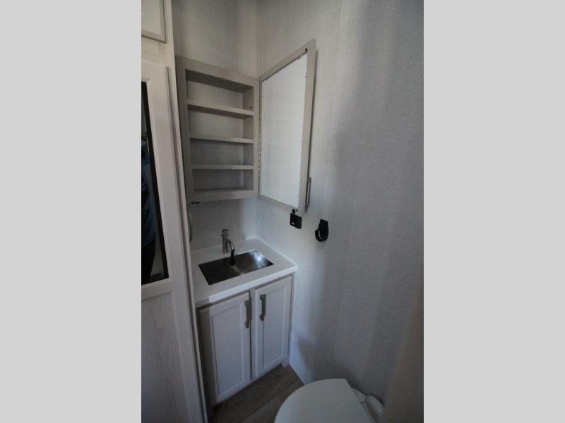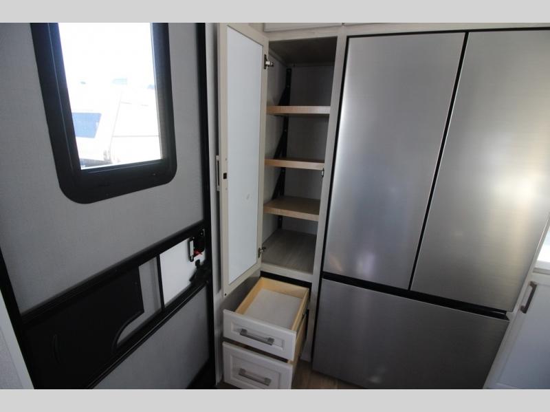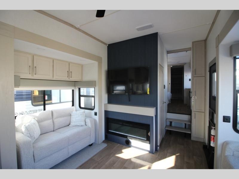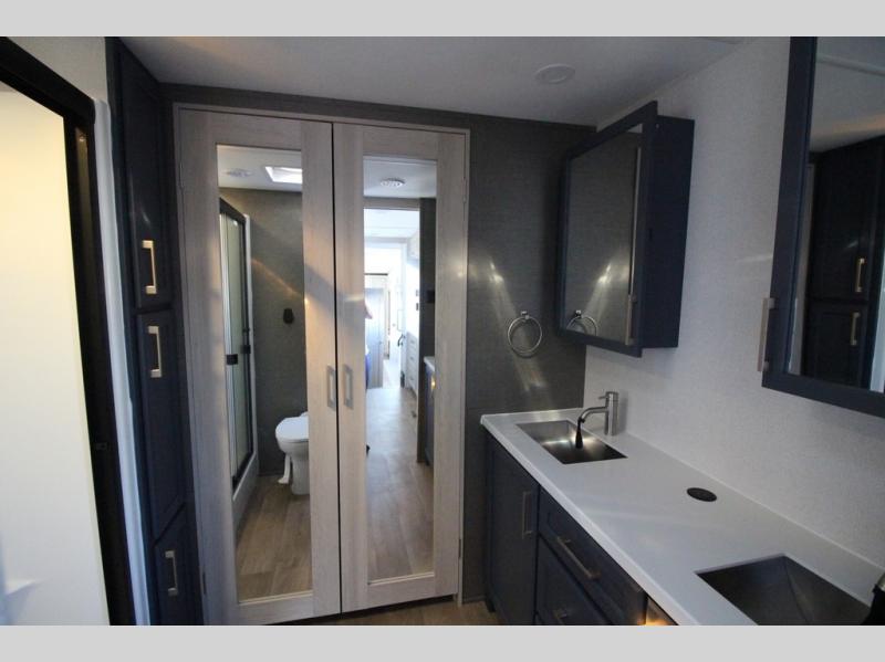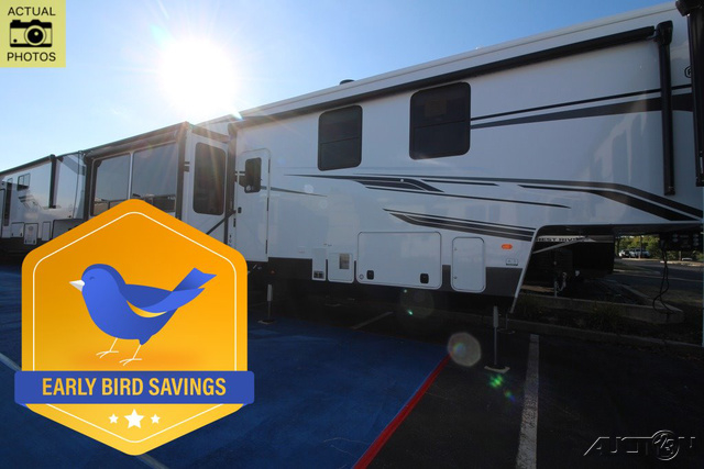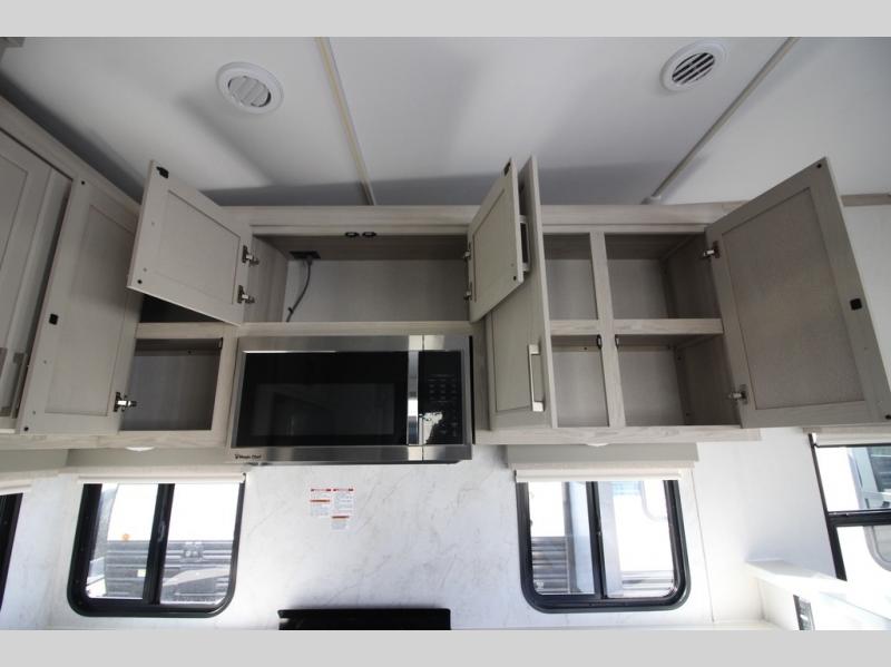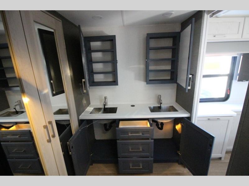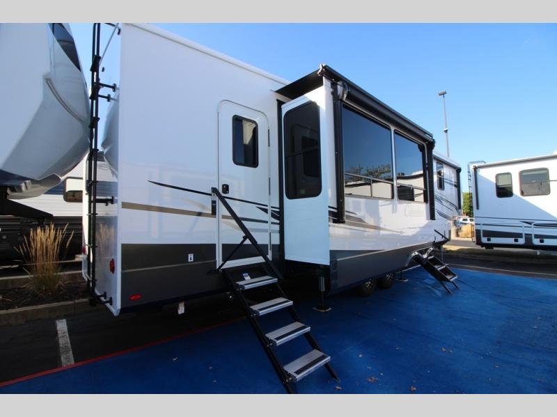 You won't believe all that this fifth wheel has to offer! Starting with the rear kitchen which has plenty of countertop space to prepare your delicious meals, a gas cooktop with a stainless steel 24" oven to cook them, and a large single bowl stainless steel sink for easy clean up. The living area has opposing sofas and a theater seat with USB charging and storage across from an entertainment center with 50" Smart TV. The half bathroom is close to the living area so you can get back to watching your movie faster. You will feel right at home sleeping in the master suite on a slide out king bed across from a dresser and hamper to keep your space tidy, plus entrance into the front full bathroom. Inside the bathroom, you will find a vanity with dual sinks for two to get ready at once, a spacious shower with a seat, and a walk-in closet for clothes, shoes, and more!