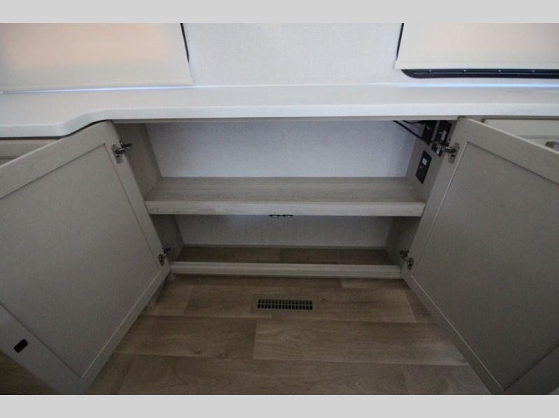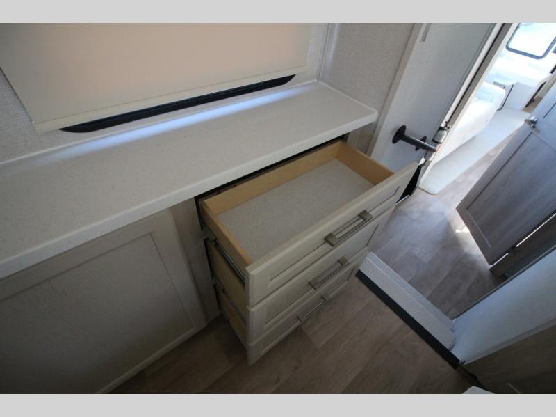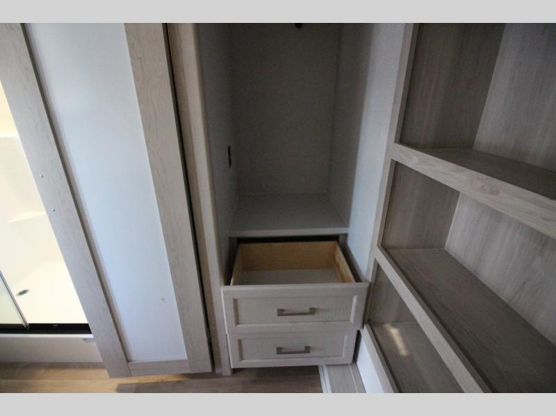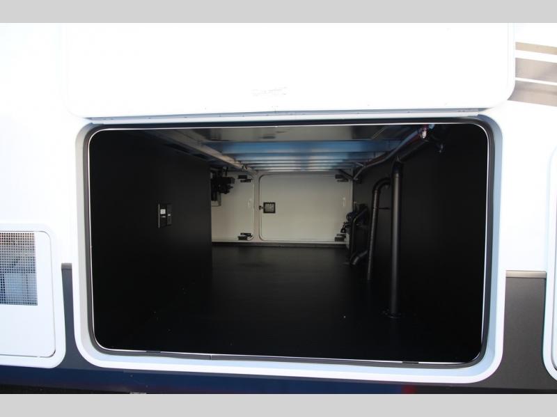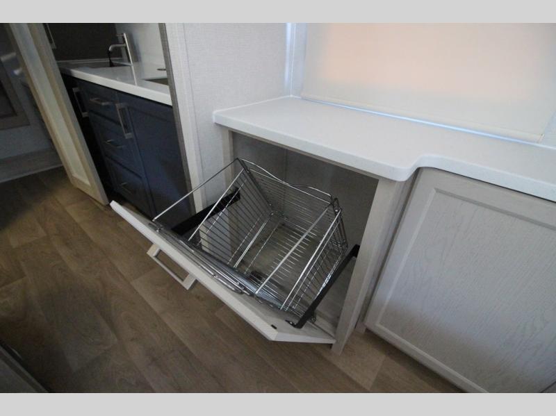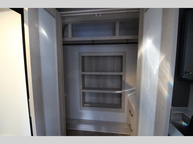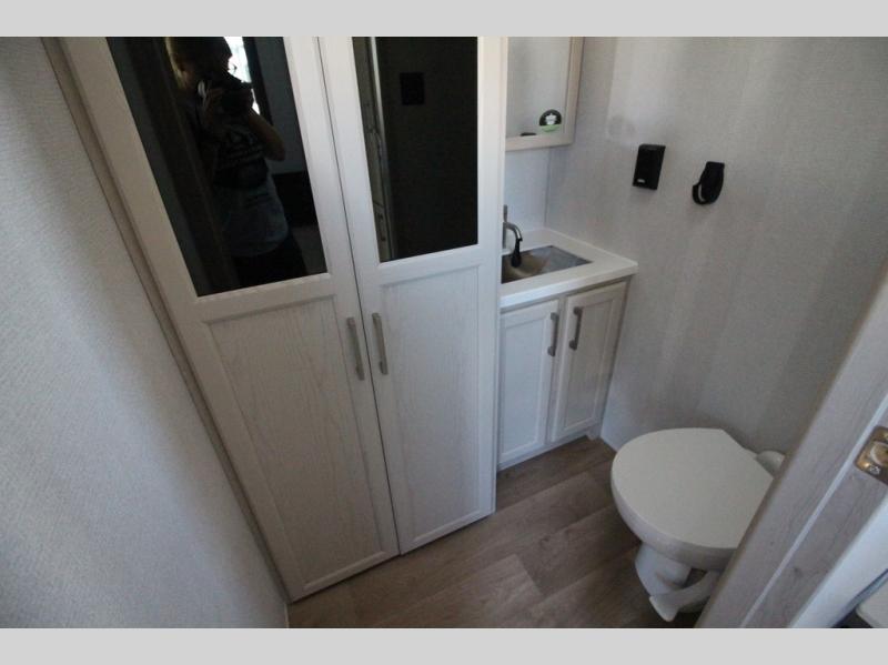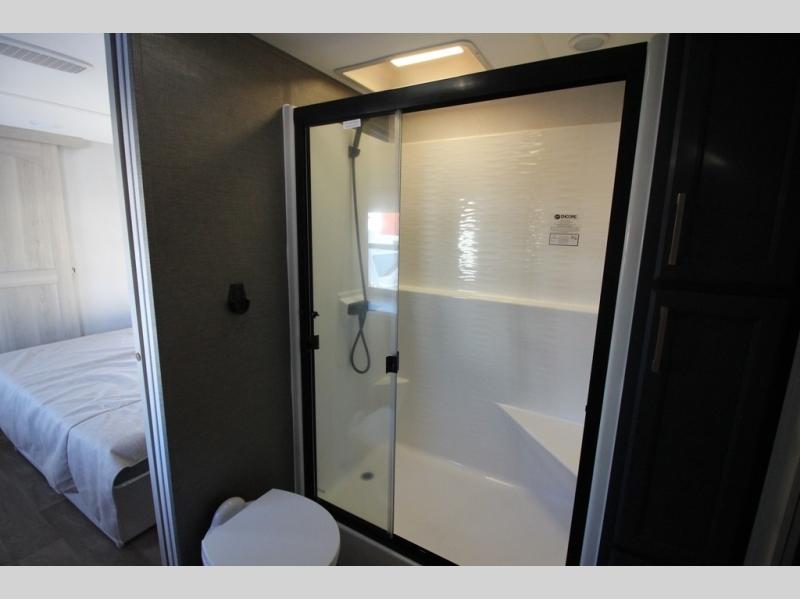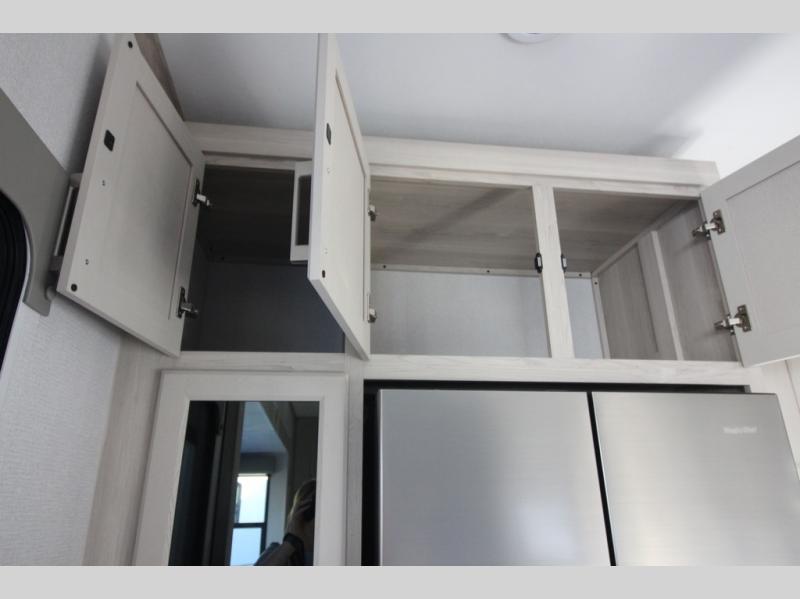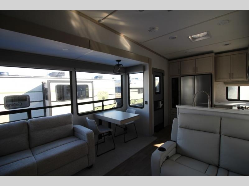 You won't believe all that this fifth wheel has to offer! Starting with the rear kitchen which has plenty of countertop space to prepare your delicious meals, a gas cooktop with a stainless steel 24" oven to cook them, and a large single bowl stainless steel sink for easy clean up. The living area has opposing sofas and a theater seat with USB charging and storage across from an entertainment center with 50" Smart TV. The half bathroom is close to the living area so you can get back to watching your movie faster. You will feel right at home sleeping in the master suite on a slide out king bed across from a dresser and hamper to keep your space tidy, plus entrance into the front full bathroom. Inside the bathroom, you will find a vanity with dual sinks for two to get ready at once, a spacious shower with a seat, and a walk-in closet for clothes, shoes, and more!