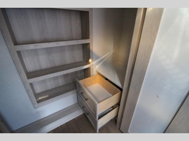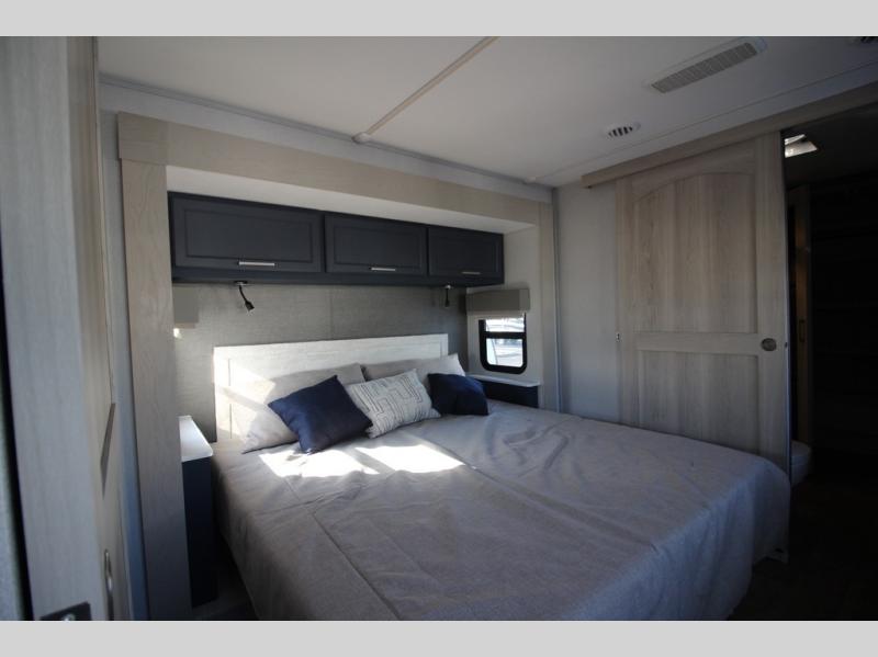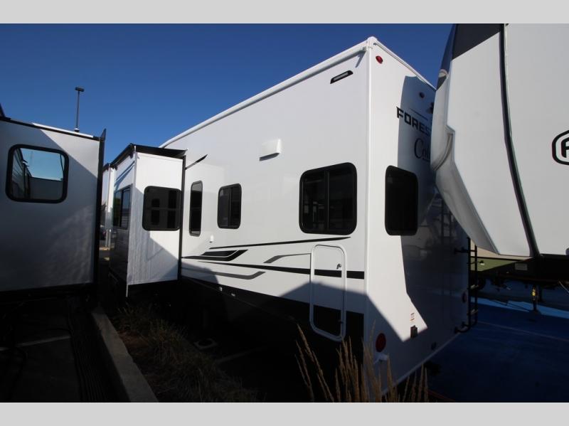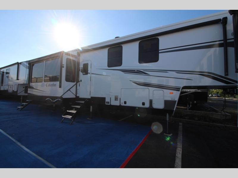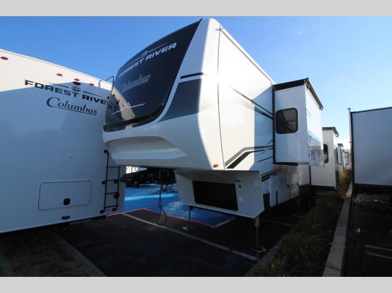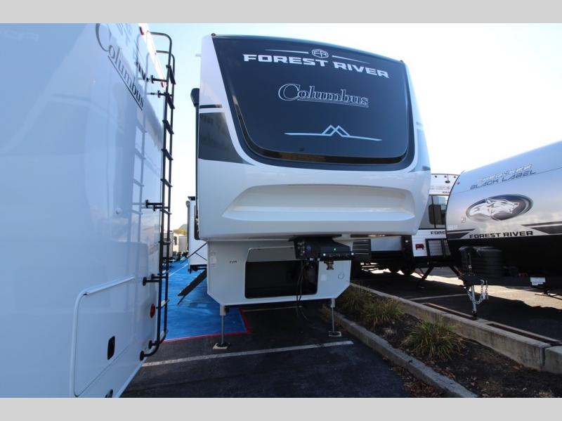 Experience a different camping life with residential furnishings and high-end features in each one of these Forest River Columbus fifth wheels! Durable construction begins with a 101" wide body, an all-welded aluminum frame superstructure, and high-gloss fiberglass vacuum bonded walls and slide out ends with dual Azdel. You will appreciate the Lippert axles, MORryde CRE 3000 suspension system, and 16" wheels with nitrogen-filled tires for a smooth tow from home to campground. Additional exterior features include a tire pressure monitoring system, a heated utility convenience center, an outside sprayer, and slam latch on all the storage doors. Inside, you'll be met with many luxurious amenities, including residential style crown molding throughout, roller day/night shades, upgraded true solid surface countertops in the bath and kitchen, plus solid wood steps.