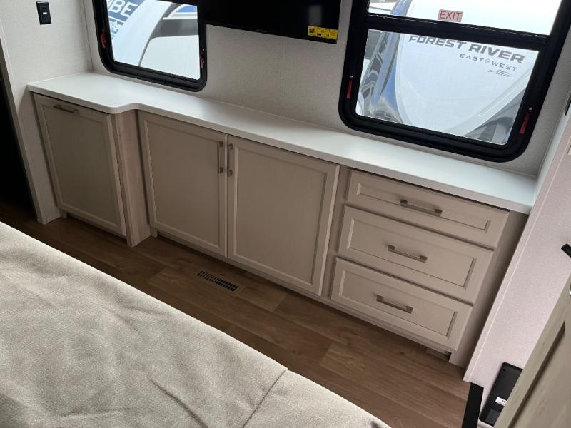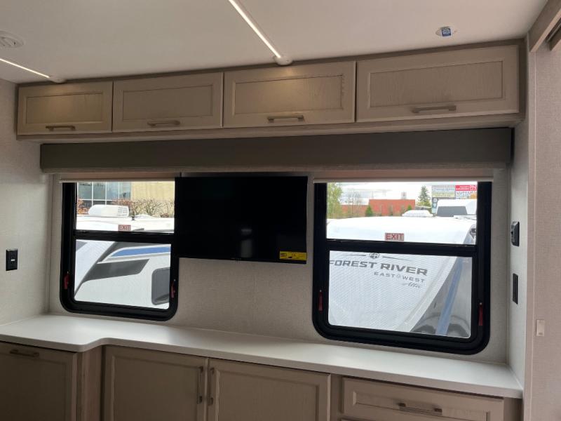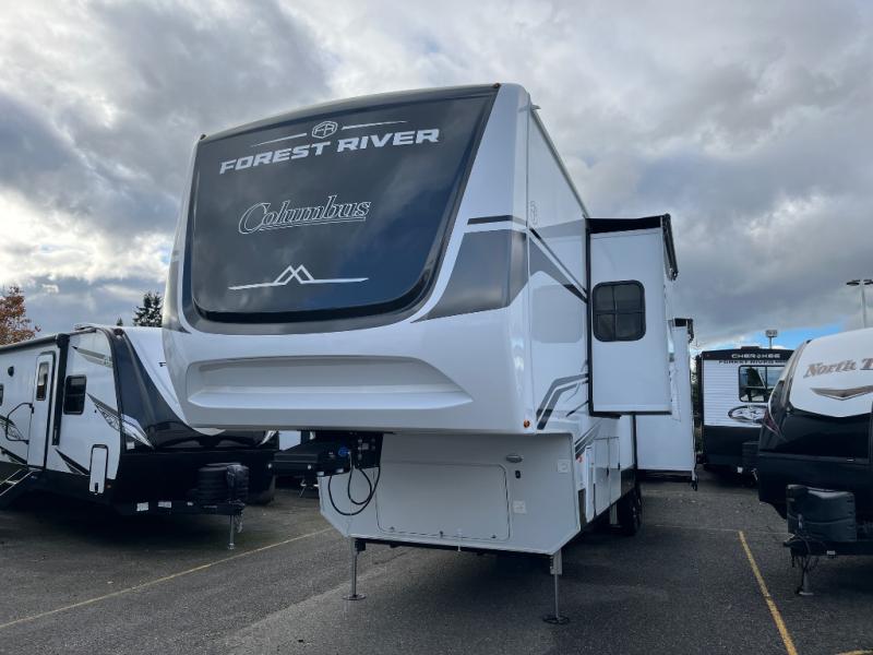 Experience a different camping life with residential furnishings and high-end features in each one of these Forest River Columbus fifth wheels! Durable construction begins with a 101" wide body, an all-welded aluminum frame superstructure, and high-gloss fiberglass vacuum bonded walls and slide out ends with dual Azdel. You will appreciate the Lippert axles, MORryde CRE 3000 suspension system, and 16" wheels with nitrogen-filled tires for a smooth tow from home to campground. Additional exterior features include a tire pressure monitoring system, a heated utility convenience center, an outside sprayer, and slam latch on all the storage doors. Inside, you'll be met with many luxurious amenities, including residential style crown molding throughout, roller day/night shades, upgraded true solid surface countertops in the bath and kitchen, plus solid wood steps.