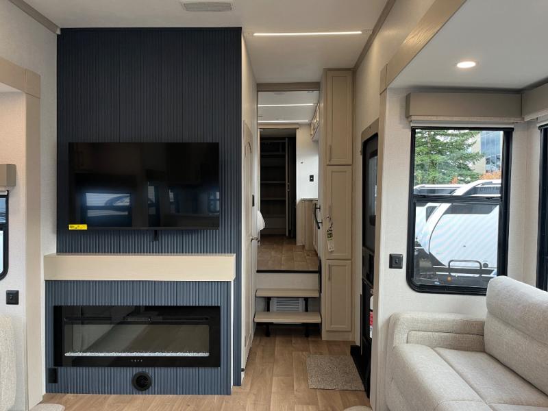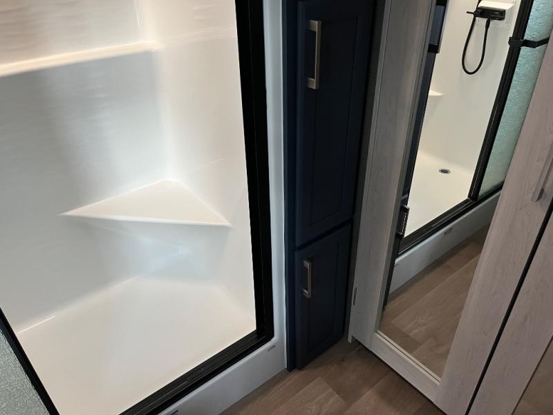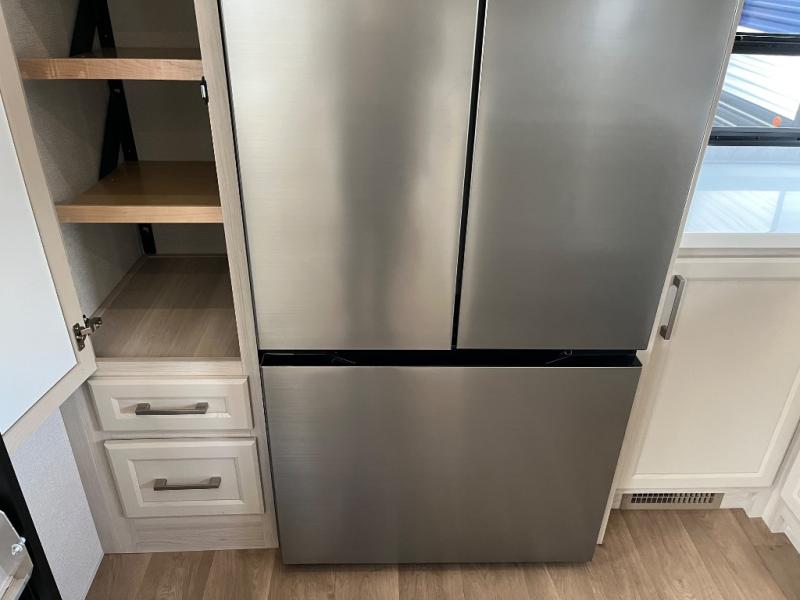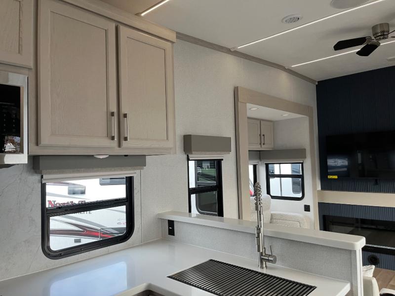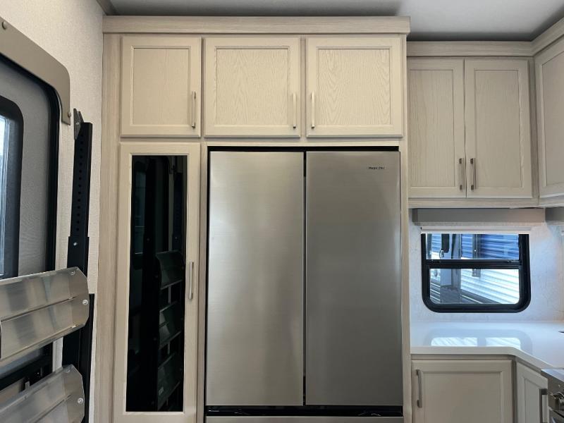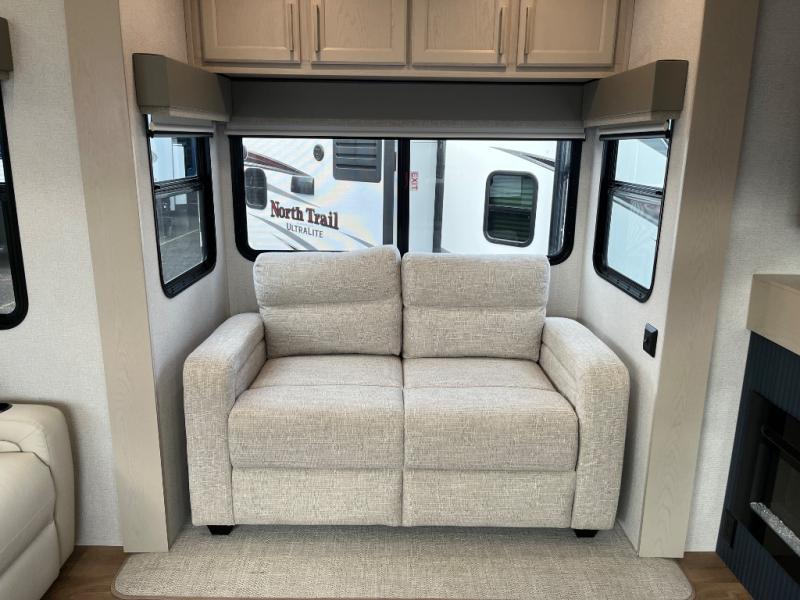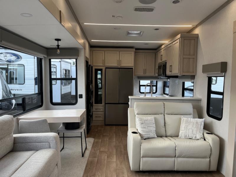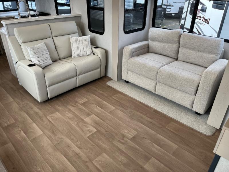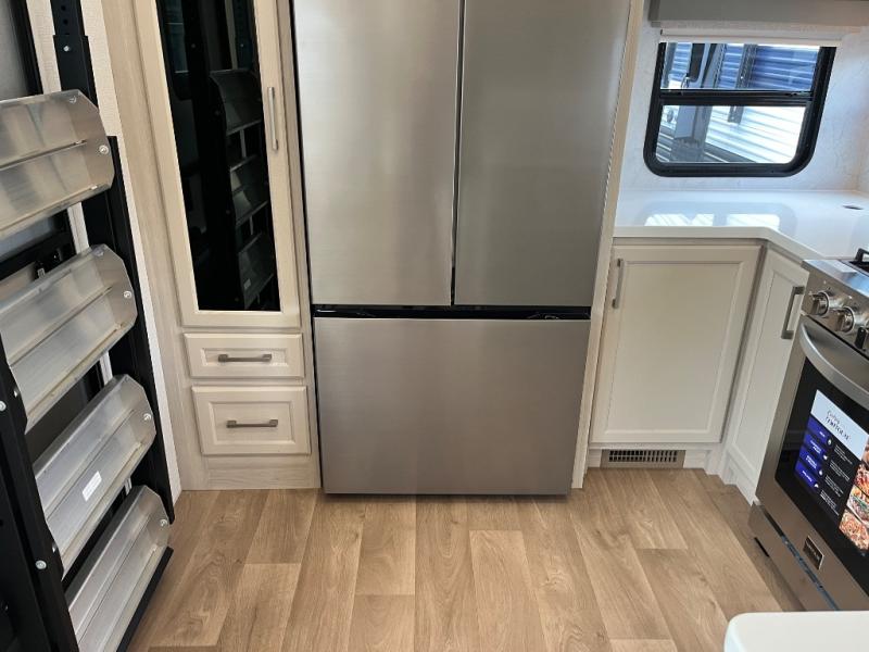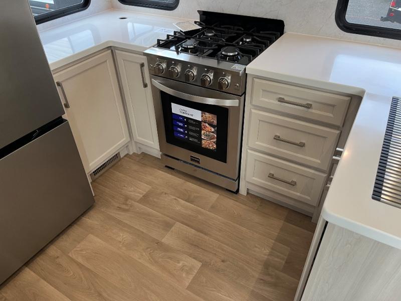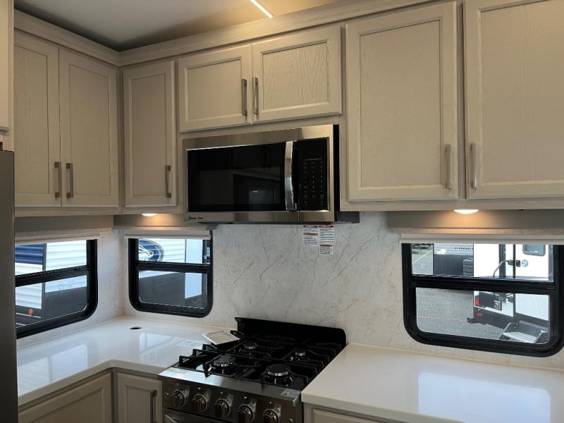 You won't believe all that this fifth wheel has to offer! Starting with the rear kitchen which has plenty of countertop space to prepare your delicious meals, a gas cooktop with a stainless steel 24" oven to cook them, and a large single bowl stainless steel sink for easy clean up. The living area has opposing sofas and a theater seat with USB charging and storage across from an entertainment center with 50" Smart TV. The half bathroom is close to the living area so you can get back to watching your movie faster. You will feel right at home sleeping in the master suite on a slide out king bed across from a dresser and hamper to keep your space tidy, plus entrance into the front full bathroom. Inside the bathroom, you will find a vanity with dual sinks for two to get ready at once, a spacious shower with a seat, and a walk-in closet for clothes, shoes, and more!