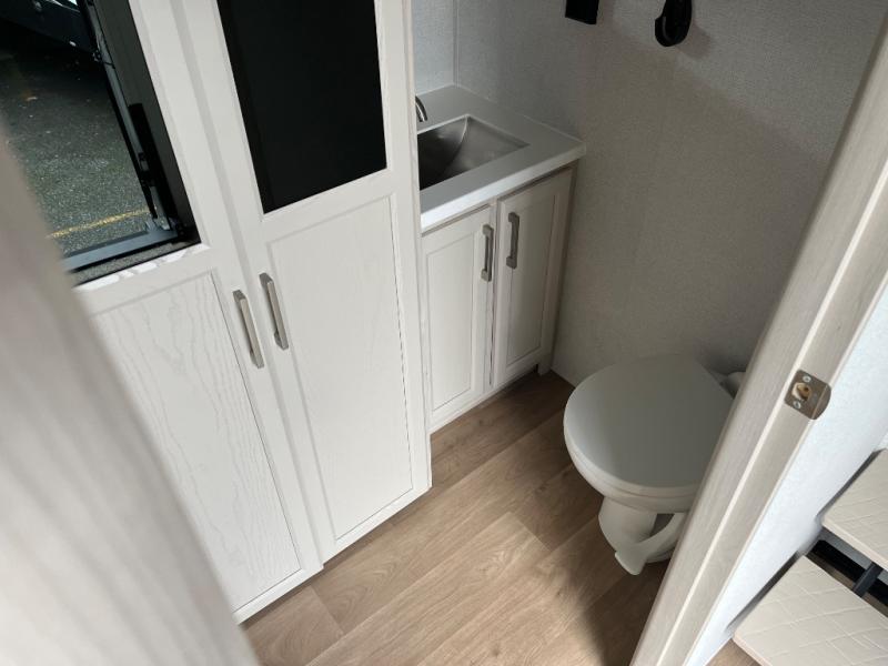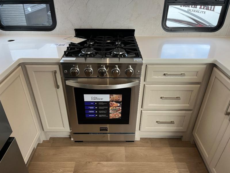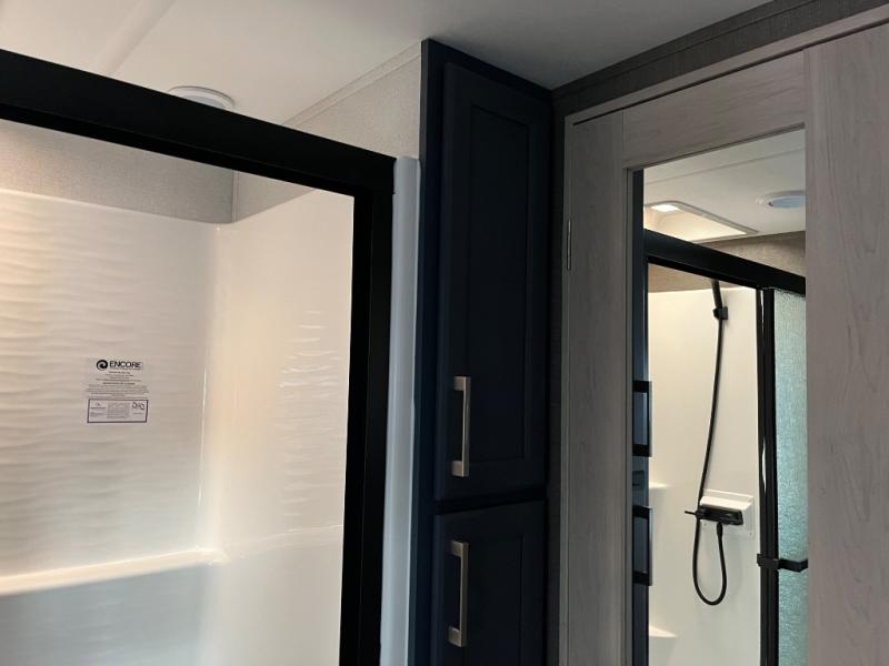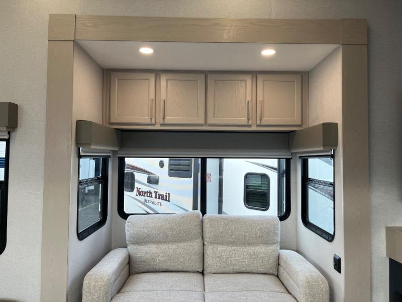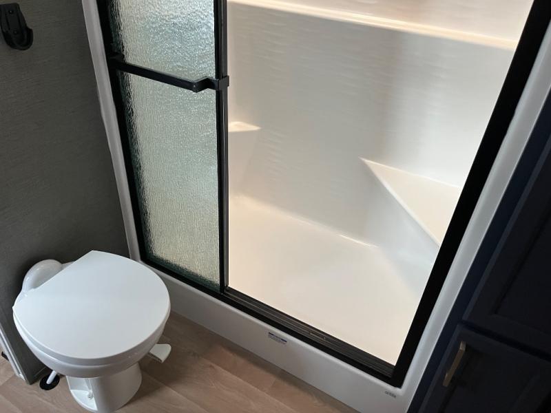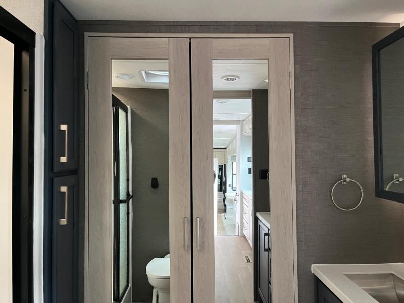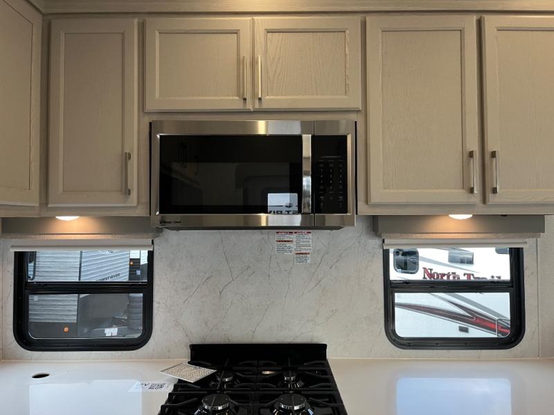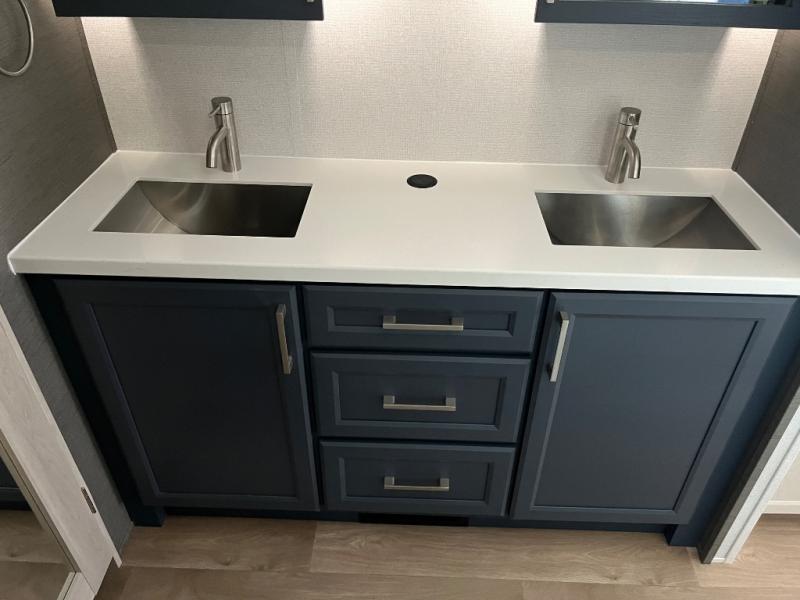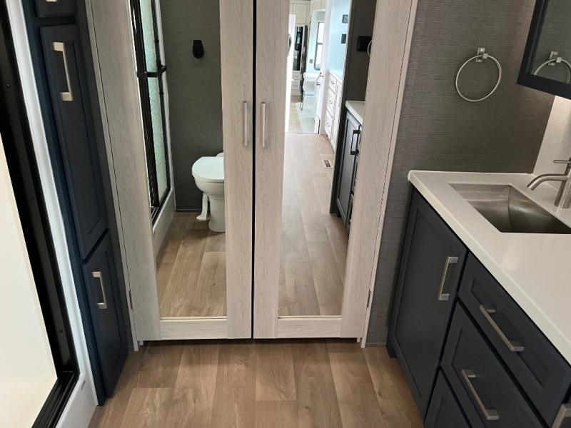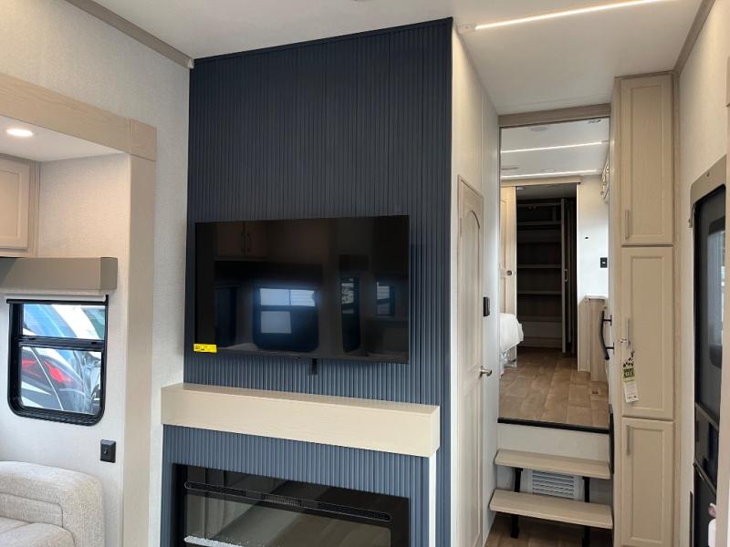 You won't believe all that this fifth wheel has to offer! Starting with the rear kitchen which has plenty of countertop space to prepare your delicious meals, a gas cooktop with a stainless steel 24" oven to cook them, and a large single bowl stainless steel sink for easy clean up. The living area has opposing sofas and a theater seat with USB charging and storage across from an entertainment center with 50" Smart TV. The half bathroom is close to the living area so you can get back to watching your movie faster. You will feel right at home sleeping in the master suite on a slide out king bed across from a dresser and hamper to keep your space tidy, plus entrance into the front full bathroom. Inside the bathroom, you will find a vanity with dual sinks for two to get ready at once, a spacious shower with a seat, and a walk-in closet for clothes, shoes, and more!