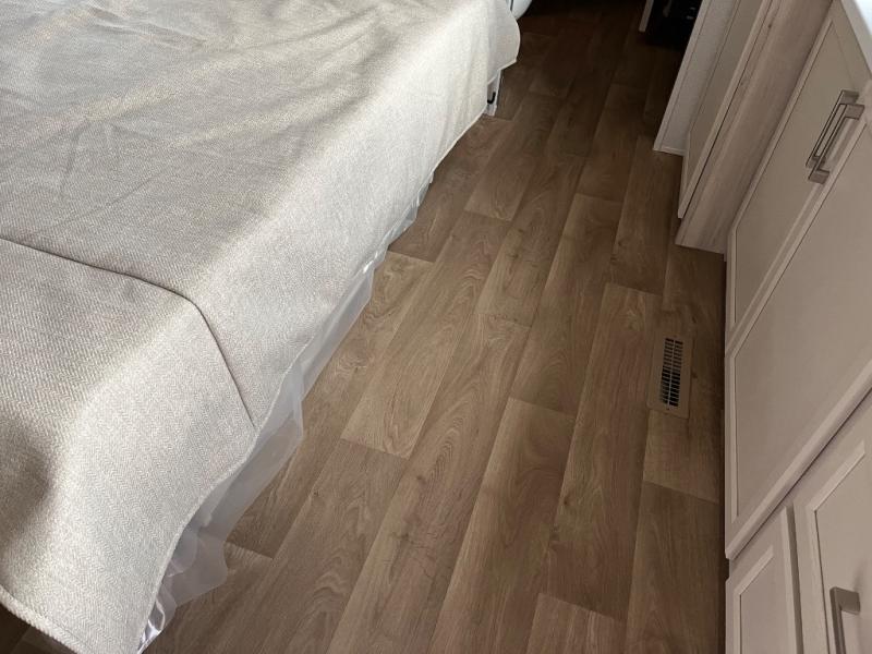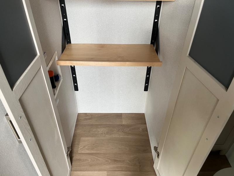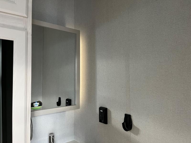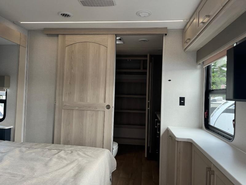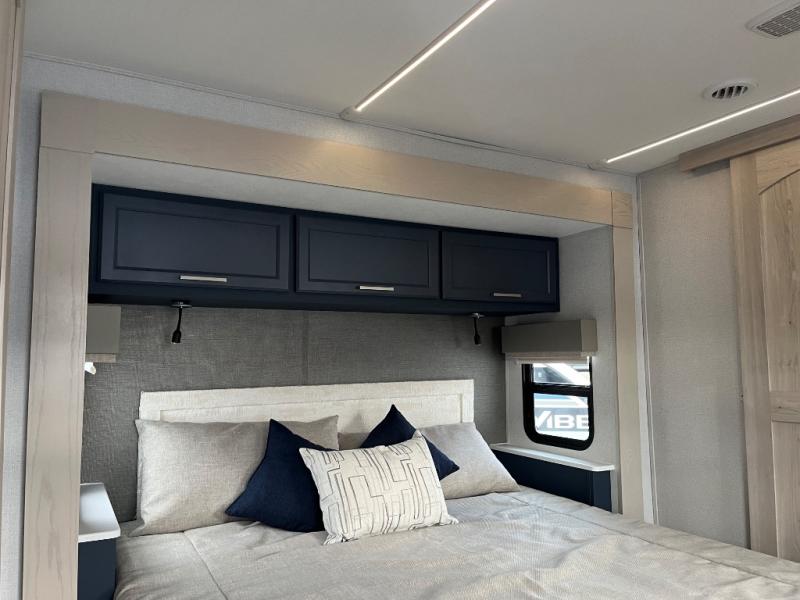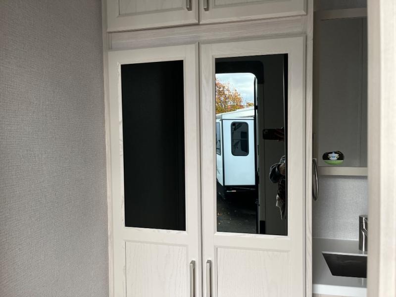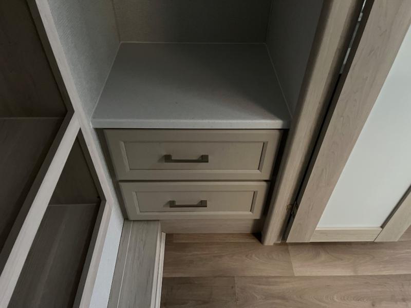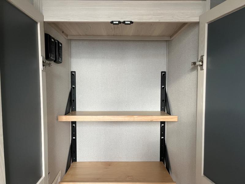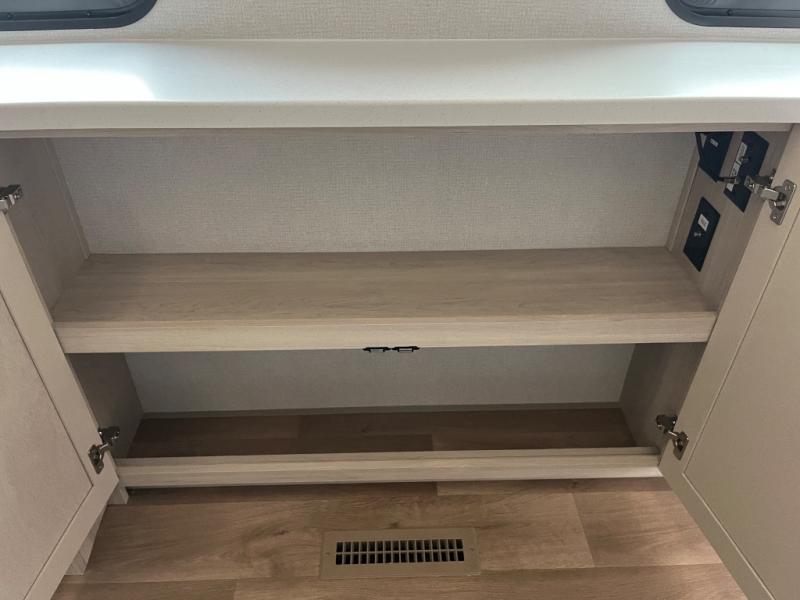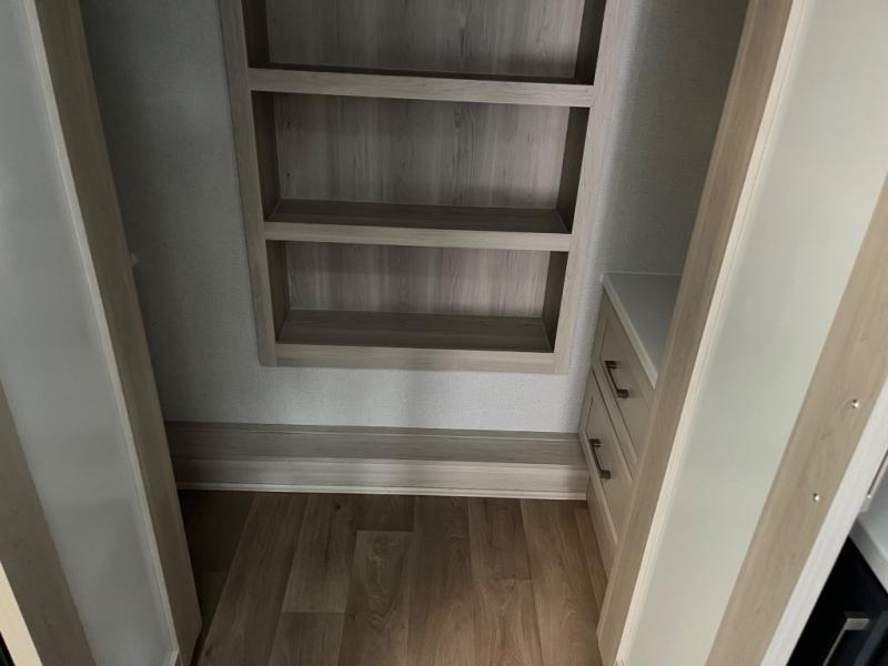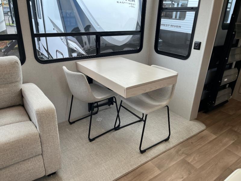 You won't believe all that this fifth wheel has to offer! Starting with the rear kitchen which has plenty of countertop space to prepare your delicious meals, a gas cooktop with a stainless steel 24" oven to cook them, and a large single bowl stainless steel sink for easy clean up. The living area has opposing sofas and a theater seat with USB charging and storage across from an entertainment center with 50" Smart TV. The half bathroom is close to the living area so you can get back to watching your movie faster. You will feel right at home sleeping in the master suite on a slide out king bed across from a dresser and hamper to keep your space tidy, plus entrance into the front full bathroom. Inside the bathroom, you will find a vanity with dual sinks for two to get ready at once, a spacious shower with a seat, and a walk-in closet for clothes, shoes, and more!
