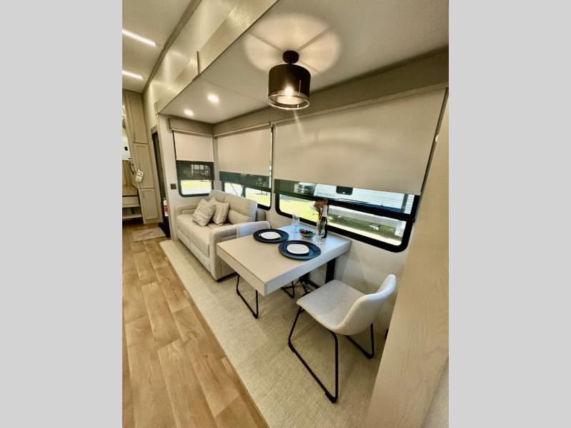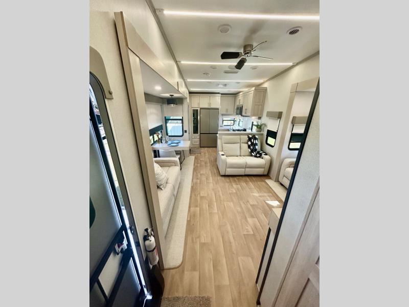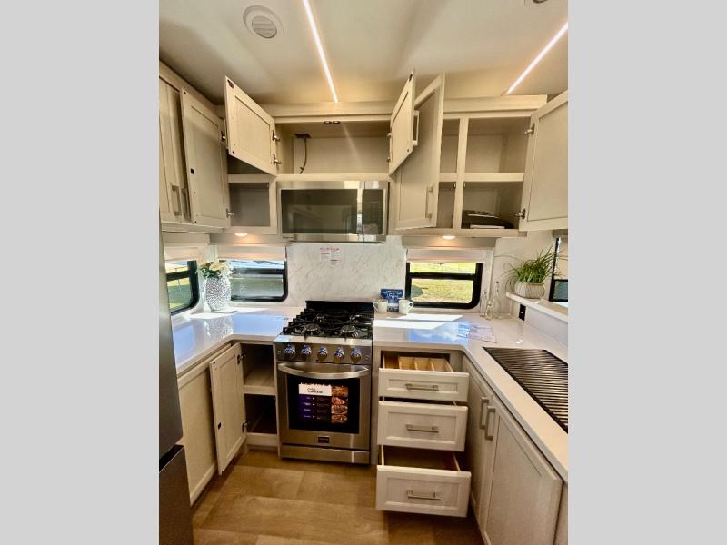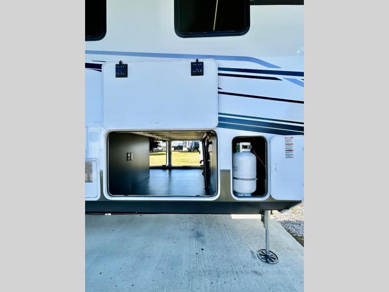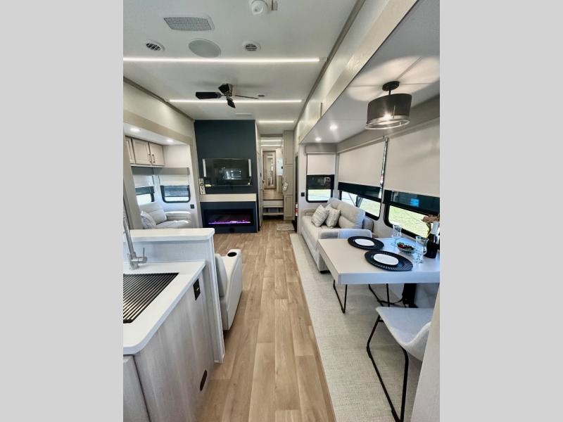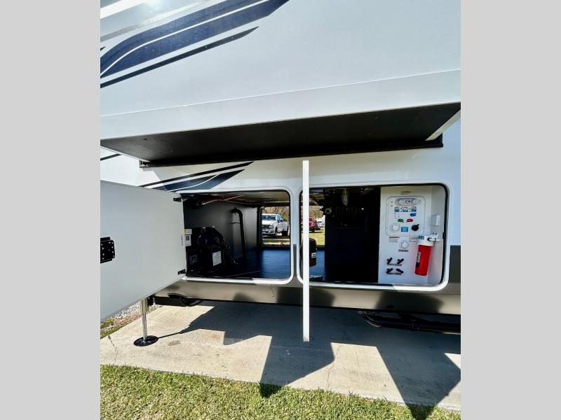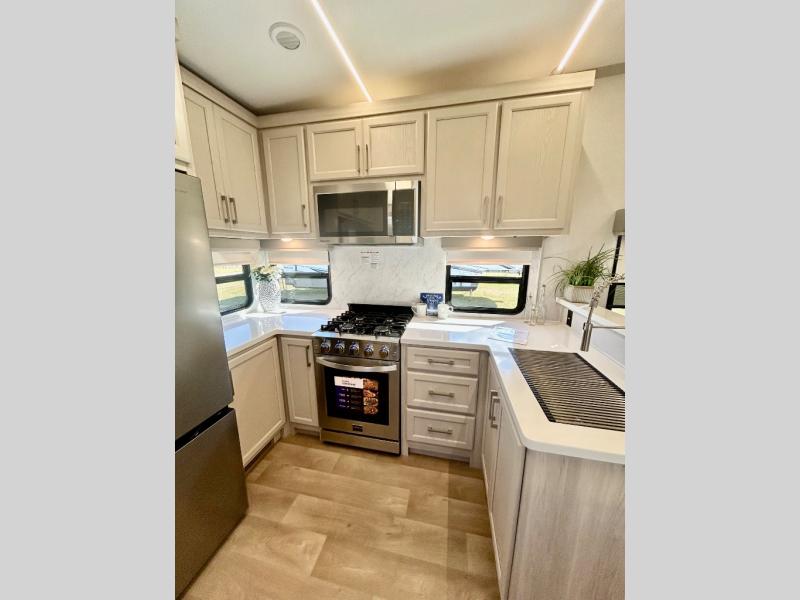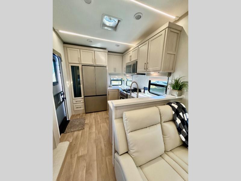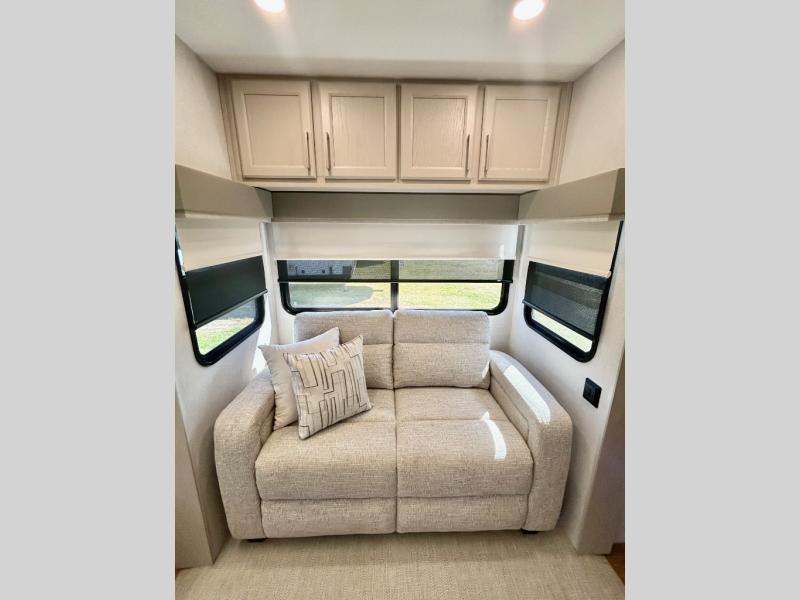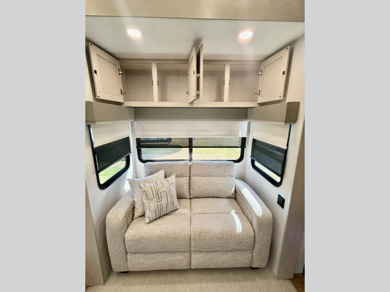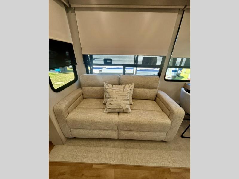 You won't believe all that this fifth wheel has to offer! Starting with the rear kitchen which has plenty of countertop space to prepare your delicious meals, a gas cooktop with a stainless steel 24" oven to cook them, and a large single bowl stainless steel sink for easy clean up. The living area has opposing sofas and a theater seat with USB charging and storage across from an entertainment center with 50" Smart TV. The half bathroom is close to the living area so you can get back to watching your movie faster. You will feel right at home sleeping in the master suite on a slide out king bed across from a dresser and hamper to keep your space tidy, plus entrance into the front full bathroom. Inside the bathroom, you will find a vanity with dual sinks for two to get ready at once, a spacious shower with a seat, and a walk-in closet for clothes, shoes, and more!