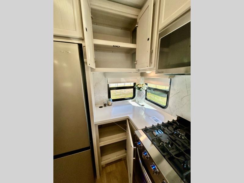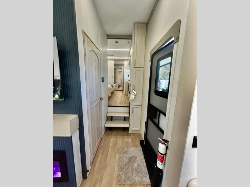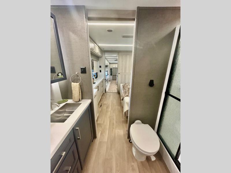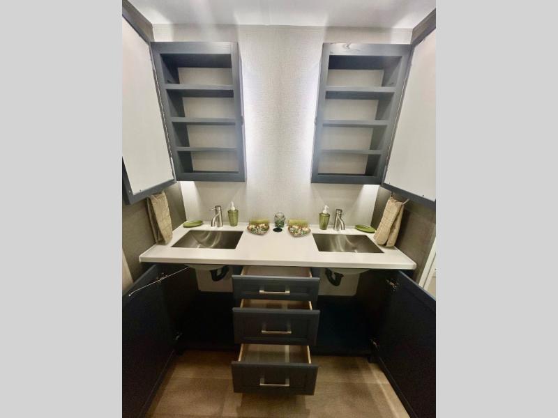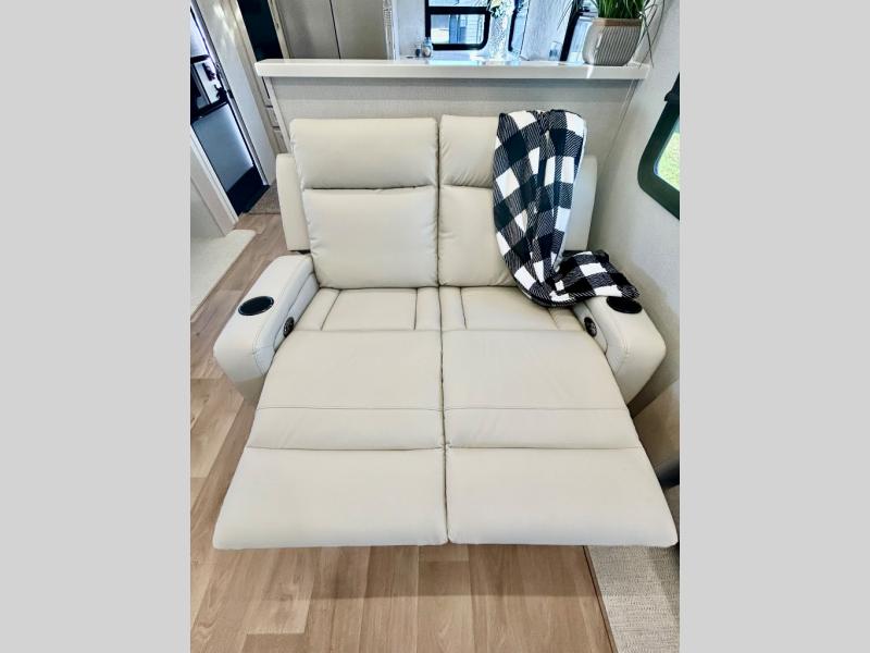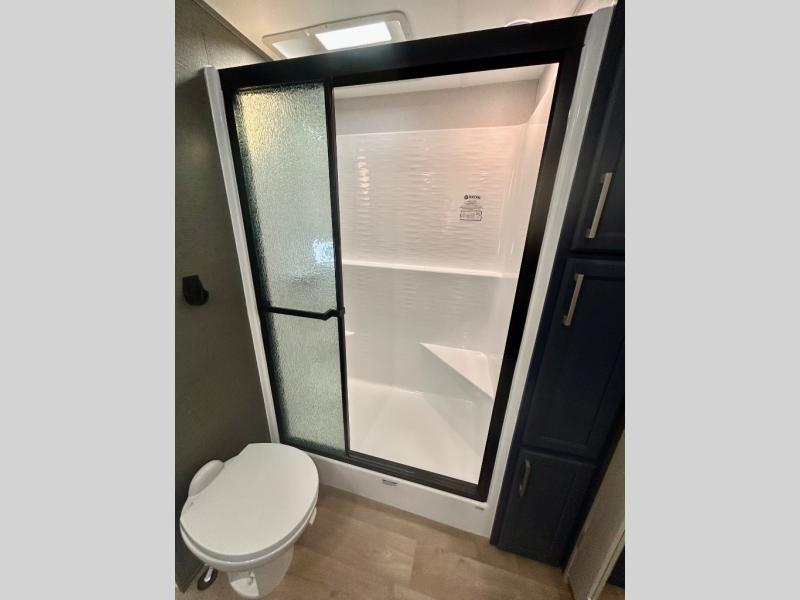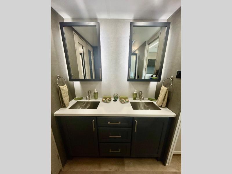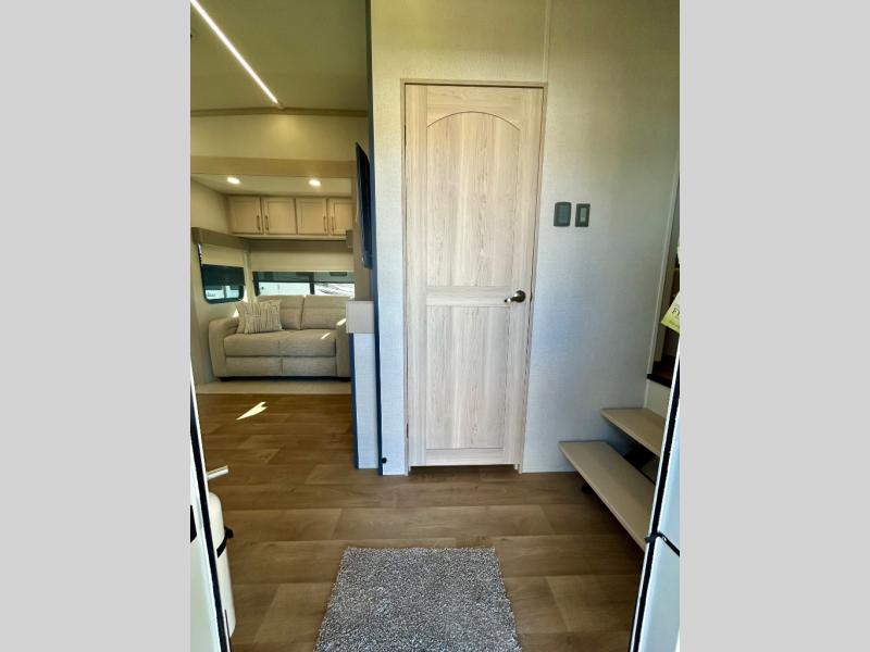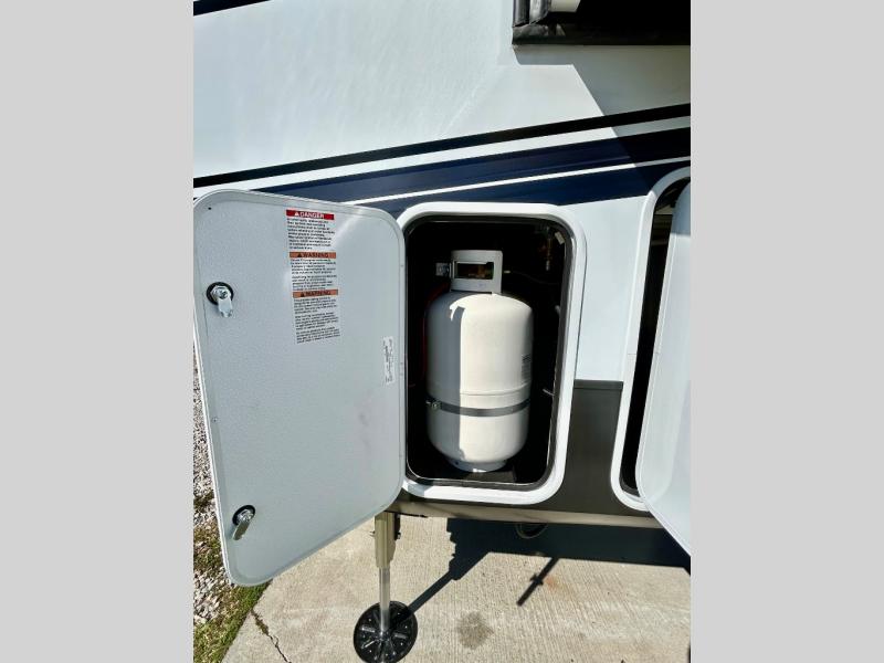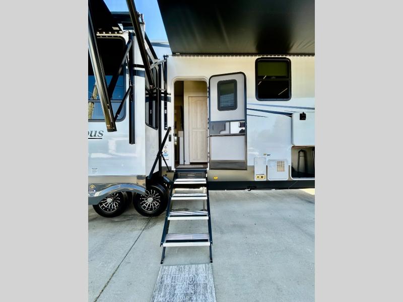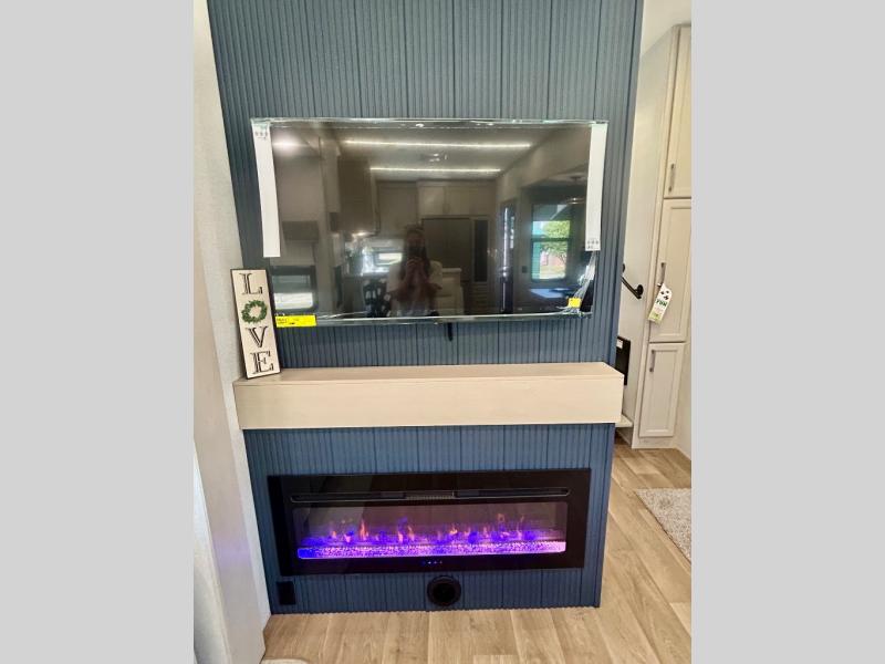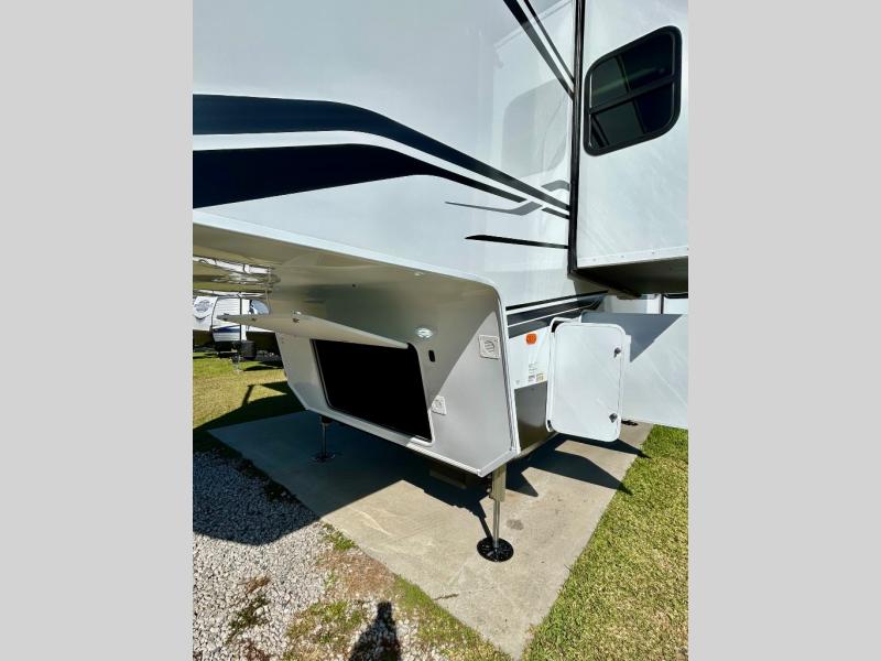 You won't believe all that this fifth wheel has to offer! Starting with the rear kitchen which has plenty of countertop space to prepare your delicious meals, a gas cooktop with a stainless steel 24" oven to cook them, and a large single bowl stainless steel sink for easy clean up. The living area has opposing sofas and a theater seat with USB charging and storage across from an entertainment center with 50" Smart TV. The half bathroom is close to the living area so you can get back to watching your movie faster. You will feel right at home sleeping in the master suite on a slide out king bed across from a dresser and hamper to keep your space tidy, plus entrance into the front full bathroom. Inside the bathroom, you will find a vanity with dual sinks for two to get ready at once, a spacious shower with a seat, and a walk-in closet for clothes, shoes, and more!