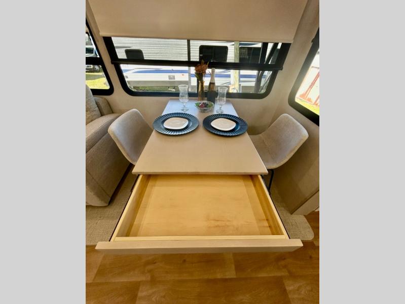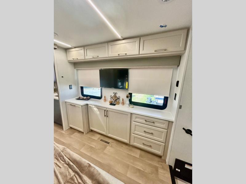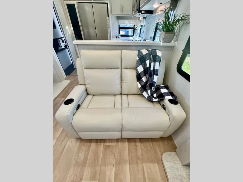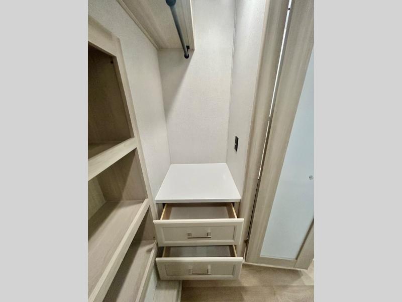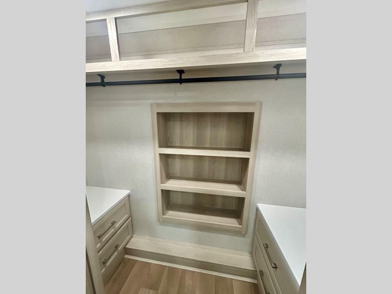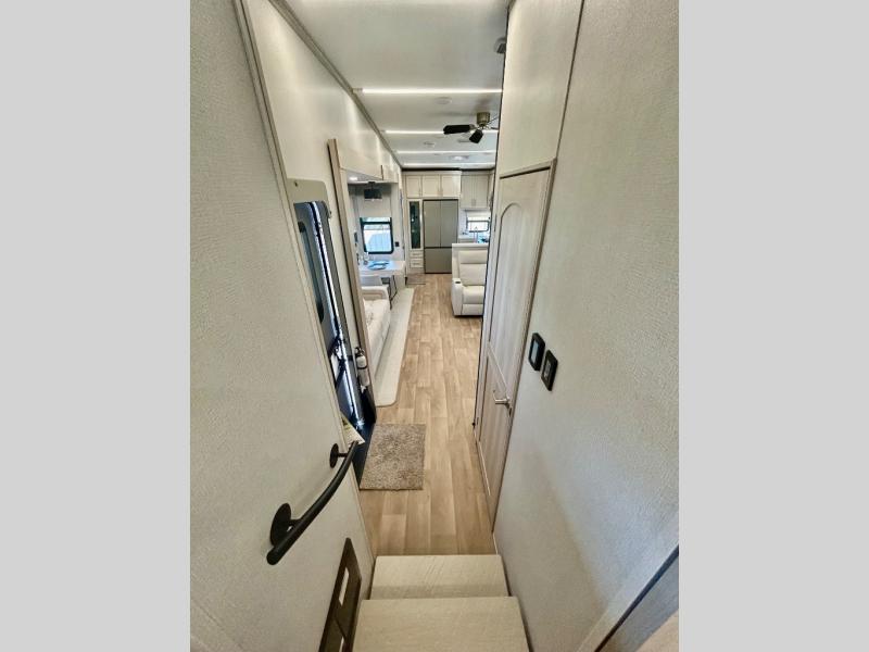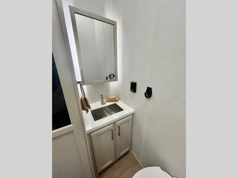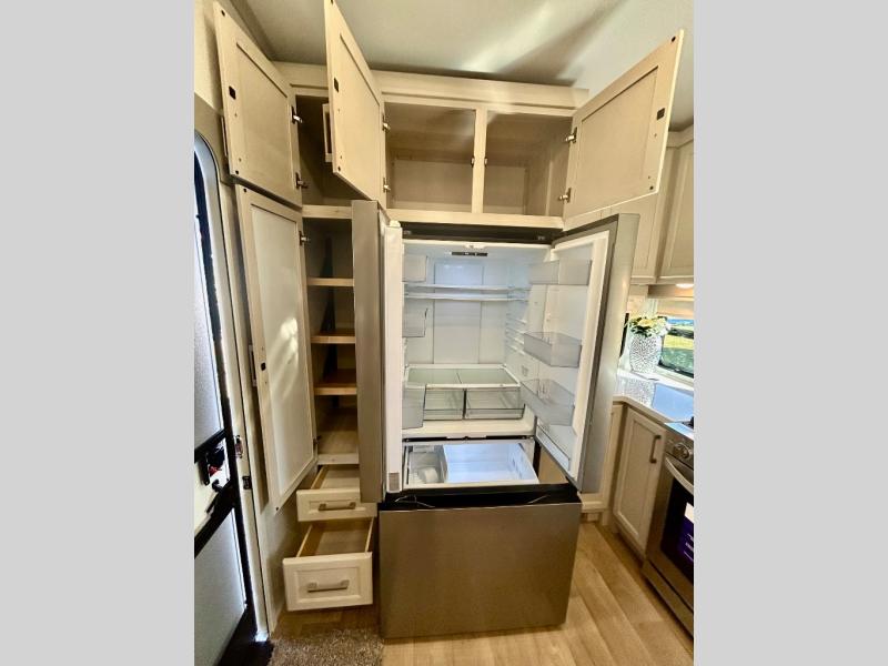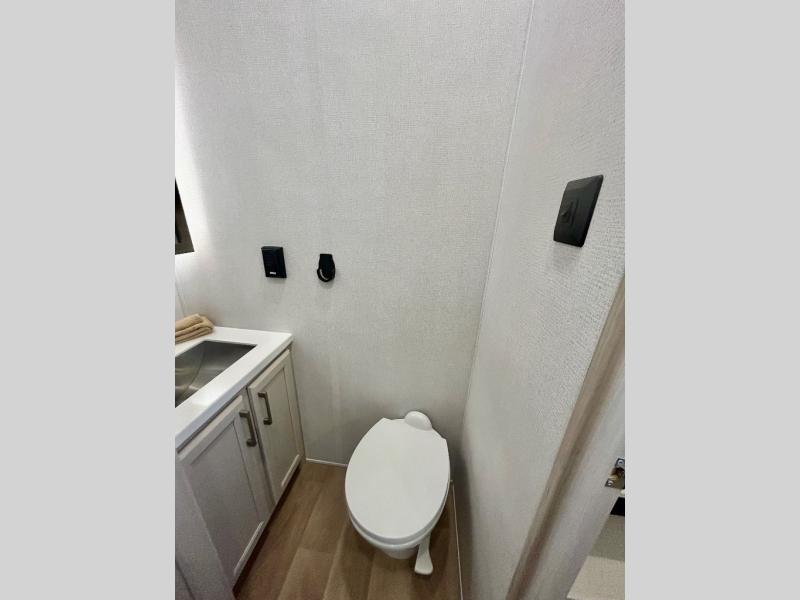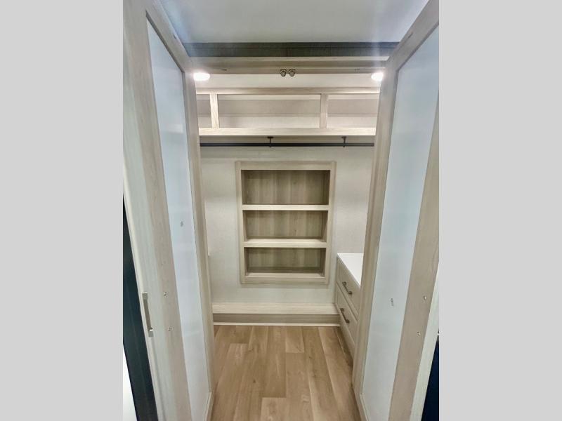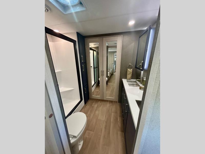 You won't believe all that this fifth wheel has to offer! Starting with the rear kitchen which has plenty of countertop space to prepare your delicious meals, a gas cooktop with a stainless steel 24" oven to cook them, and a large single bowl stainless steel sink for easy clean up. The living area has opposing sofas and a theater seat with USB charging and storage across from an entertainment center with 50" Smart TV. The half bathroom is close to the living area so you can get back to watching your movie faster. You will feel right at home sleeping in the master suite on a slide out king bed across from a dresser and hamper to keep your space tidy, plus entrance into the front full bathroom. Inside the bathroom, you will find a vanity with dual sinks for two to get ready at once, a spacious shower with a seat, and a walk-in closet for clothes, shoes, and more!