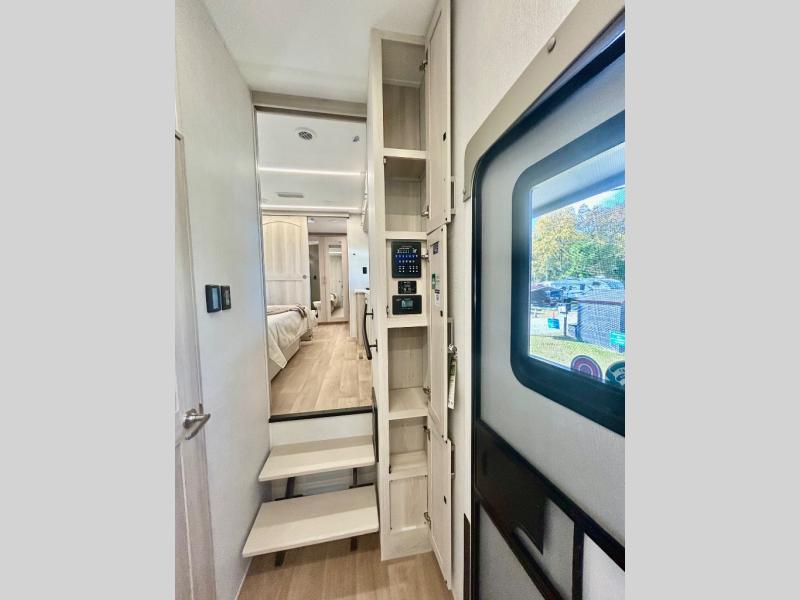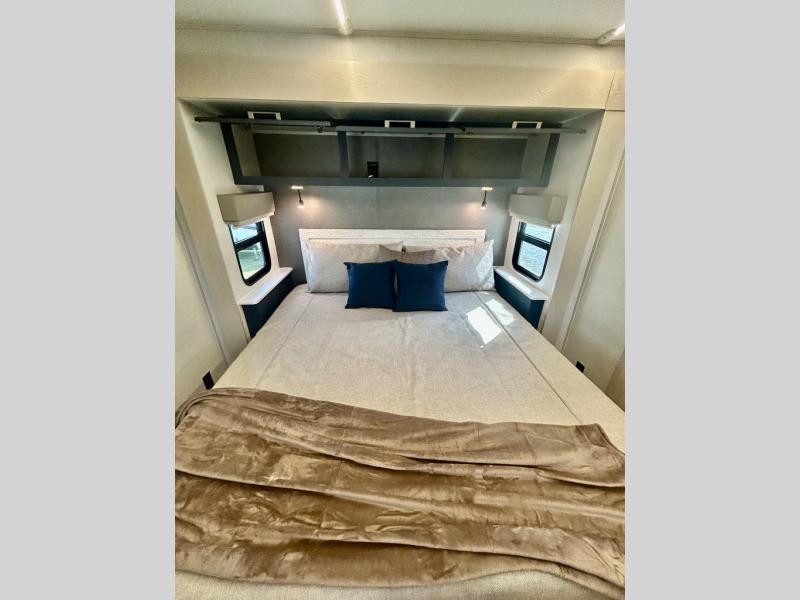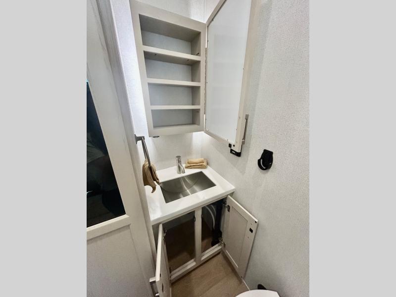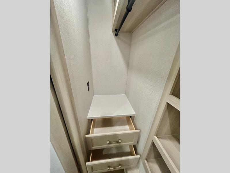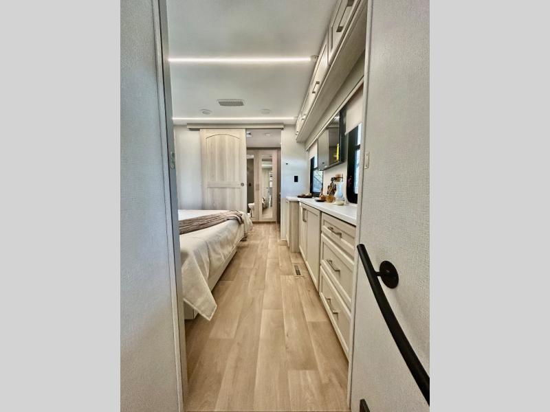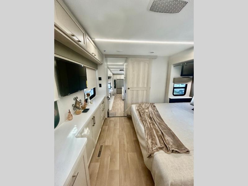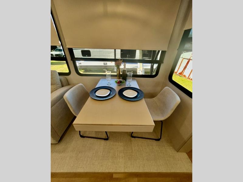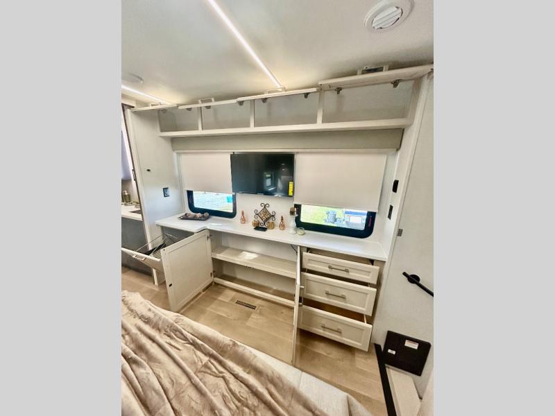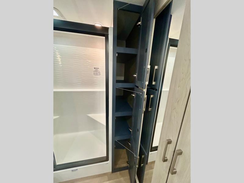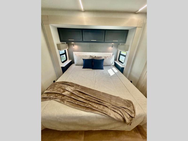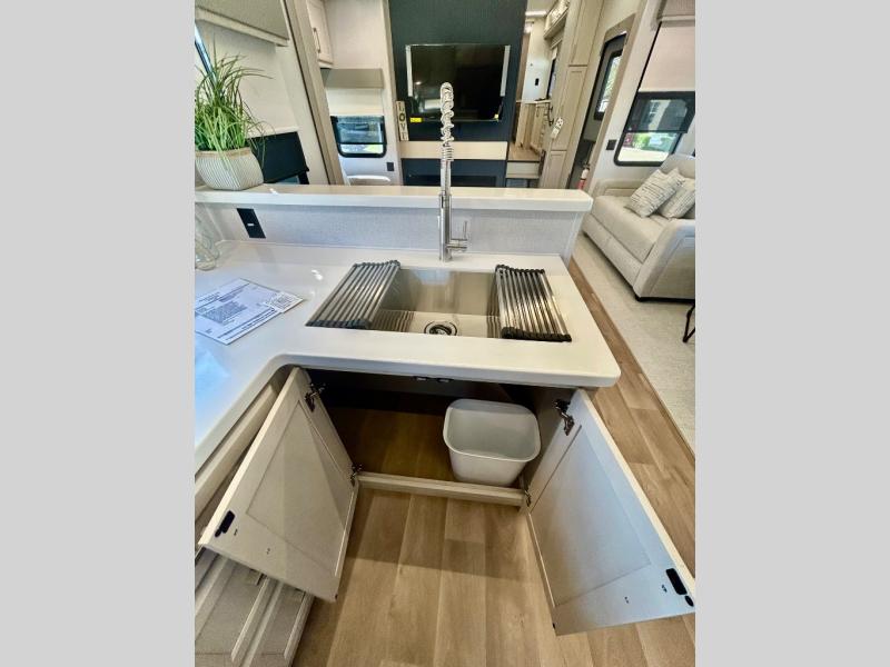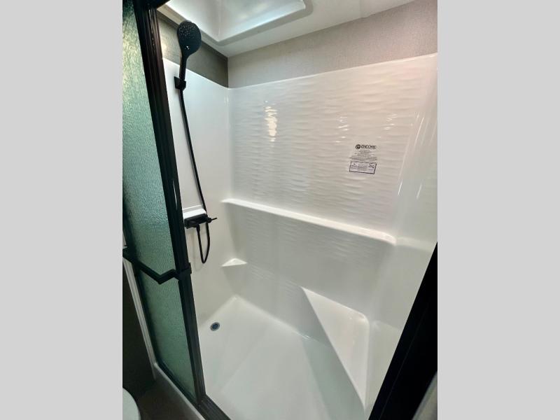 You won't believe all that this fifth wheel has to offer! Starting with the rear kitchen which has plenty of countertop space to prepare your delicious meals, a gas cooktop with a stainless steel 24" oven to cook them, and a large single bowl stainless steel sink for easy clean up. The living area has opposing sofas and a theater seat with USB charging and storage across from an entertainment center with 50" Smart TV. The half bathroom is close to the living area so you can get back to watching your movie faster. You will feel right at home sleeping in the master suite on a slide out king bed across from a dresser and hamper to keep your space tidy, plus entrance into the front full bathroom. Inside the bathroom, you will find a vanity with dual sinks for two to get ready at once, a spacious shower with a seat, and a walk-in closet for clothes, shoes, and more!