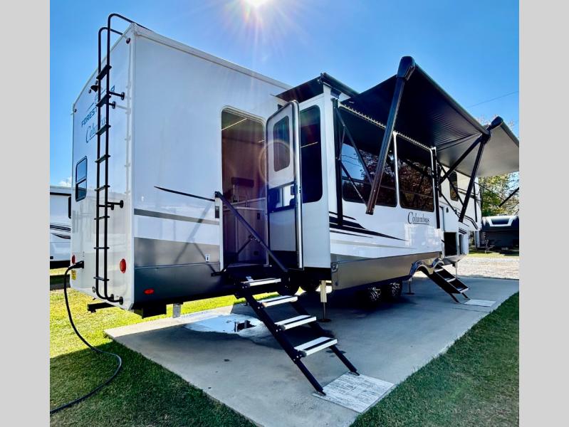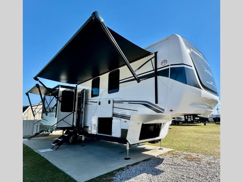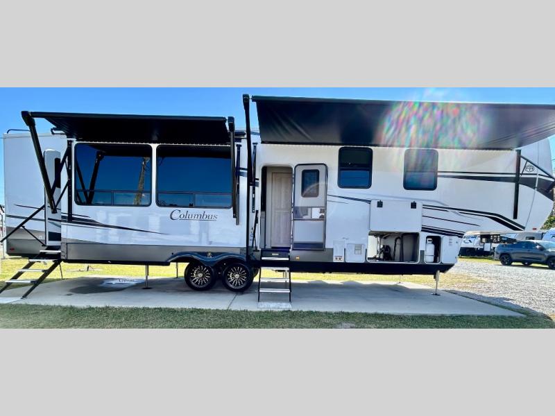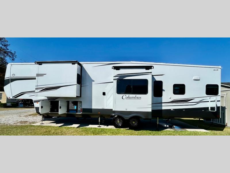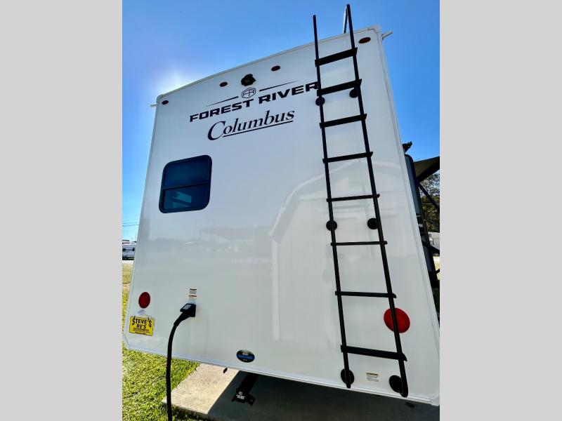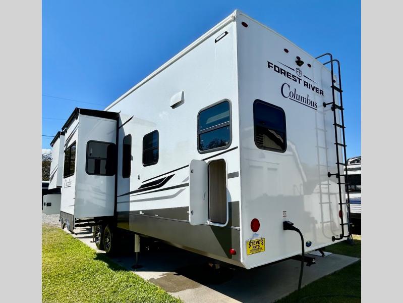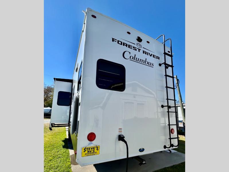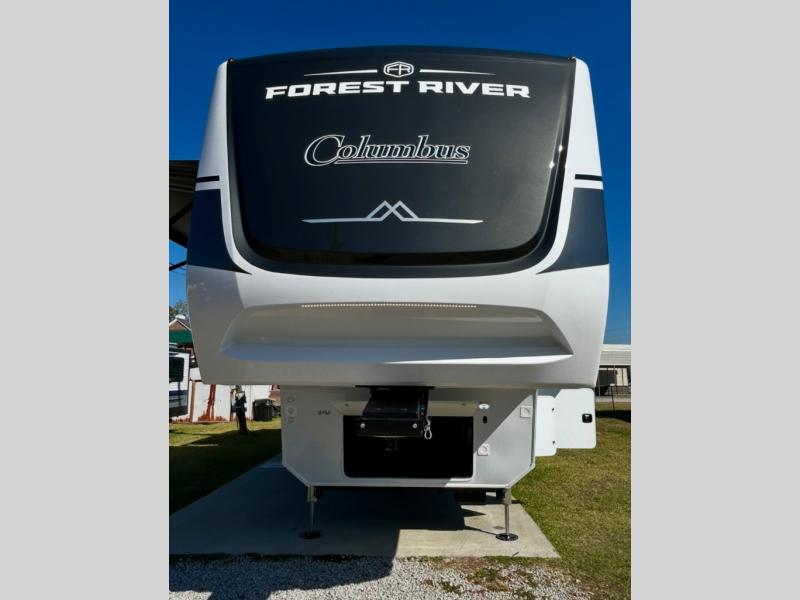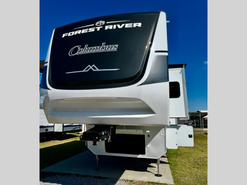Experience a different camping life with residential furnishings and high-end features in each one of these Forest River Columbus fifth wheels! Durable construction begins with a 101" wide body, an all-welded aluminum frame superstructure, and high-gloss fiberglass vacuum bonded walls and slide out ends with dual Azdel. You will appreciate the Lippert axles, MORryde CRE 3000 suspension system, and 16" wheels with nitrogen-filled tires for a smooth tow from home to campground. Additional exterior features include a tire pressure monitoring system, a heated utility convenience center, an outside sprayer, and slam latch on all the storage doors. Inside, you'll be met with many luxurious amenities, including residential style crown molding throughout, roller day/night shades, upgraded true solid surface countertops in the bath and kitchen, plus solid wood steps.