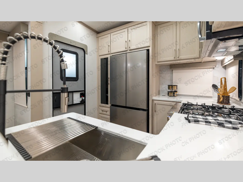 You won't believe all that this fifth wheel has to offer! Starting with the rear kitchen which has plenty of countertop space to prepare your delicious meals, a gas cooktop with a stainless steel 24" oven to cook them, and a large single bowl stainless steel sink for easy clean up. The living area has opposing sofas and a theater seat with USB charging and storage across from an entertainment center with 50" Smart TV. The half bathroom is close to the living area so you can get back to watching your movie faster. You will feel right at home sleeping in the master suite on a slide out king bed across from a dresser and hamper to keep your space tidy, plus entrance into the front full bathroom. Inside the bathroom, you will find a vanity with dual sinks for two to get ready at once, a spacious shower with a seat, and a walk-in closet for clothes, shoes, and more!