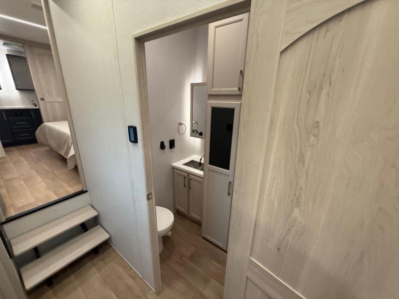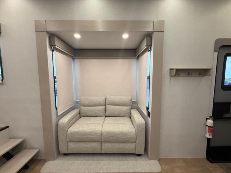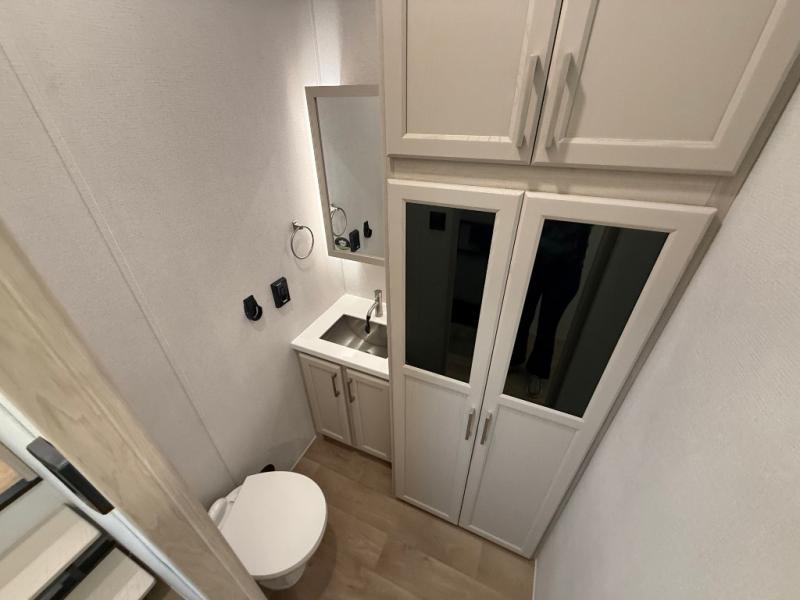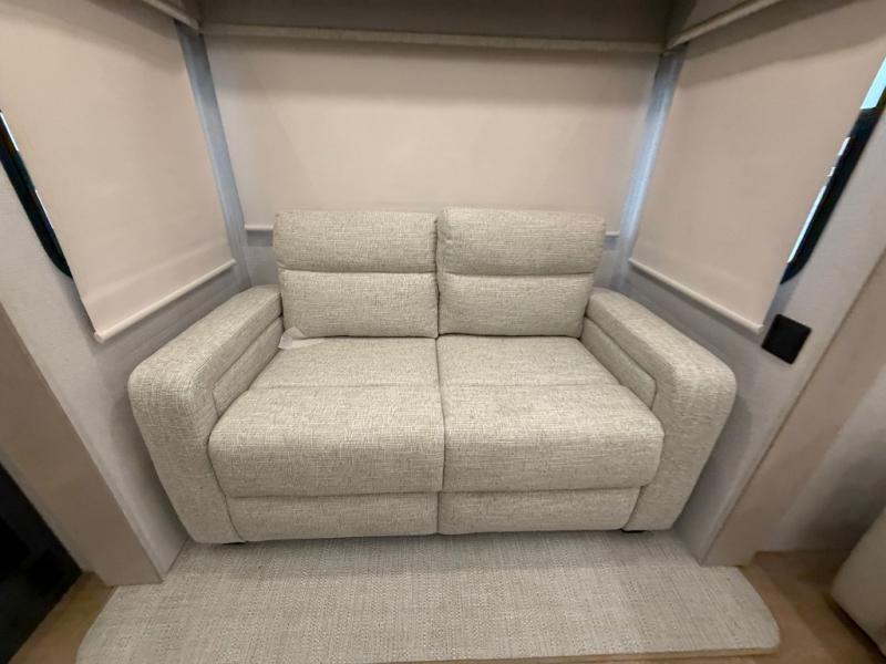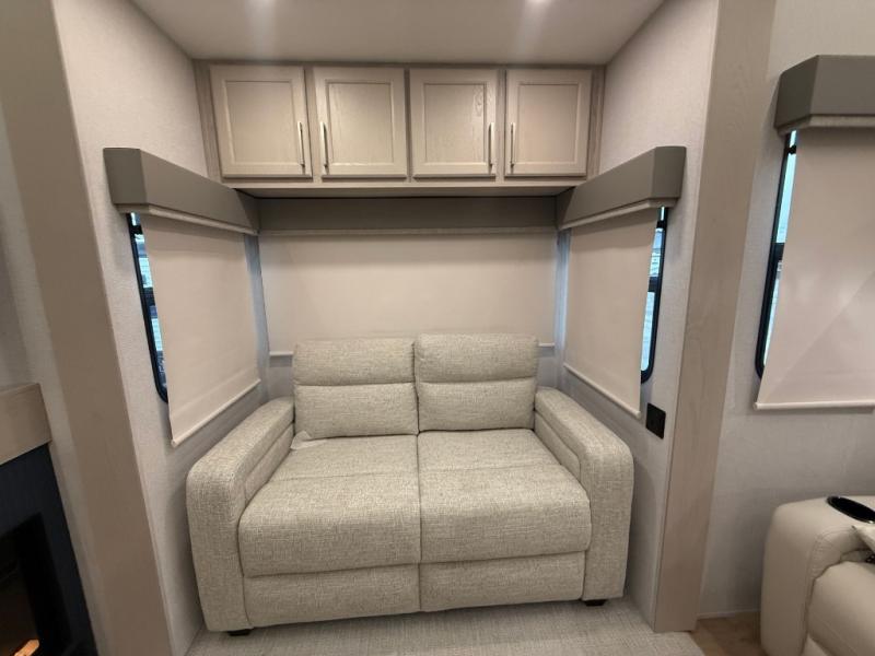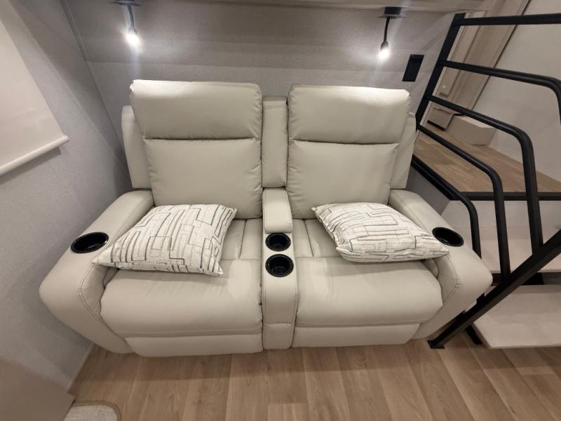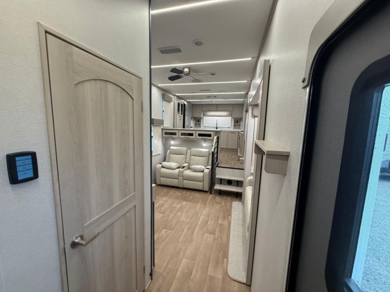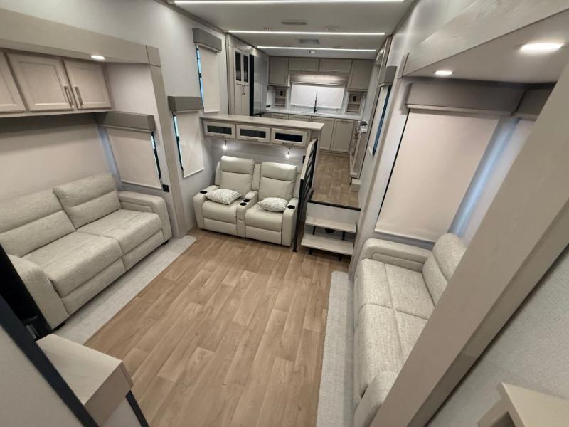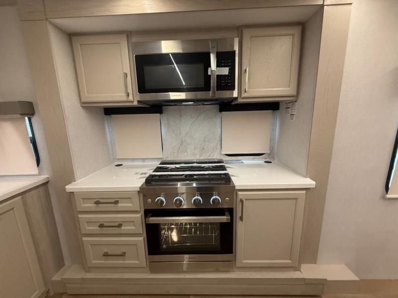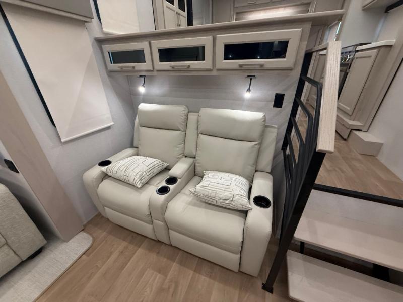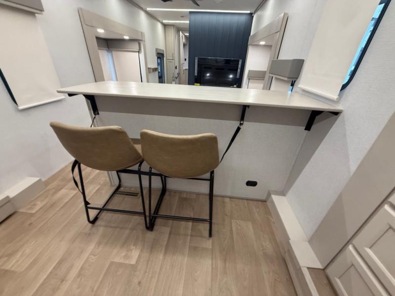 The front kitchen in this fifth wheel is a chef's dream come true while camping! There is generous counter space up front and beside the range, plus a pantry and 12V refrigerator with an ice maker. There is also a hi-top table with two bar stools that overlooks the living area. Inside the living area there are opposing sofa sleeper slides and power theater seating across from an entertainment center with a 50" Smart TV. A mid-coach half bath is easily accessible, and the full rear bath with dual bath sinks will create a master bedroom you are sure to love. There is a king bed slide out, a wardrobe, hamper, and a TV/storage.