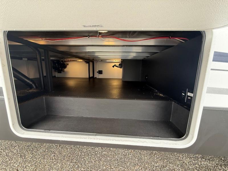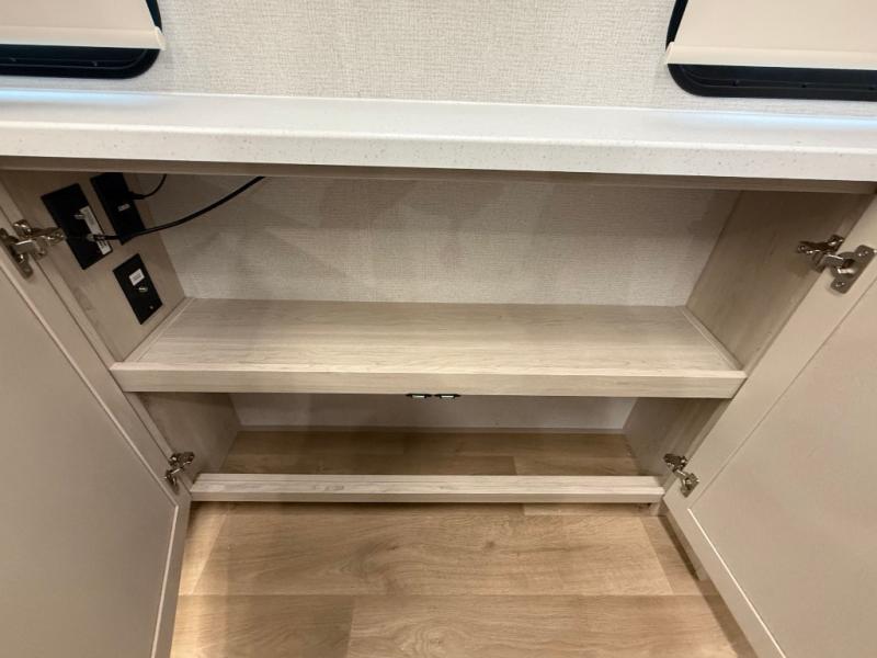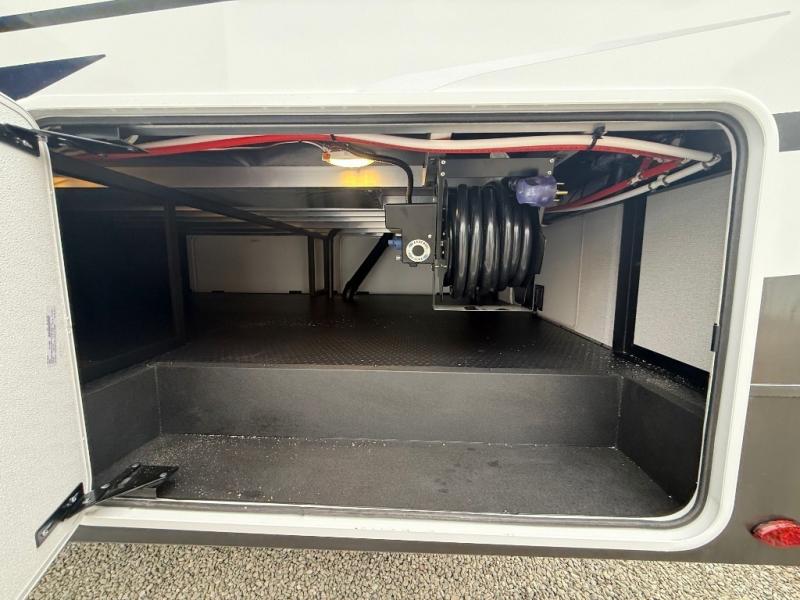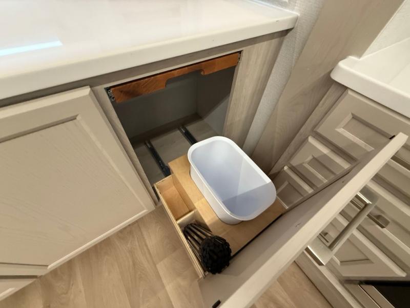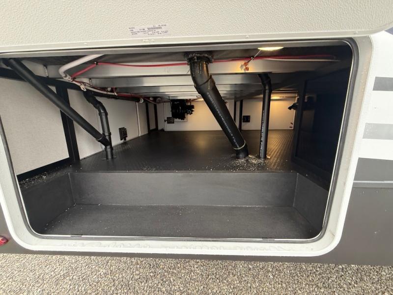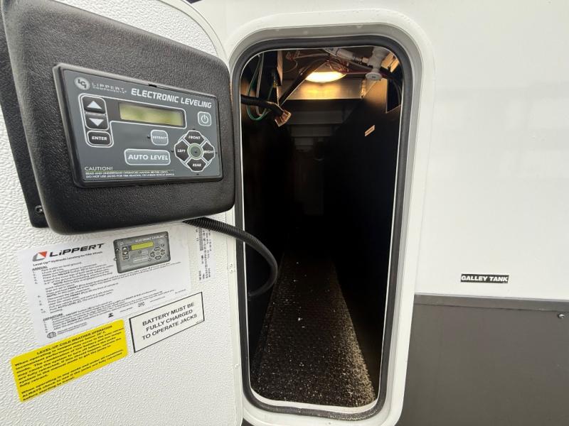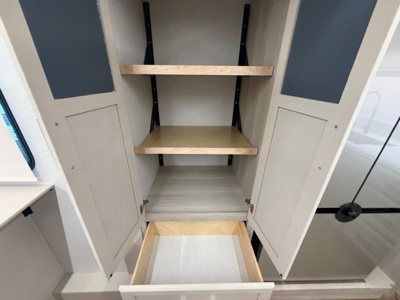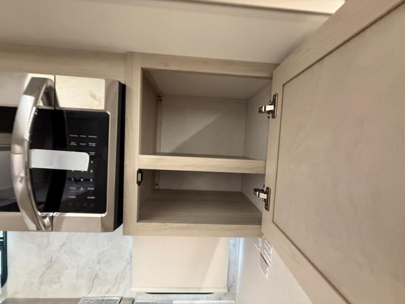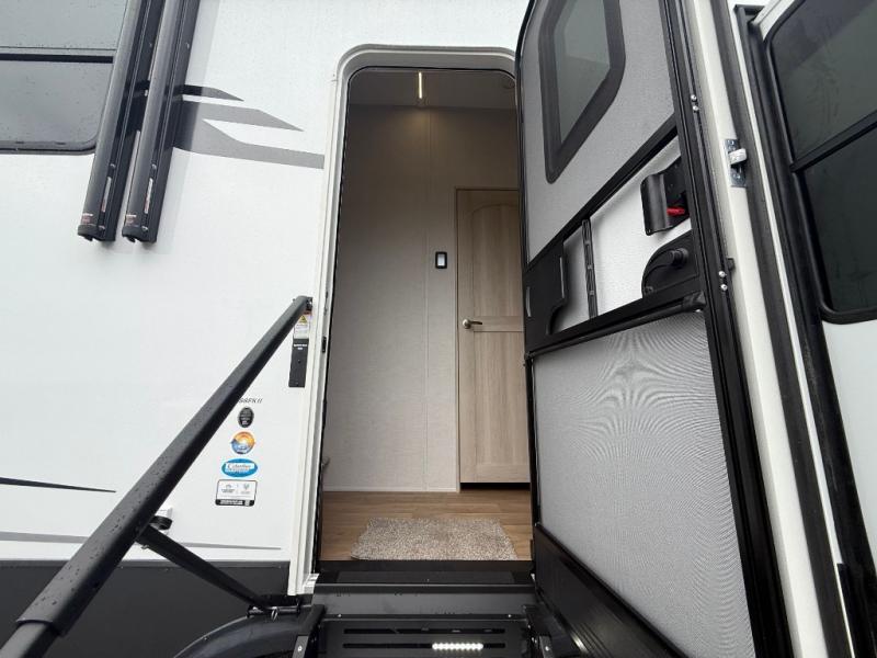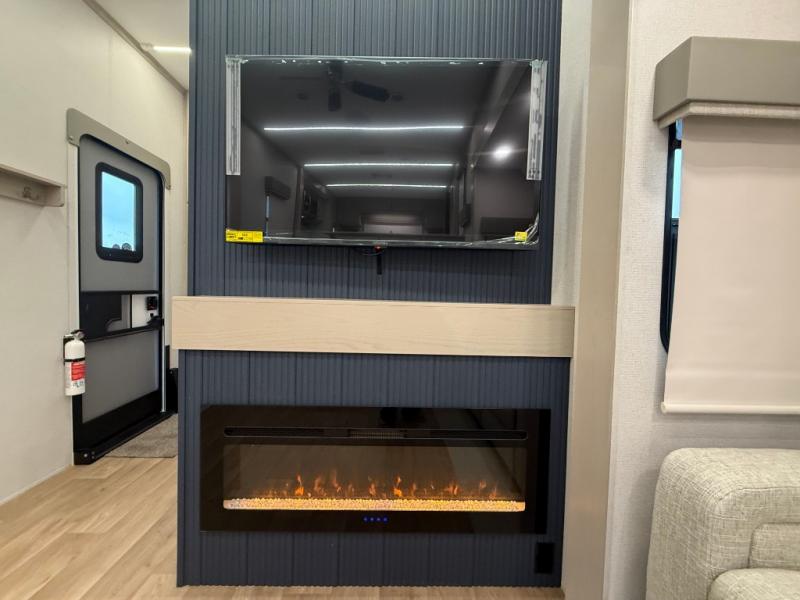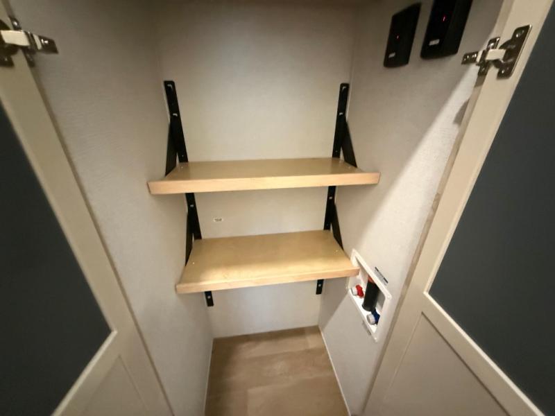The front kitchen in this fifth wheel is a chef's dream come true while camping! There is generous counter space up front and beside the range, plus a pantry and 12V refrigerator with an ice maker. There is also a hi-top table with two bar stools that overlooks the living area. Inside the living area there are opposing sofa sleeper slides and power theater seating across from an entertainment center with a 50" Smart TV. A mid-coach half bath is easily accessible, and the full rear bath with dual bath sinks will create a master bedroom you are sure to love. There is a king bed slide out, a wardrobe, hamper, and a TV/storage.
