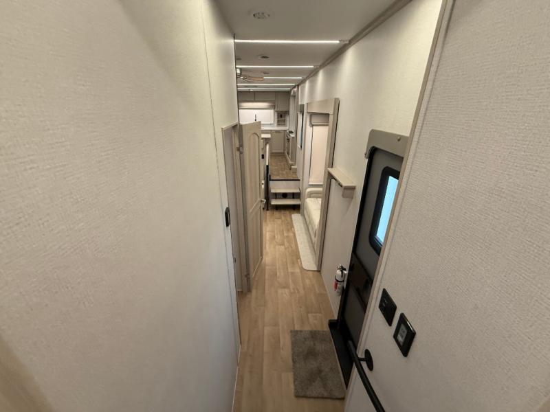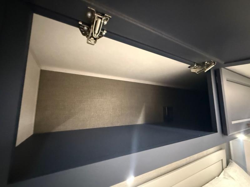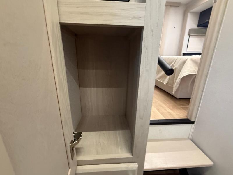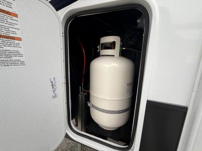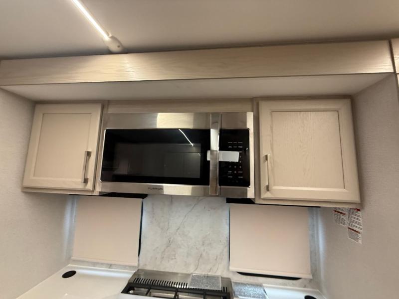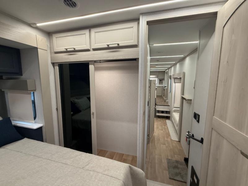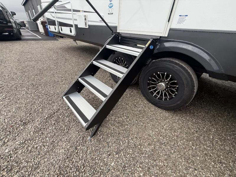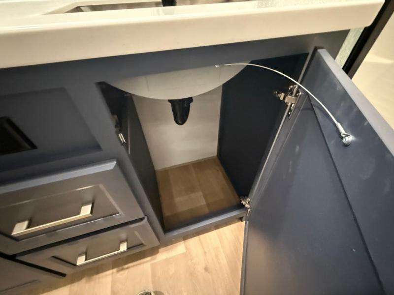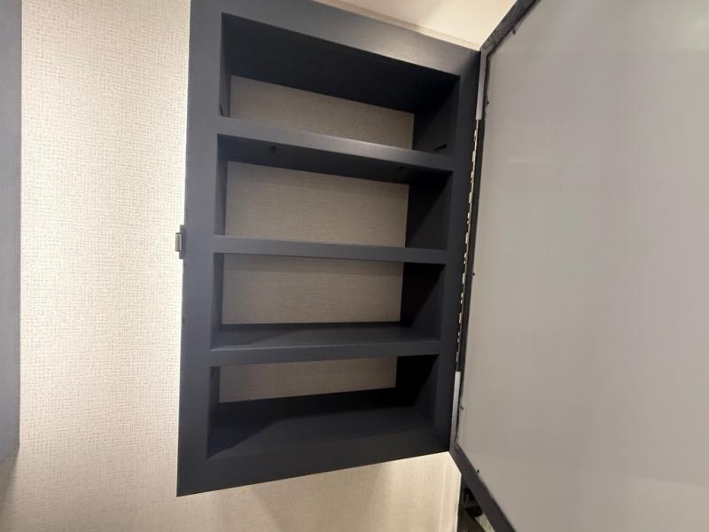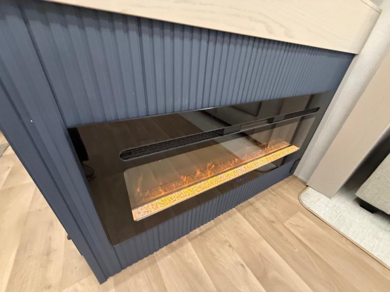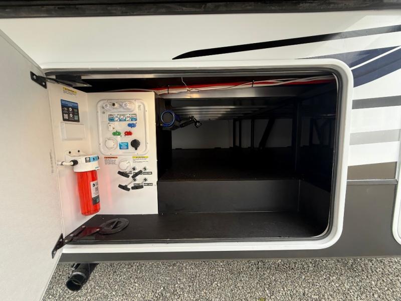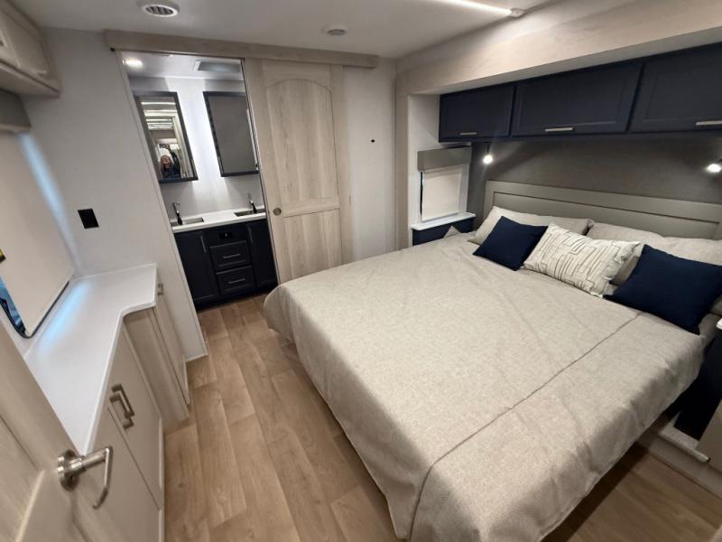 The front kitchen in this fifth wheel is a chef's dream come true while camping! There is generous counter space up front and beside the range, plus a pantry and 12V refrigerator with an ice maker. There is also a hi-top table with two bar stools that overlooks the living area. Inside the living area there are opposing sofa sleeper slides and power theater seating across from an entertainment center with a 50" Smart TV. A mid-coach half bath is easily accessible, and the full rear bath with dual bath sinks will create a master bedroom you are sure to love. There is a king bed slide out, a wardrobe, hamper, and a TV/storage.