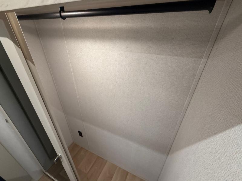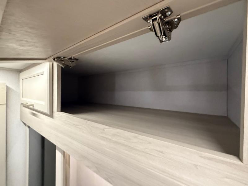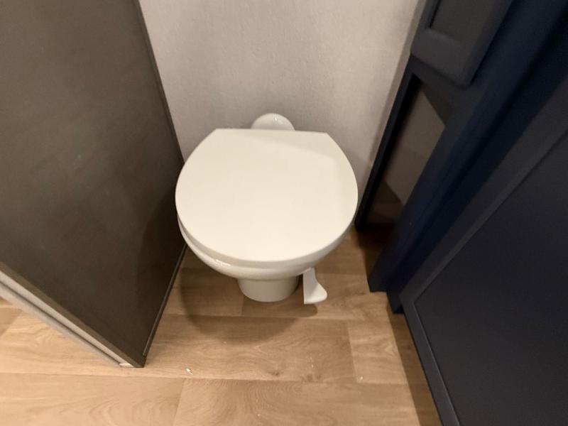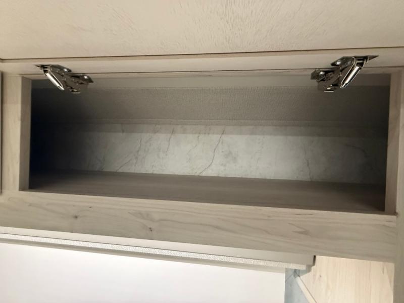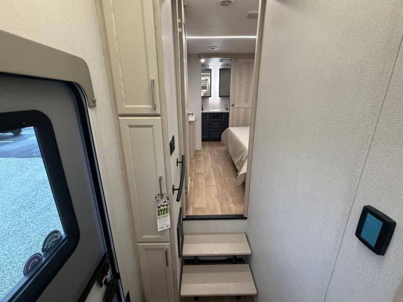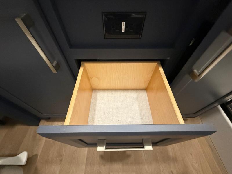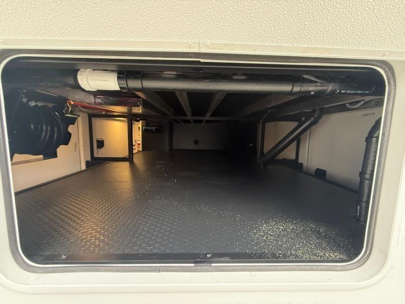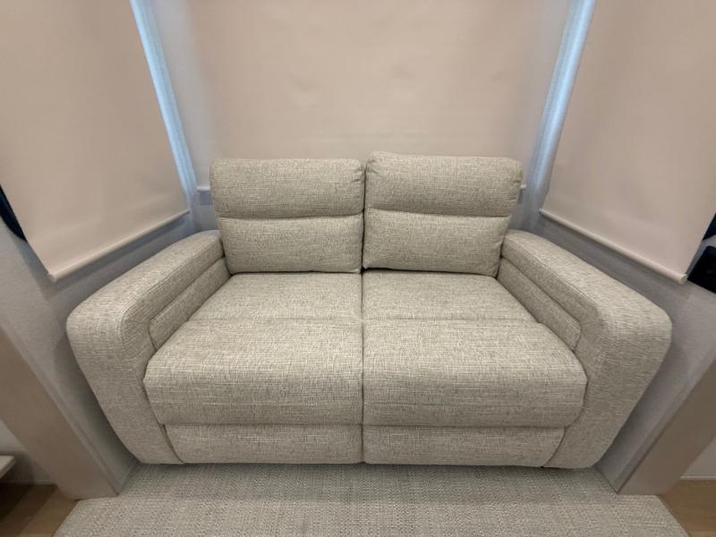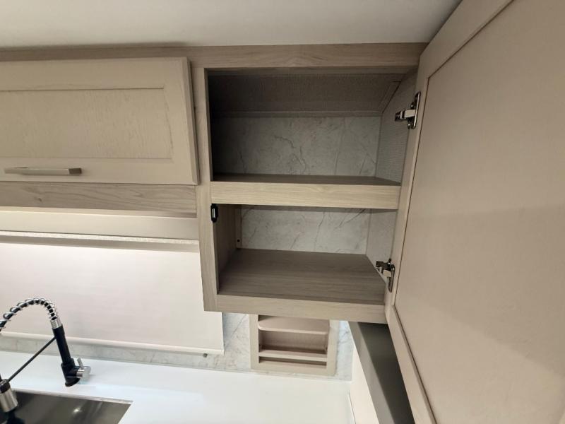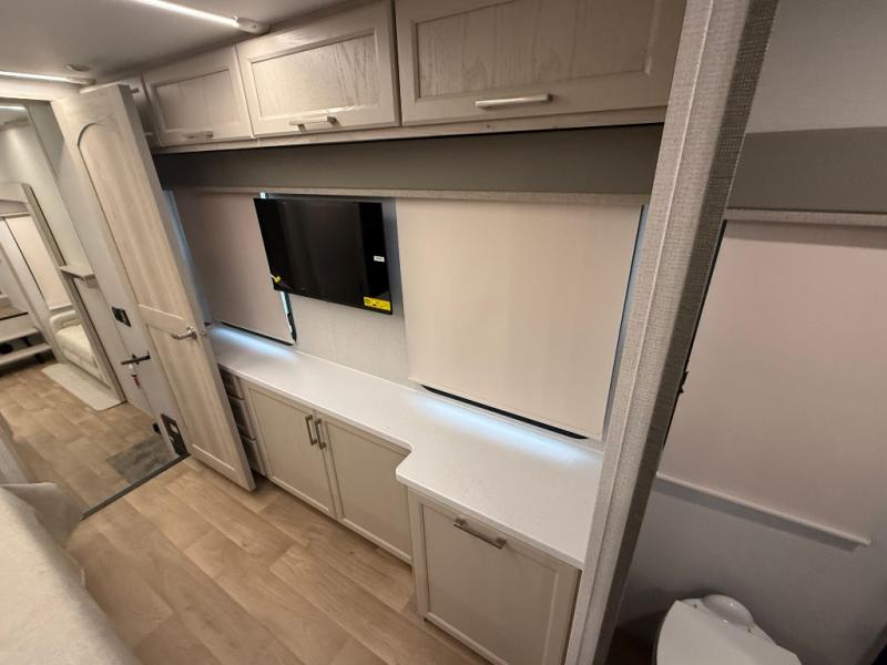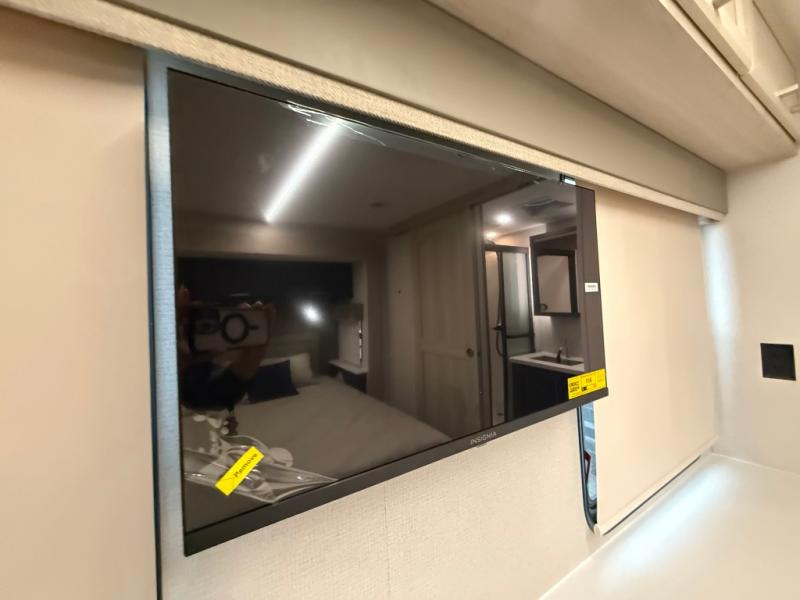 The front kitchen in this fifth wheel is a chef's dream come true while camping! There is generous counter space up front and beside the range, plus a pantry and 12V refrigerator with an ice maker. There is also a hi-top table with two bar stools that overlooks the living area. Inside the living area there are opposing sofa sleeper slides and power theater seating across from an entertainment center with a 50" Smart TV. A mid-coach half bath is easily accessible, and the full rear bath with dual bath sinks will create a master bedroom you are sure to love. There is a king bed slide out, a wardrobe, hamper, and a TV/storage.