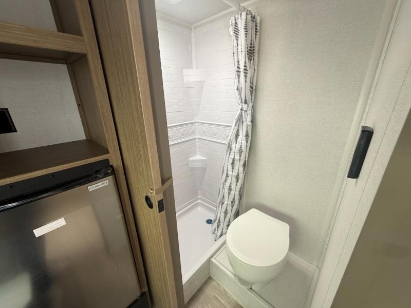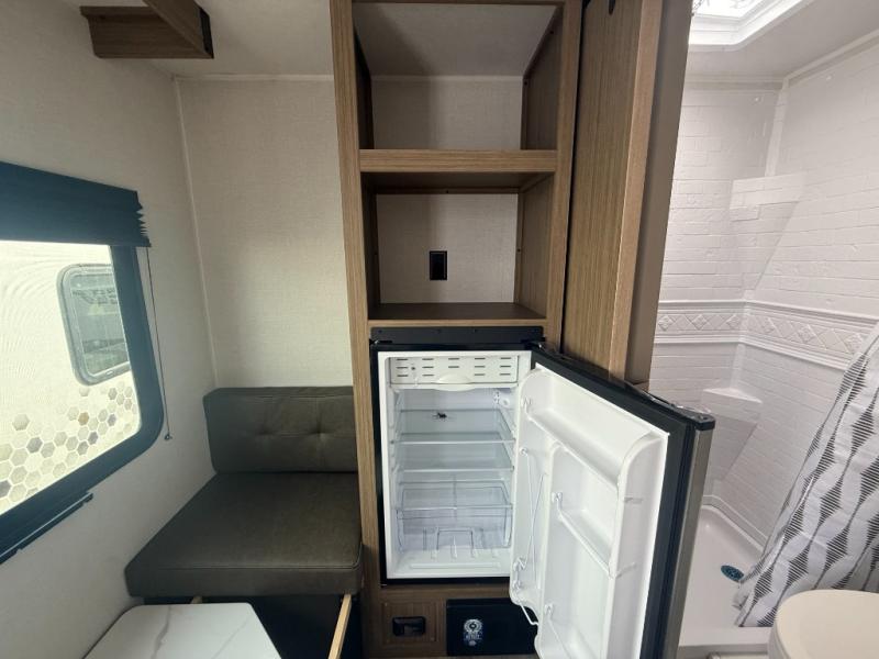 This lightweight travel trailer has everything you need to enjoy camping trips! There is a front east to west custom king bed with storage at the foot of the bed and overhead for your valuables. A private bath includes a toilet and walk-in shower so you can easily get ready each day, and you can prepare your meals on the two-burner cooktop when you get hungry. The booth dinette will provide dining space, along with sleeping space for one to two little ones. Don't let this trailer get away!