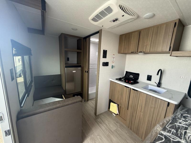 This lightweight travel trailer has everything you need to enjoy camping trips! There is a front east to west custom king bed with storage at the foot of the bed and overhead for your valuables. A private bath includes a toilet and walk-in shower so you can easily get ready each day, and you can prepare your meals on the two-burner cooktop when you get hungry. The booth dinette will provide dining space, along with sleeping space for one to two little ones. Don't let this trailer get away!
