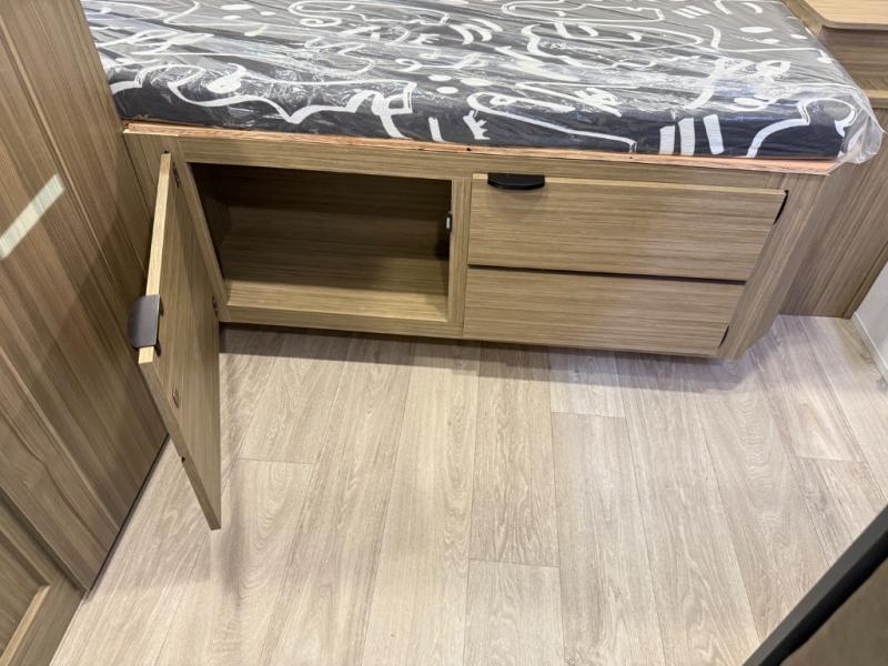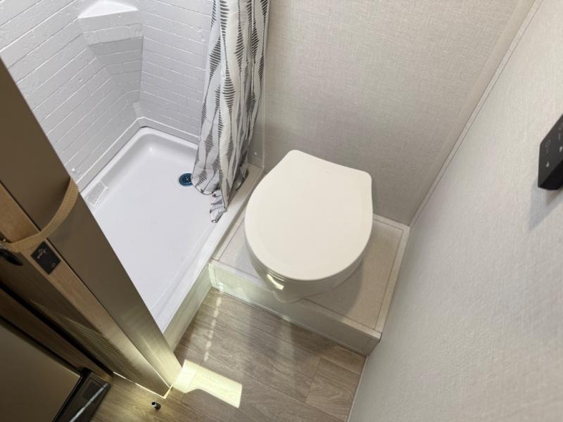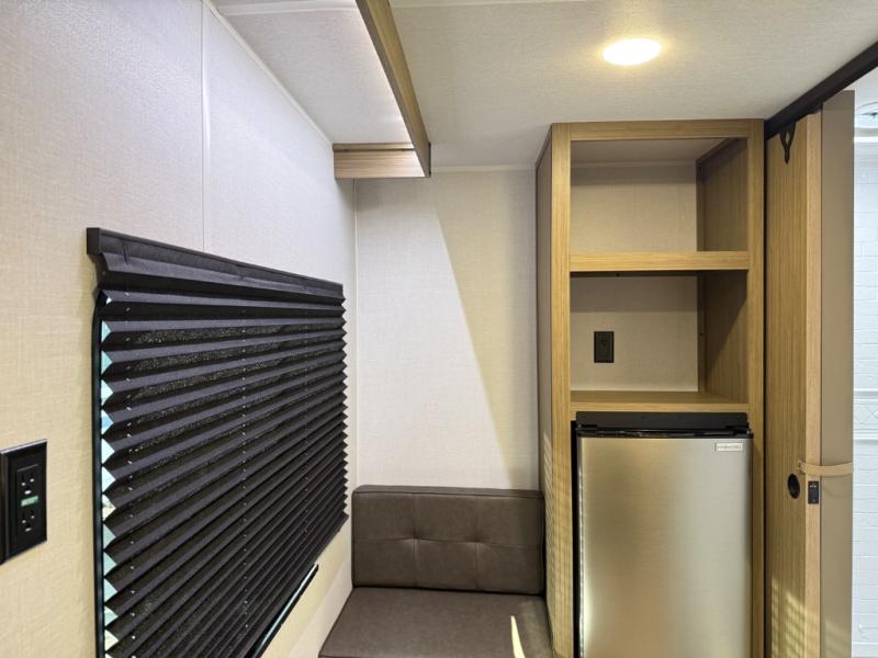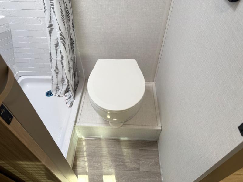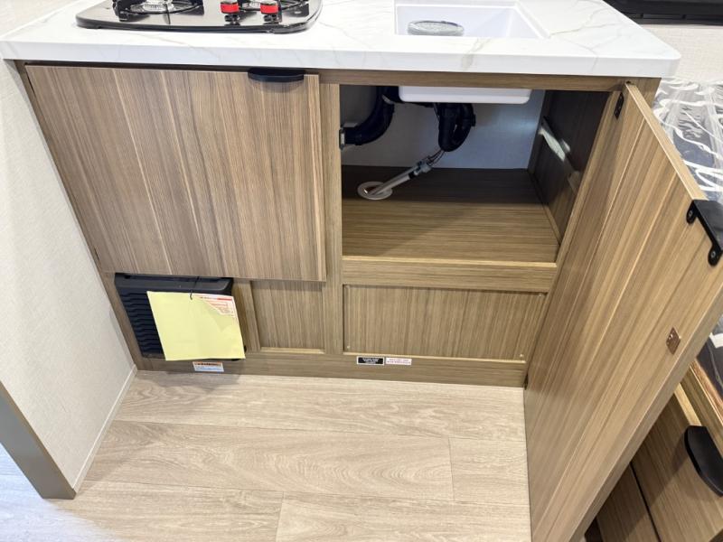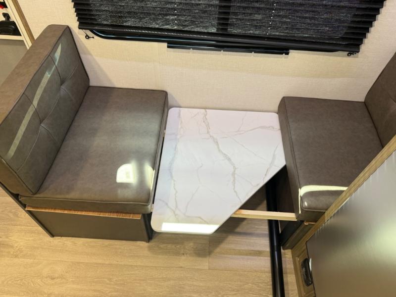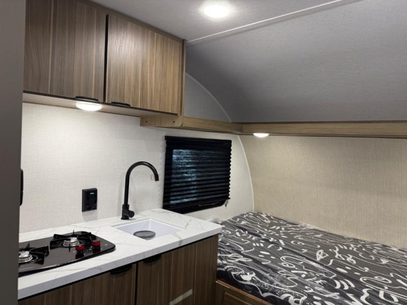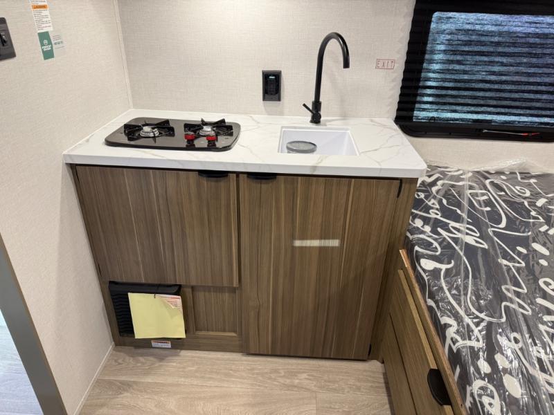 This lightweight travel trailer has everything you need to enjoy camping trips! There is a front east to west custom king bed with storage at the foot of the bed and overhead for your valuables. A private bath includes a toilet and walk-in shower so you can easily get ready each day, and you can prepare your meals on the two-burner cooktop when you get hungry. The booth dinette will provide dining space, along with sleeping space for one to two little ones. Don't let this trailer get away!