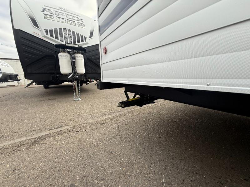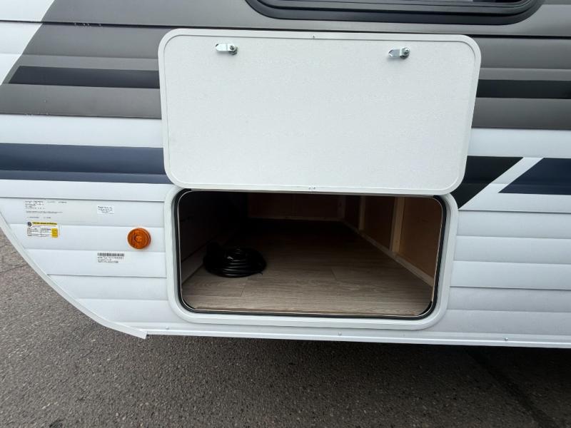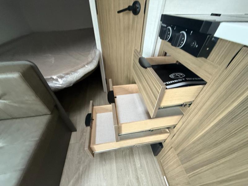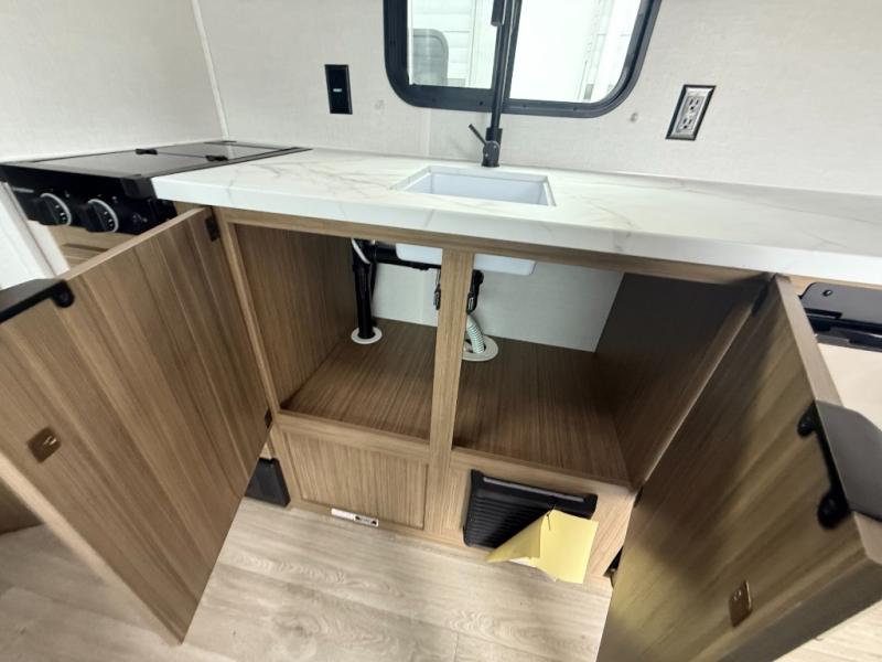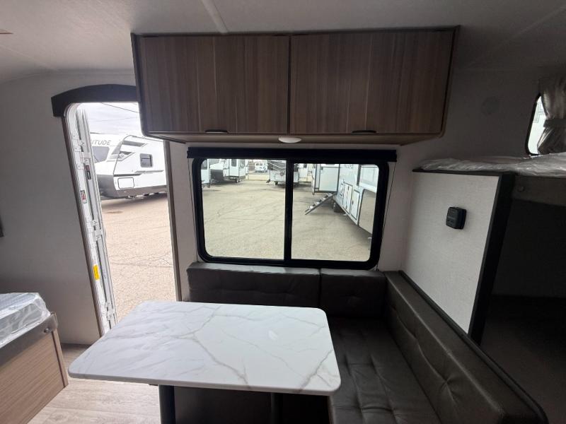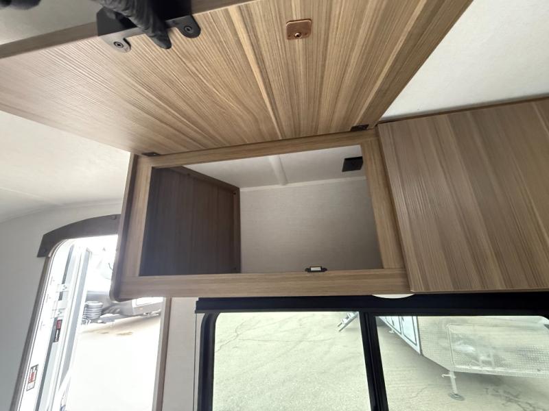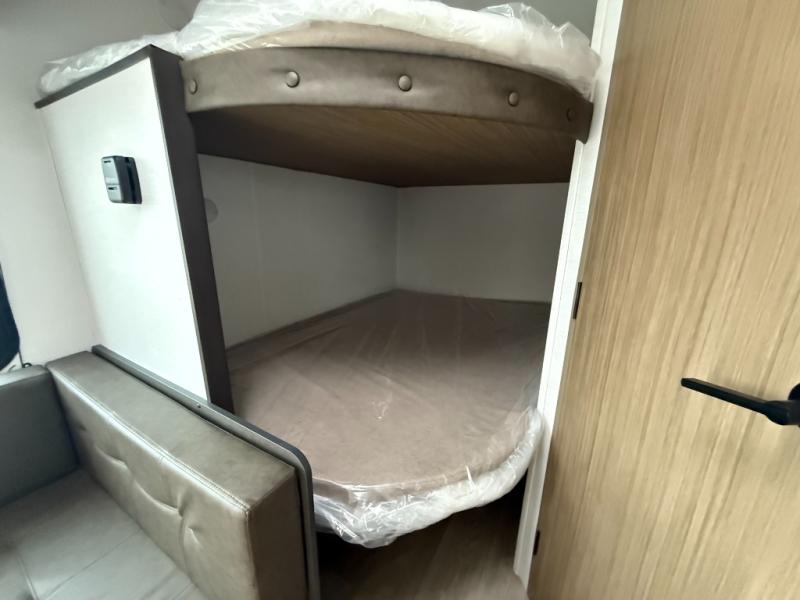 The double-size bunks with storage will be a big selling point in this travel trailer! While your guests take the bunks, you can have the front queen bed all to yourselves, and there is a wardrobe to keep your things organized. A two-burner cooktop will let you make meals each day, and you can dine at the open lounge with a table.
