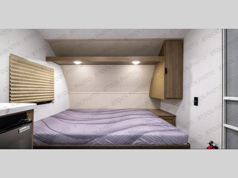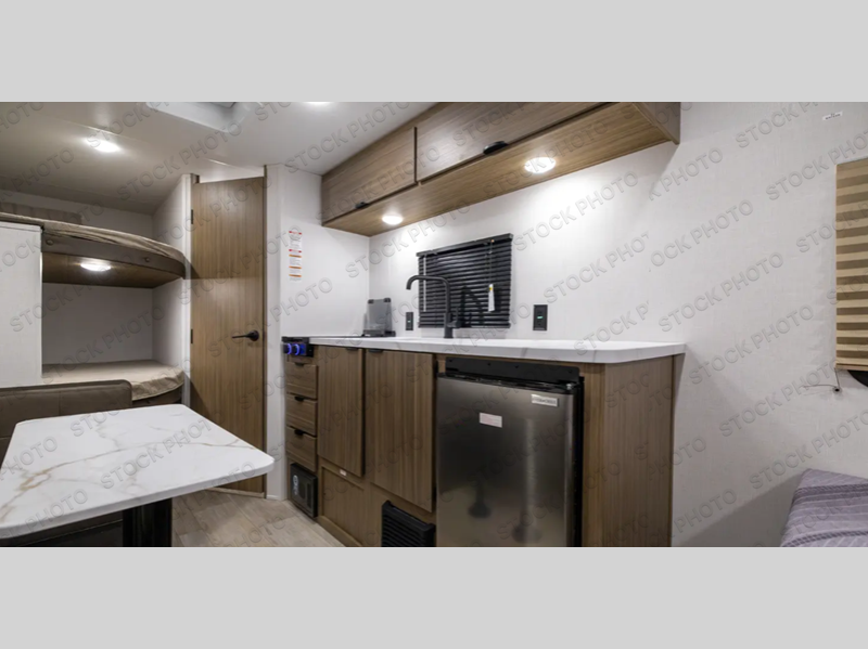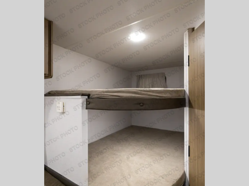 The double-size bunks with storage will be a big selling point in this travel trailer! While your guests take the bunks, you can have the front queen bed all to yourselves, and there is a wardrobe to keep your things organized. A two-burner cooktop will let you make meals each day, and you can dine at the open lounge with a table.