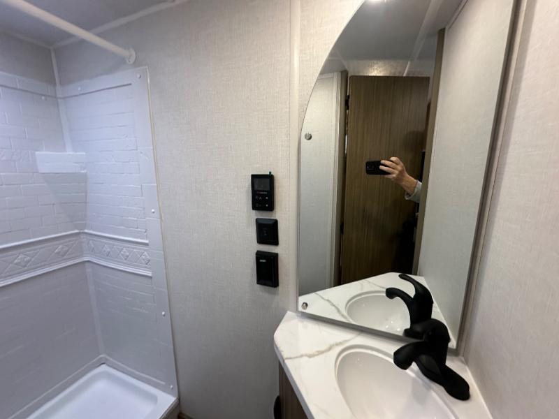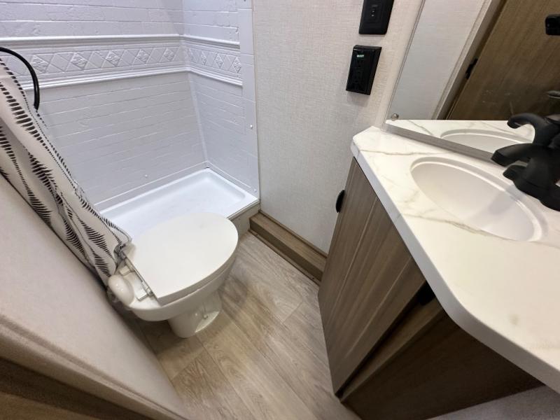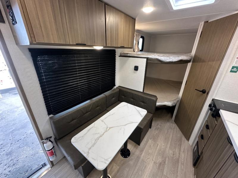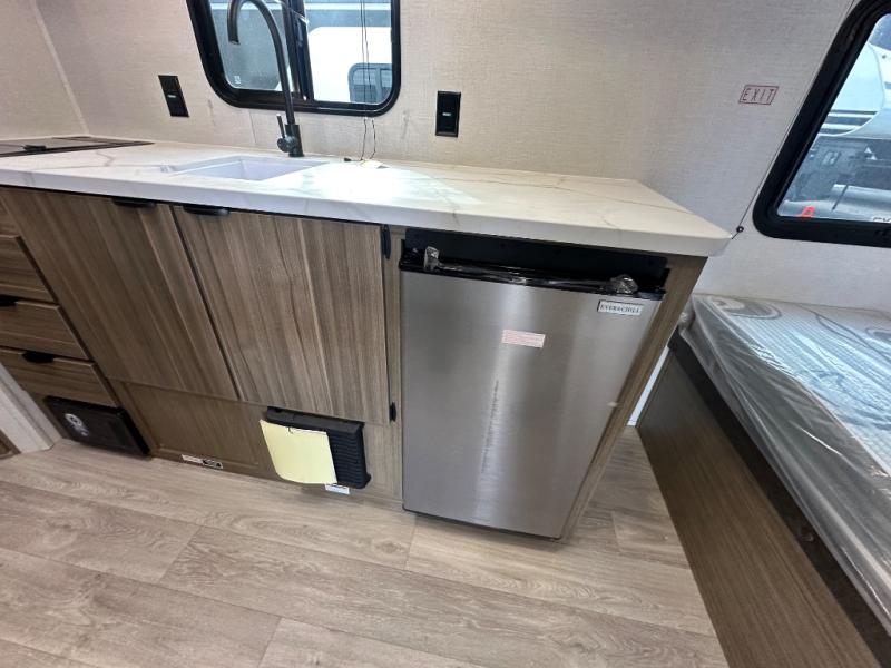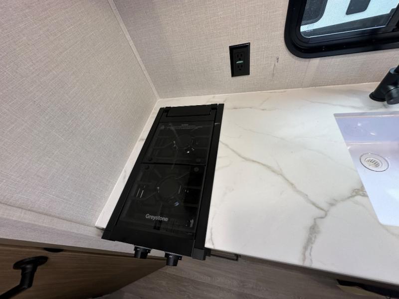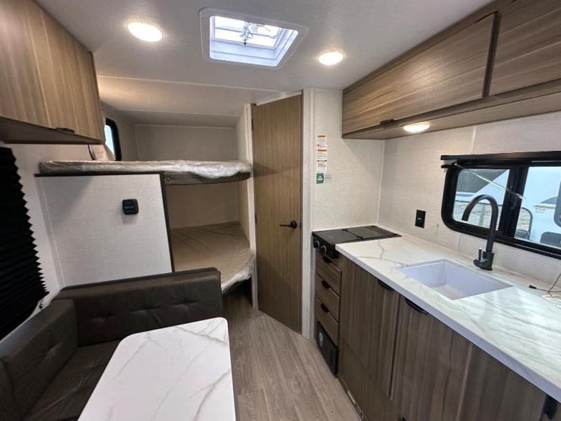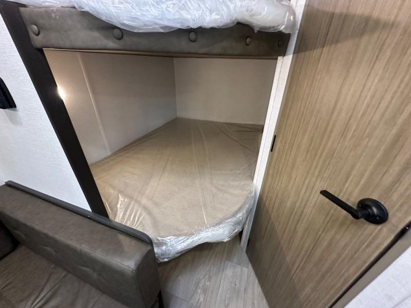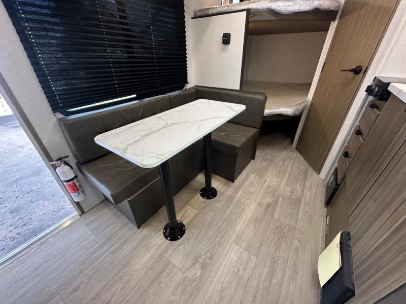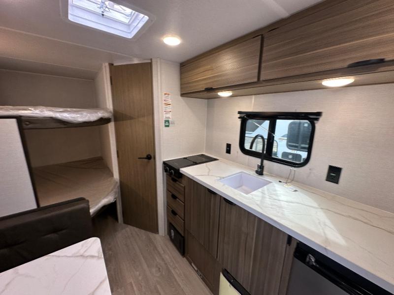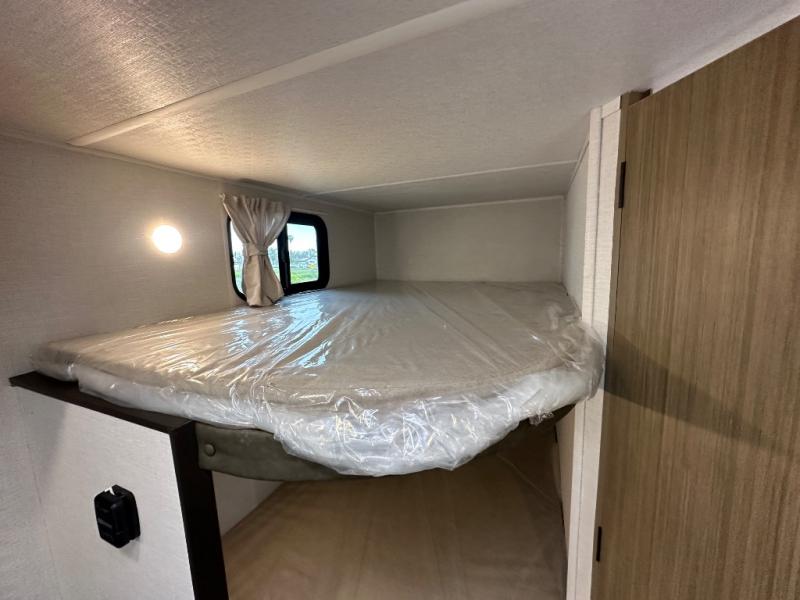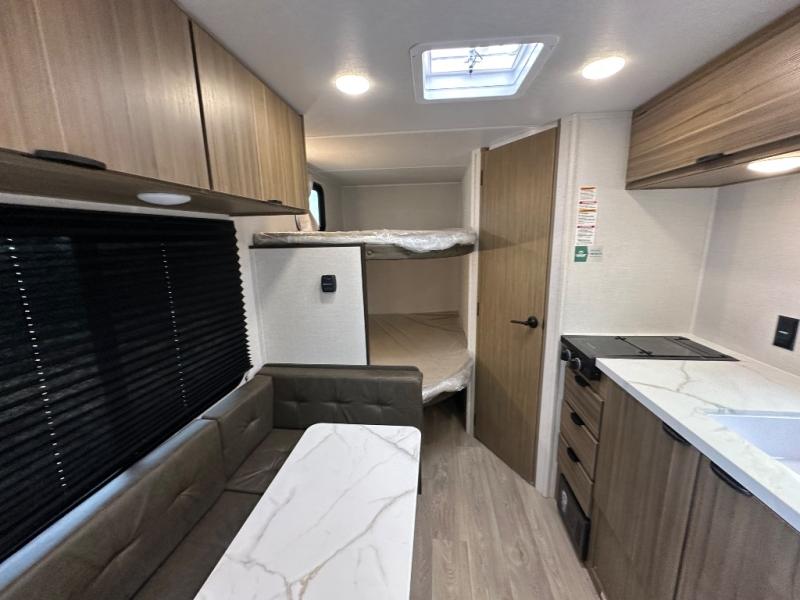 The double-size bunks with storage will be a big selling point in this travel trailer! While your guests take the bunks, you can have the front queen bed all to yourselves, and there is a wardrobe to keep your things organized. A two-burner cooktop will let you make meals each day, and you can dine at the open lounge with a table.