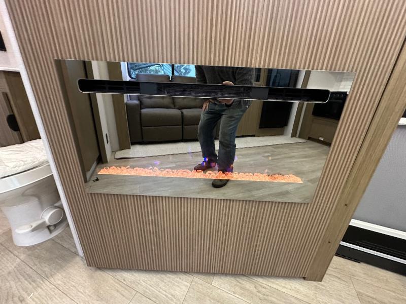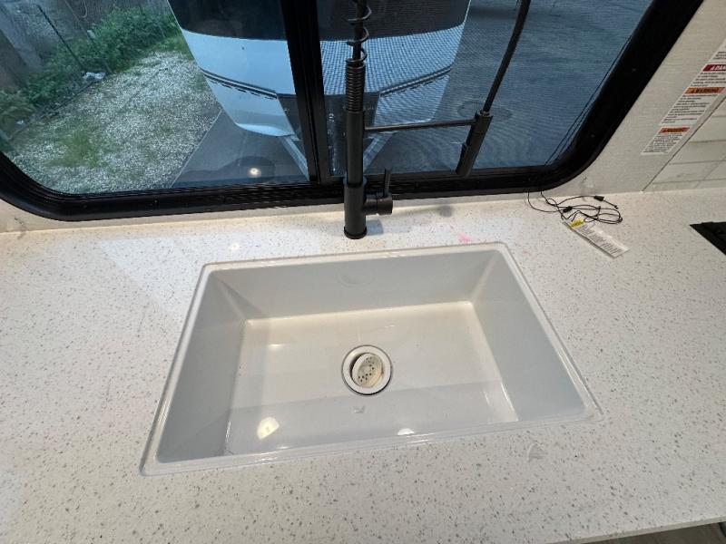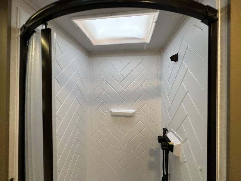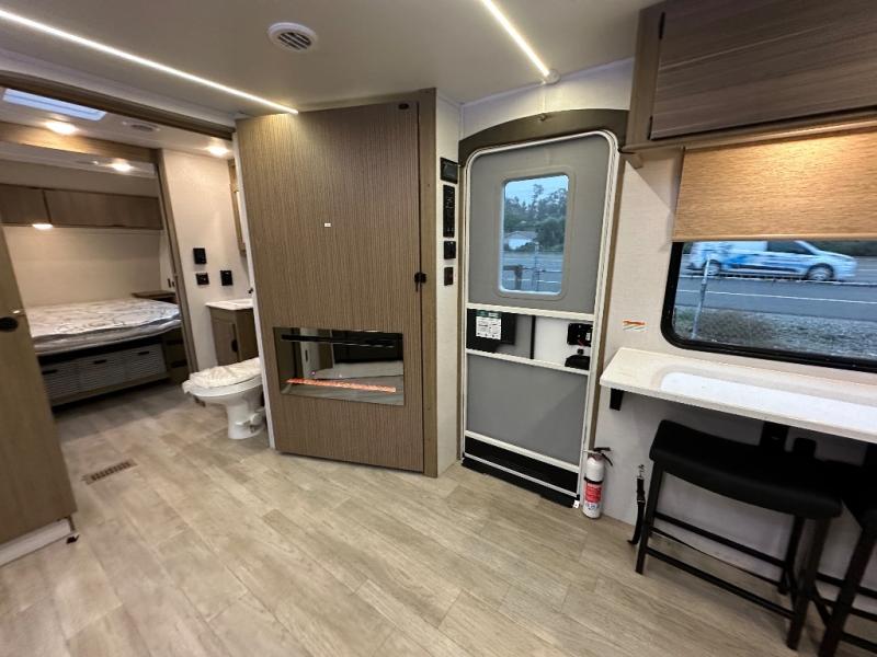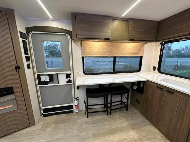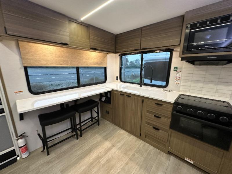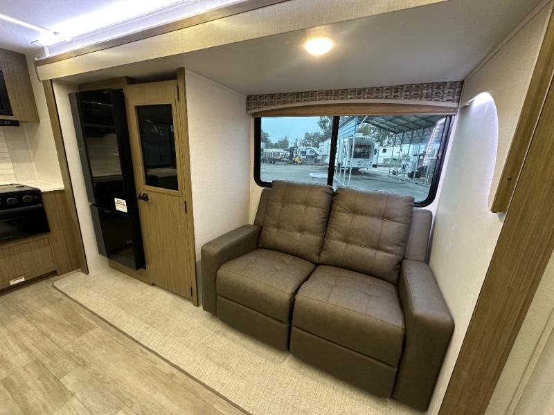 You'll love the amount of counter space you have in this rear kitchen travel trailer! You can whip up your best meals, then enjoy them at the counter with barstools. After dinner, you might want to relax on the theater seat within the large slide, or head outdoors to sit under the 16' patio awning. There is a swiveling entertainment center with shelves behind it where you can keep books, games, or snacks stocked! The walk-thru bath leads you to the front master bedroom where you can get the best night of sleep on the Versa-Tilt custom king bed!