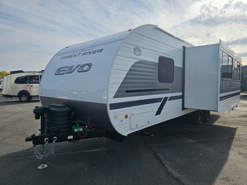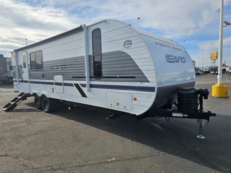Style and function go hand-in-hand with the EVO travel trailers by Forest River. Like with all Forest River products, each unit is built with durable construction materials, providing years of use and countless memories. The eye-catching interiors and attention to detail are what set the EVO apart from the rest. Each model includes full bath and kitchen amenities, cozy seating and sleeping spaces, plus plenty of storage for your personal belongings, camp gear, food and more! There are a variety of floorplans to choose from, ensuring you'll find the EVO that fits your needs best!