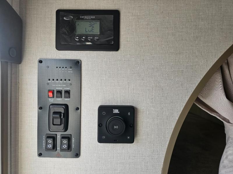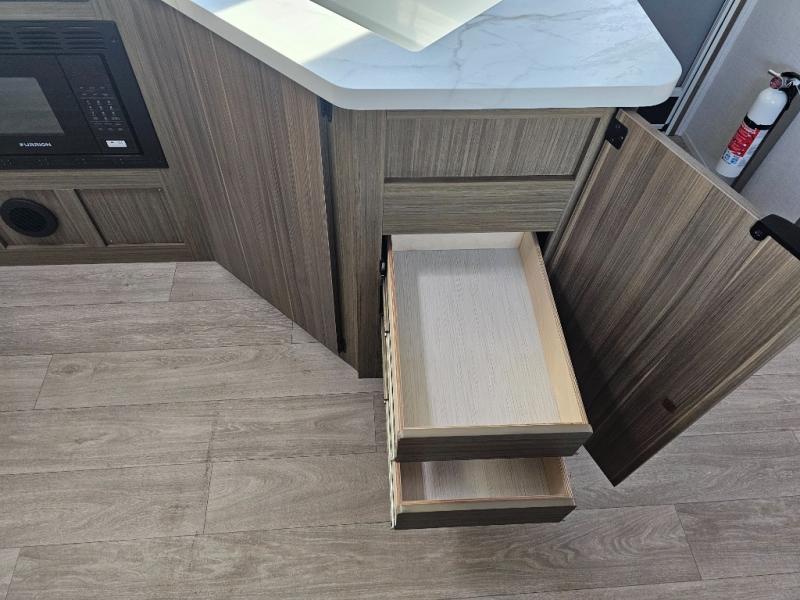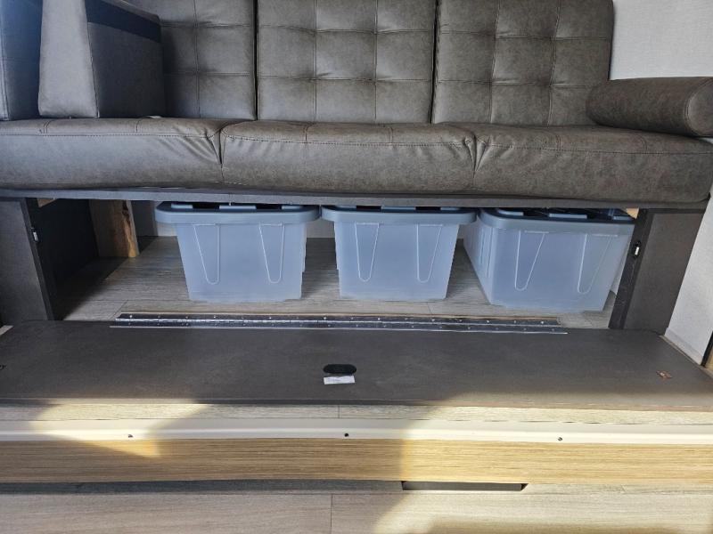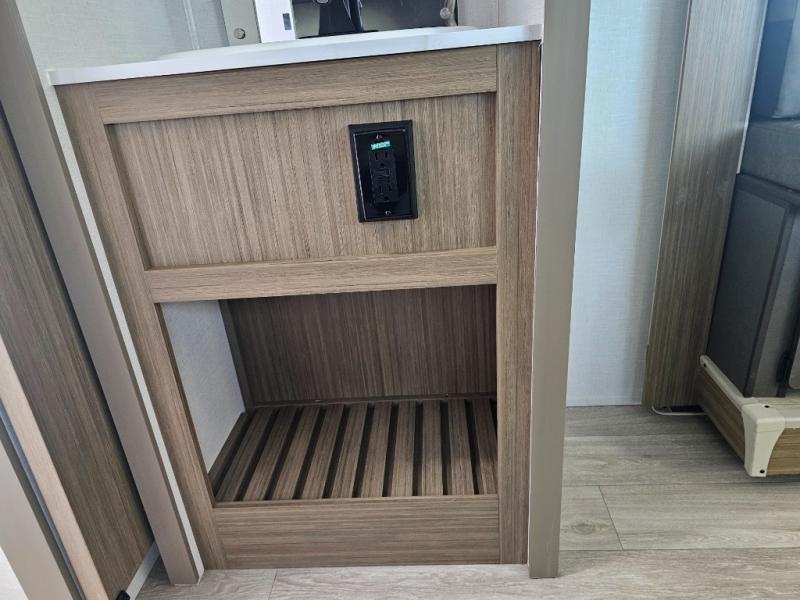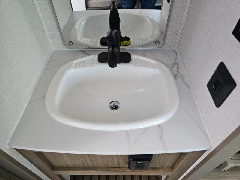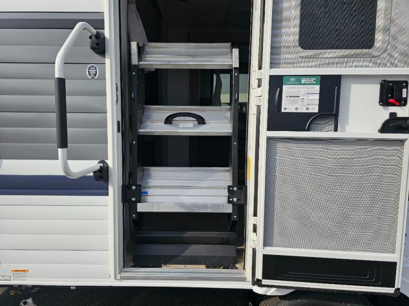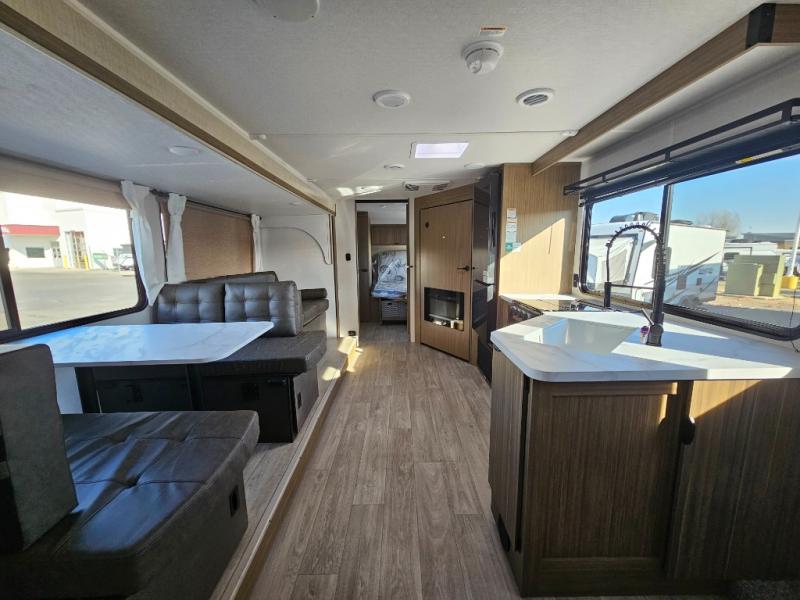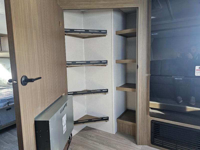 You're sure to make camping memories in this spacious travel trailer! You can easily sleep eight people each night thanks to the double-size bunks, the custom king bed with Versa Tilt in the front bedroom plus the Versa-Lounge within the large slide out! The full kitchen will let you make meals each day, and you'll appreciate the hidden pantry with shelves behind the fireplace. There is also a booth dinette where you can dine together or play a game of cards after dinner is cleaned up, or you may just find yourselves outdoors under the 16' awning. And don't overlook the private bath with a shower and toilet, and the sink i s just outside the room, allowing to people to freshen up at once!