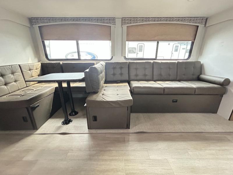If you're needing more interior space and a larger sleeping capacity, your search is over! This trailer can sleep up to ten between the double-size bunks and queen bed, plus the Versa U-Dinette and Versa lounge in the main living area! Whether you're relaxing on the furniture or hanging outside under the 18' power awning, you're sure to enjoy every minute in this unit. At then end of the day, everyone can take turns washing up in the full bath, which also includes one of the dual entry doors for added convenience!