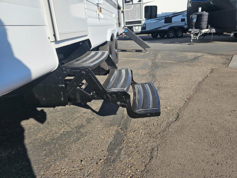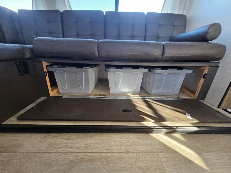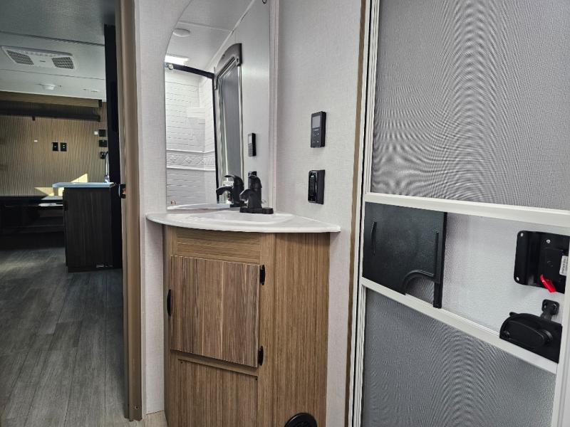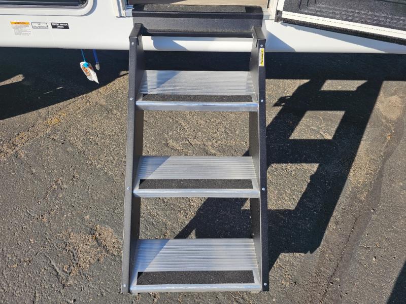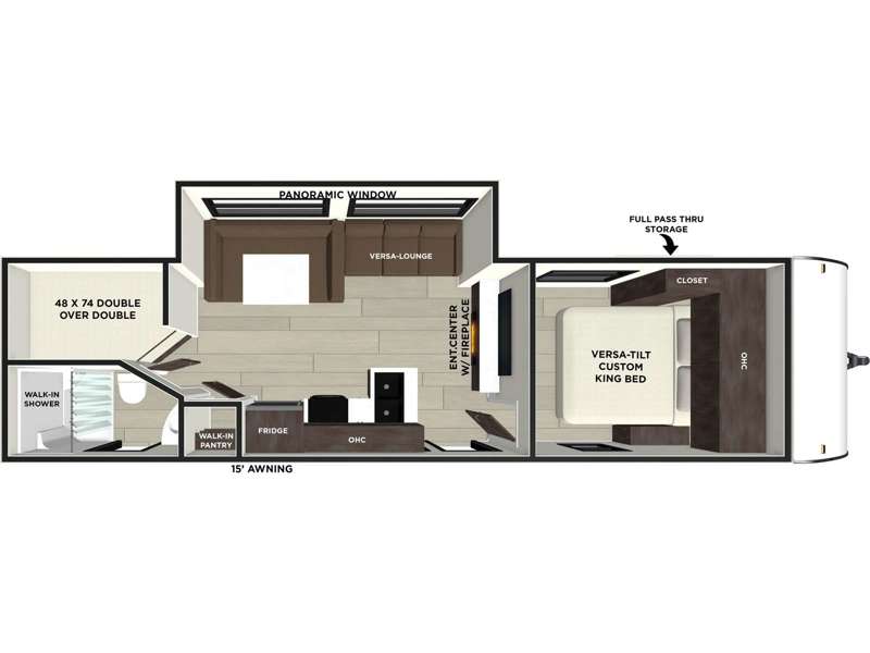 Whether you hike, bike, or relax, you will love being able to return to this trailer with a spacious main living and kitchen area thanks to the large slide out which includes a Versa U-shaped dinette and Versa Lounge to relax on. The fireplace and entertainment center are a bonus, and the chef will enjoy being able to whip up meals while visiting with everyone. The pantry will come in handy as well especially when everyone is with you. The second exterior entry/exit is located in the full bathroom which is super convenient especially when you are outside relaxing under the 15' power awning. When it is time for bed, four can sleep on the double-size bunks, two to four can sleep on the furniture, and the owners will enjoy their privacy in the front bedroom with a custom king versa-tilt bed, dual wardrobes and a handy overhead shelf.