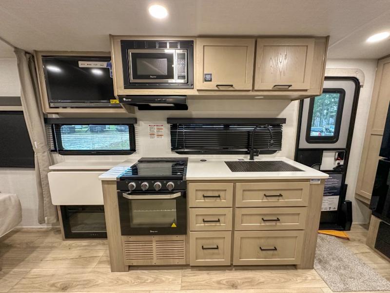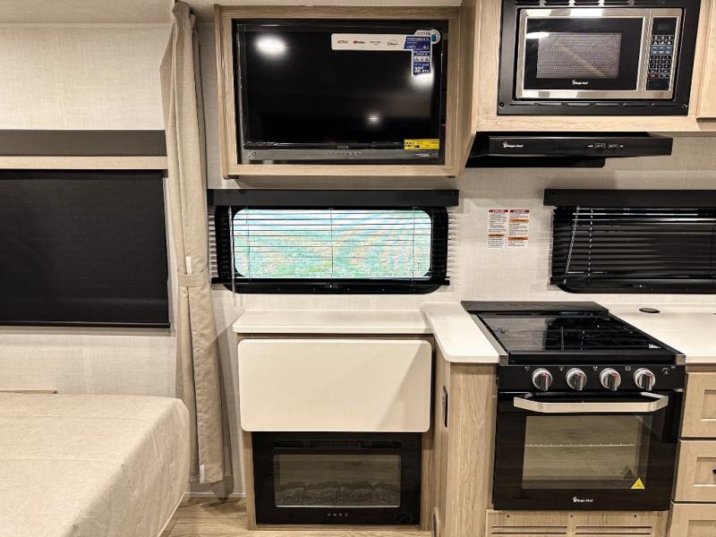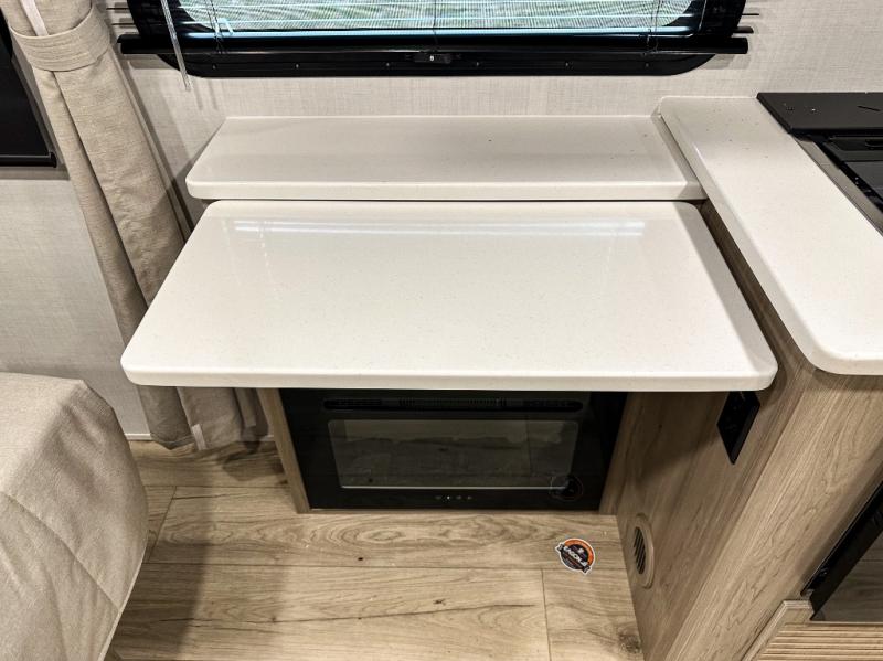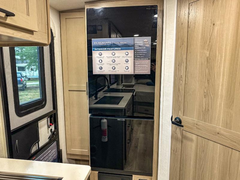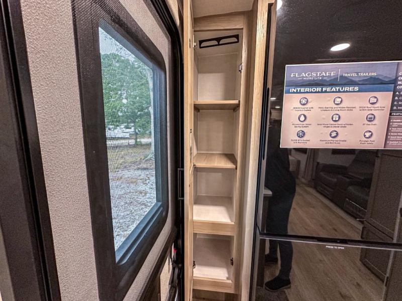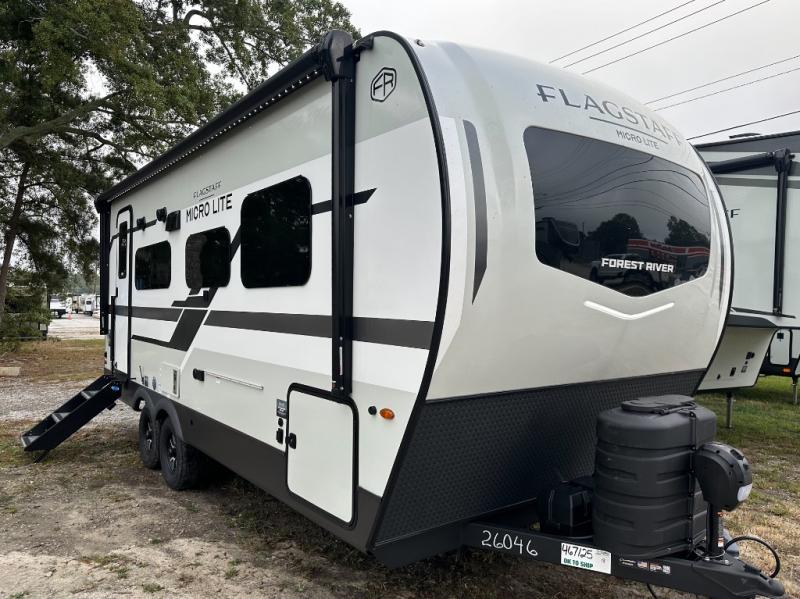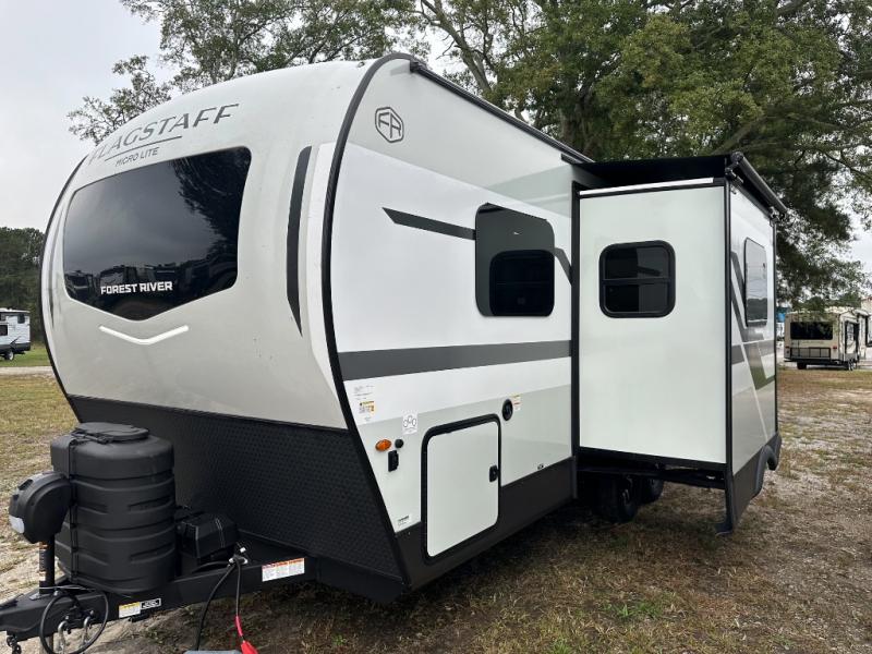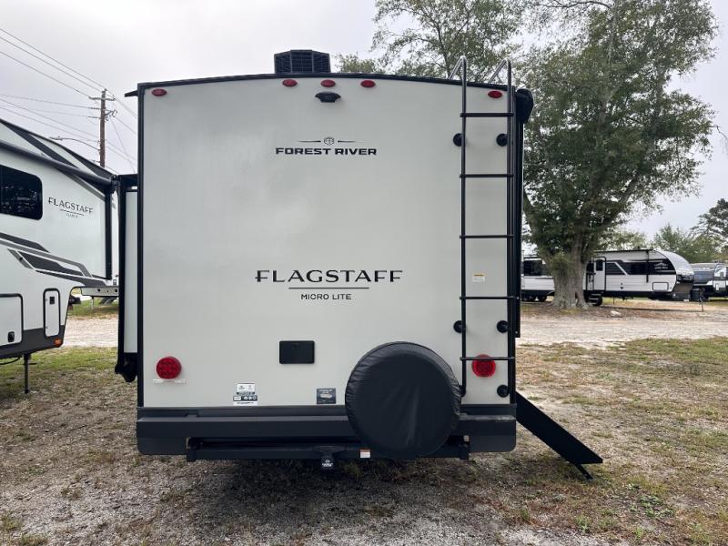 With any Flagstaff Micro Lite travel trailer by Forest River you will enjoy lightweight towing, durable construction, and added interior comforts to make each trip memorable! Each model features RoadTech tire pressure monitoring, Dexter Torflex axles, and nitrogen-filled Goodyear endurance tires for smooth towing from home to campground. The 6-sided aluminum framed construction provides a strong foundation so you can enjoy your RV for years to come, plus the radiant foil in the front cap, underbelly and slides help insulate your trailer. Additional exterior features include a 200W solar panel, back-up camera prep, frameless windows, and slam baggage doors. Each model includes the Great Expectations Package with roller shades, solid surface kitchen countertops, and hidden hinge cabinet doors. There is also an exterior hot/cold water port, outside speakers, a power tongue jack and stabilizer jacks, plus many more conveniences.