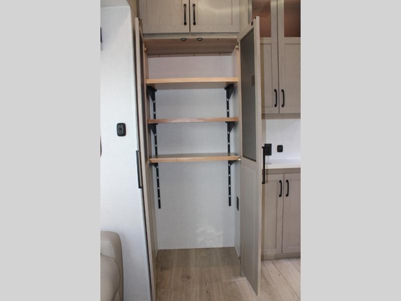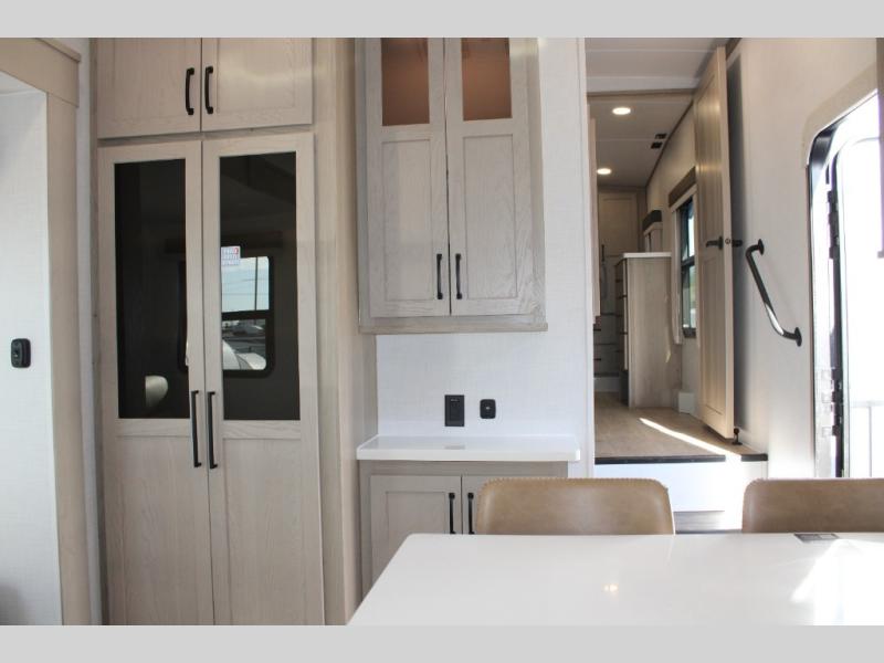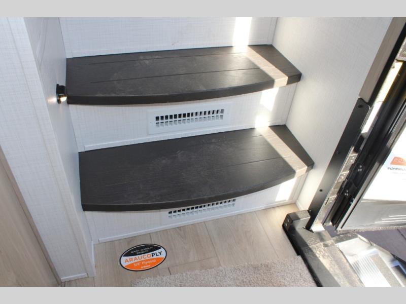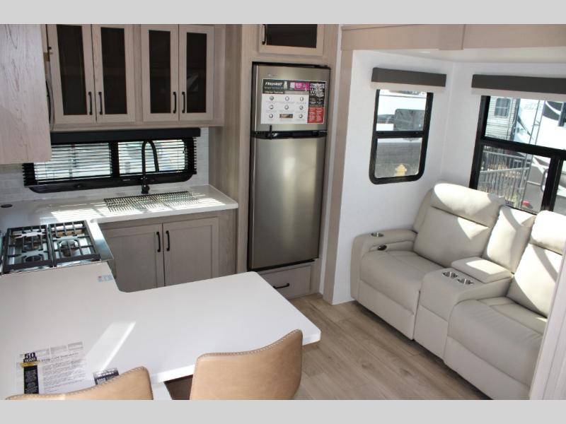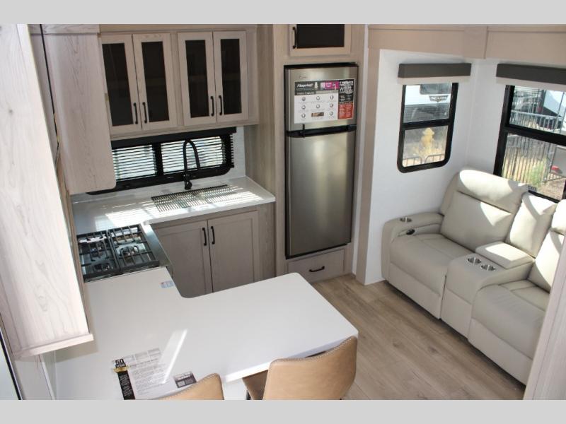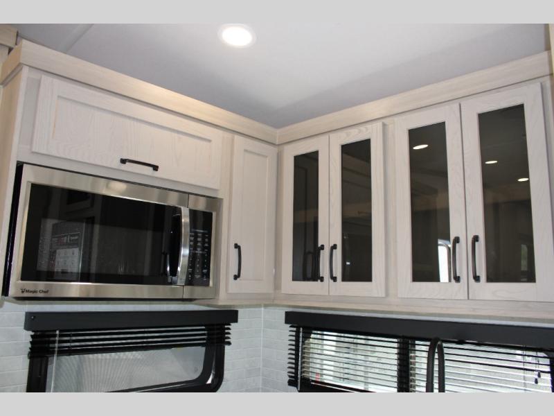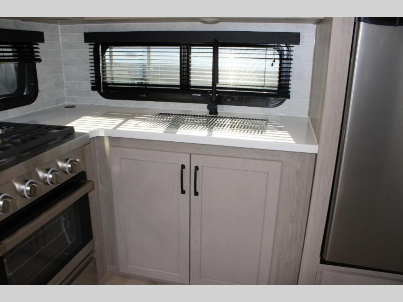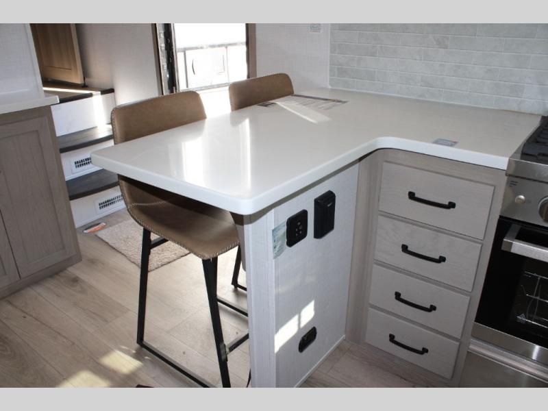 Create your campsite culinary masterpieces in a fully equipped rear kitchen with generous countertop space, an 11 cu. ft. refrigerator, a microwave, and a three-burner cooktop. Everything you need to eat well in the wild. -