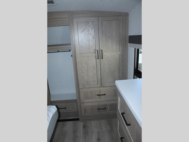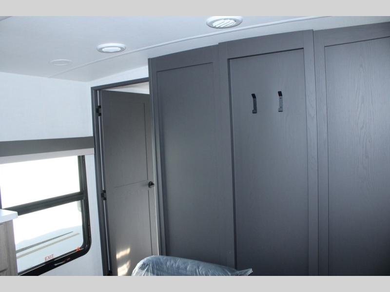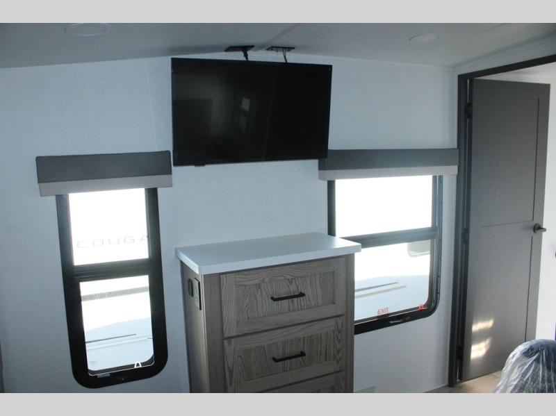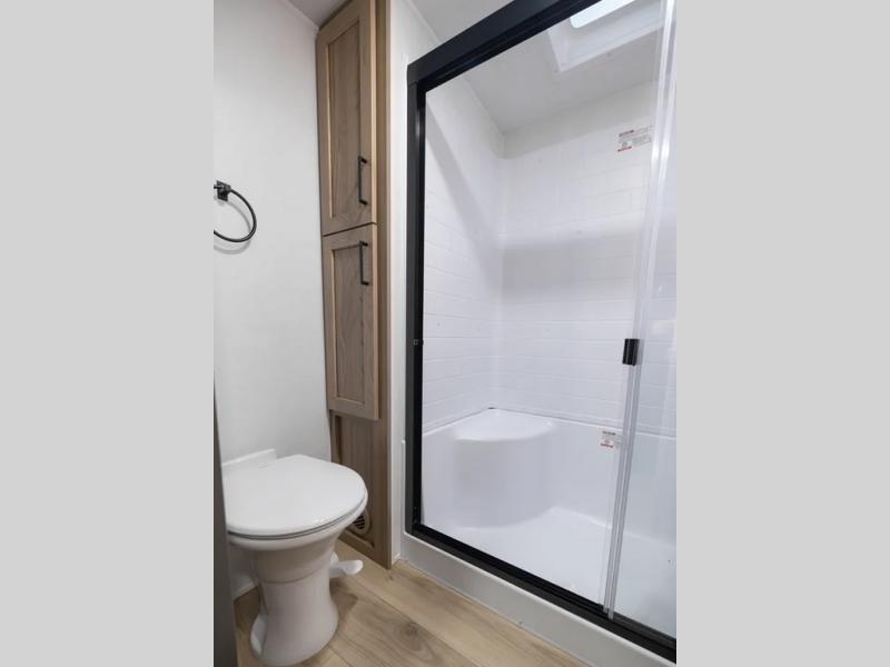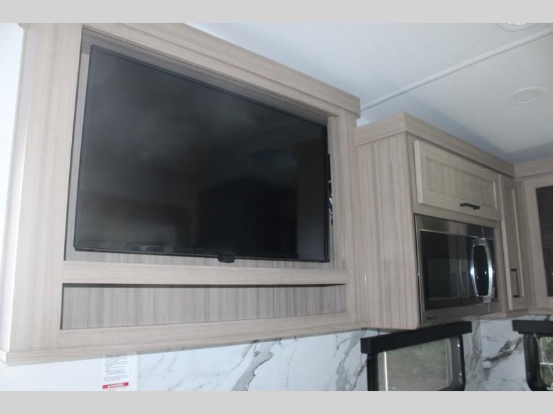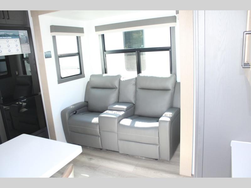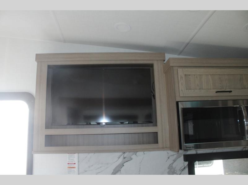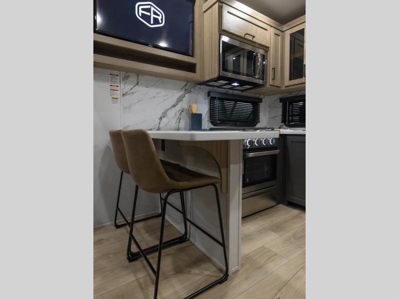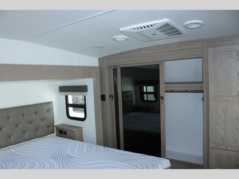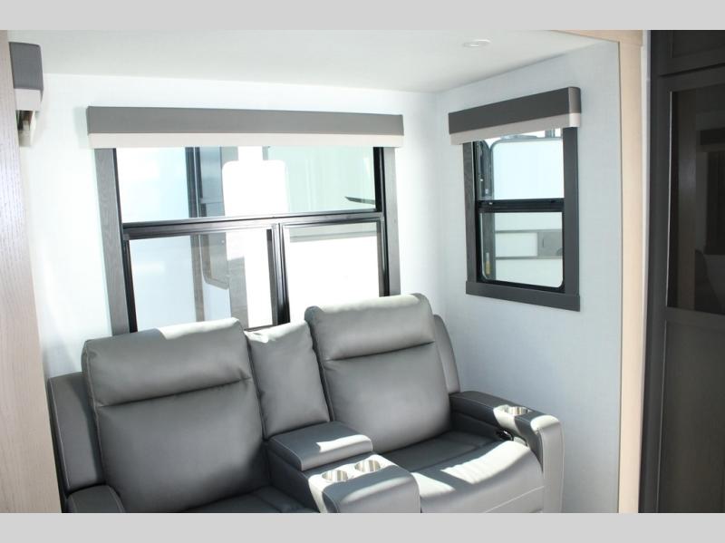 Camp in comfort with your favorite person or your friends in this spacious bedroom and bathroom fifth wheel! From the shower with a seat and linen storage to the slide out queen bed, you will feel right at home. There is also a king bed option if you want more space to stretch out at night. The bedroom also offers a dresser, a front wardrobe with shelves, and an optional TV. The main living area provides a hide-a-bed sofa that sleeps two, a rear kitchen with a 12V refrigerator to store lots of food, and a bar top with seating to dine at. You can watch the Smart TV before going to bed or each morning, and the 20' awning gives you even more living space outdoors protected from the outside elements.