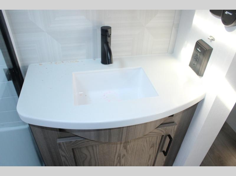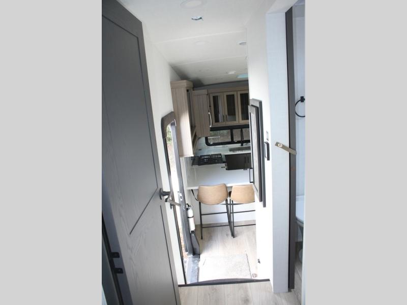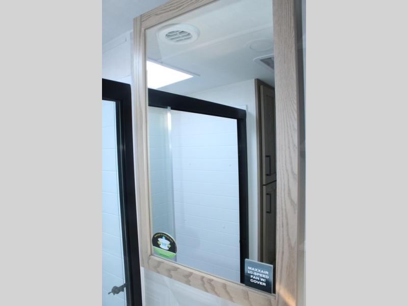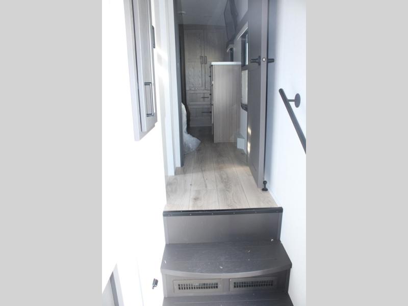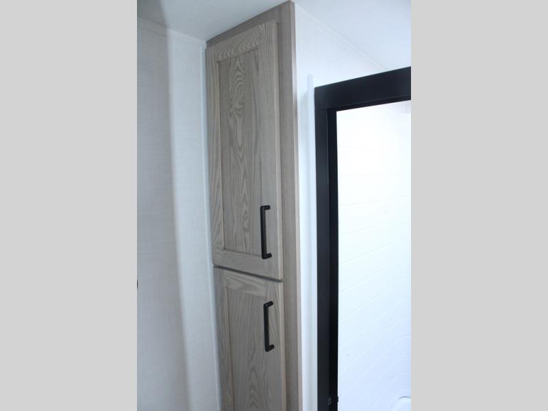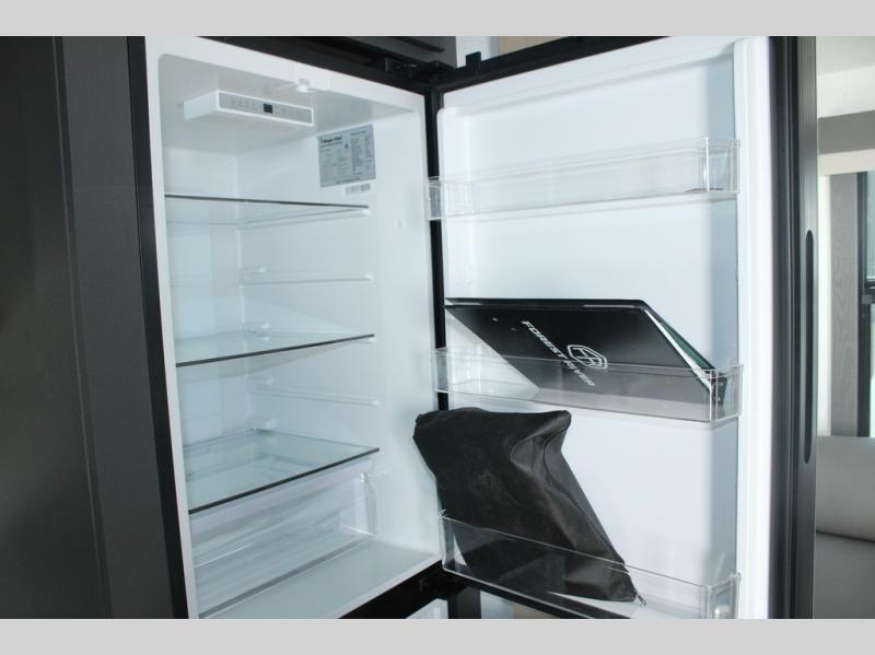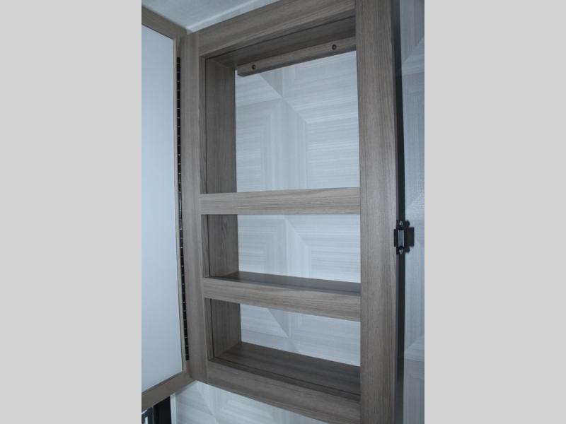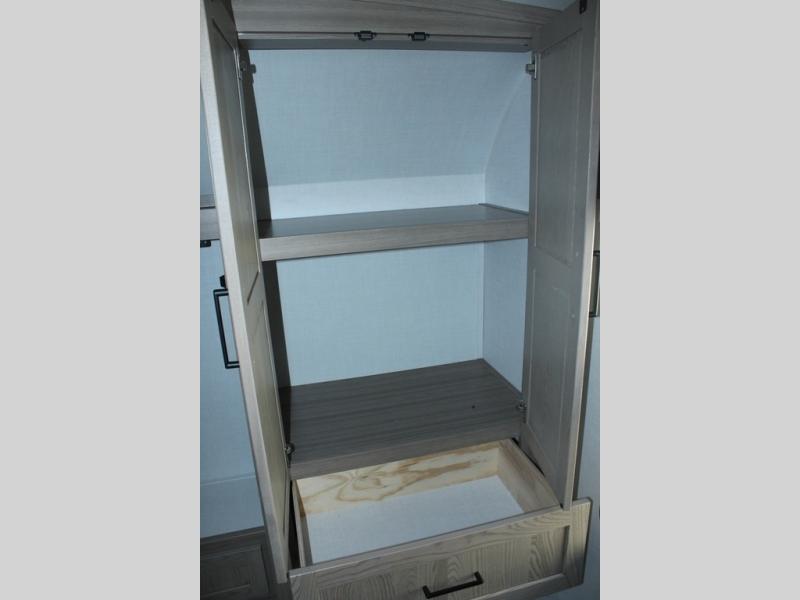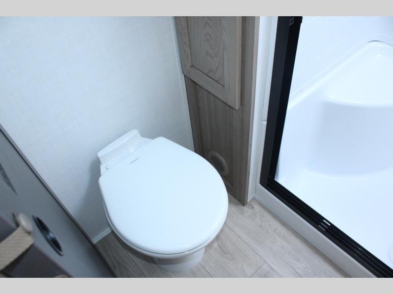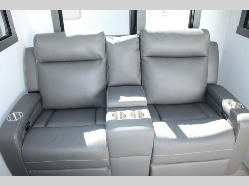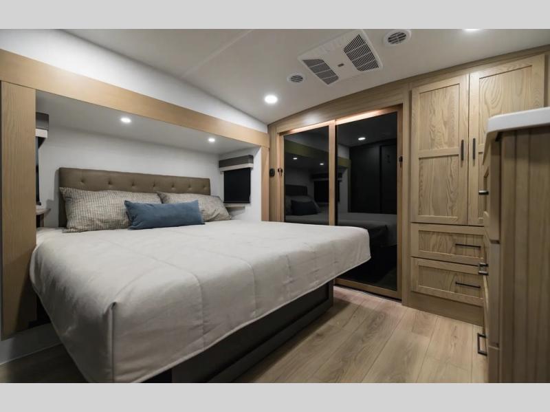 Camp in comfort with your favorite person or your friends in this spacious bedroom and bathroom fifth wheel! From the shower with a seat and linen storage to the slide out queen bed, you will feel right at home. There is also a king bed option if you want more space to stretch out at night. The bedroom also offers a dresser, a front wardrobe with shelves, and an optional TV. The main living area provides a hide-a-bed sofa that sleeps two, a rear kitchen with a 12V refrigerator to store lots of food, and a bar top with seating to dine at. You can watch the Smart TV before going to bed or each morning, and the 20' awning gives you even more living space outdoors protected from the outside elements.
