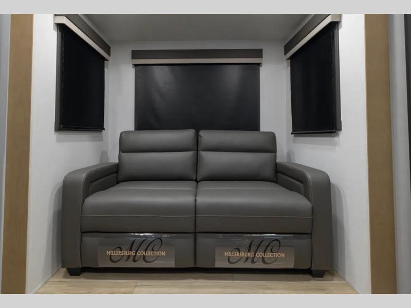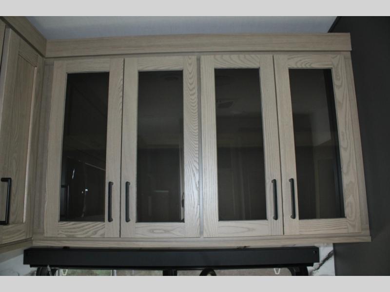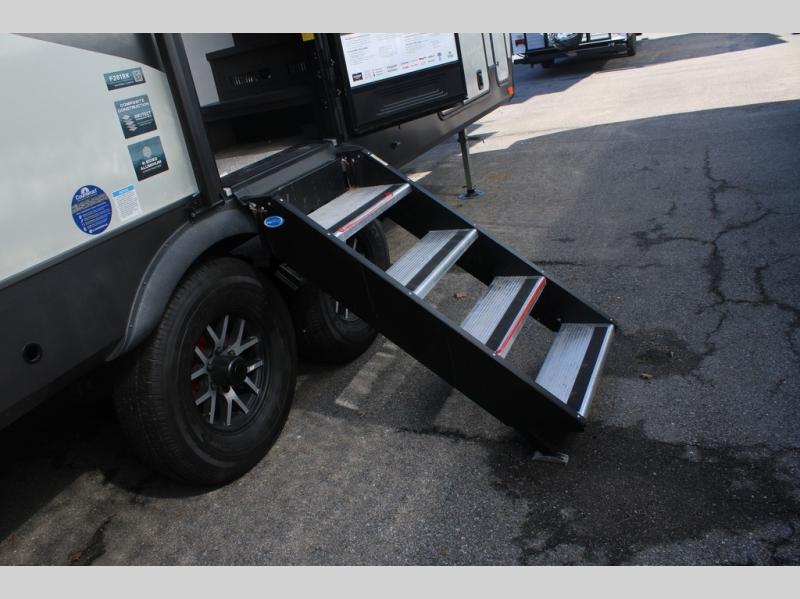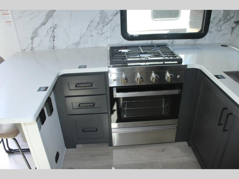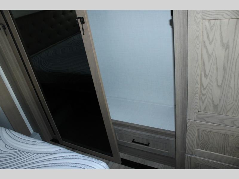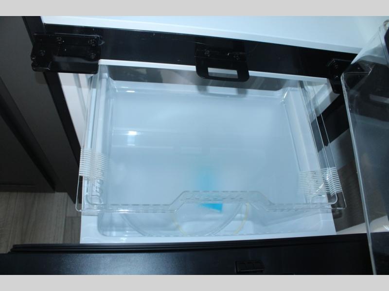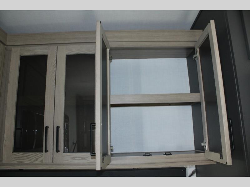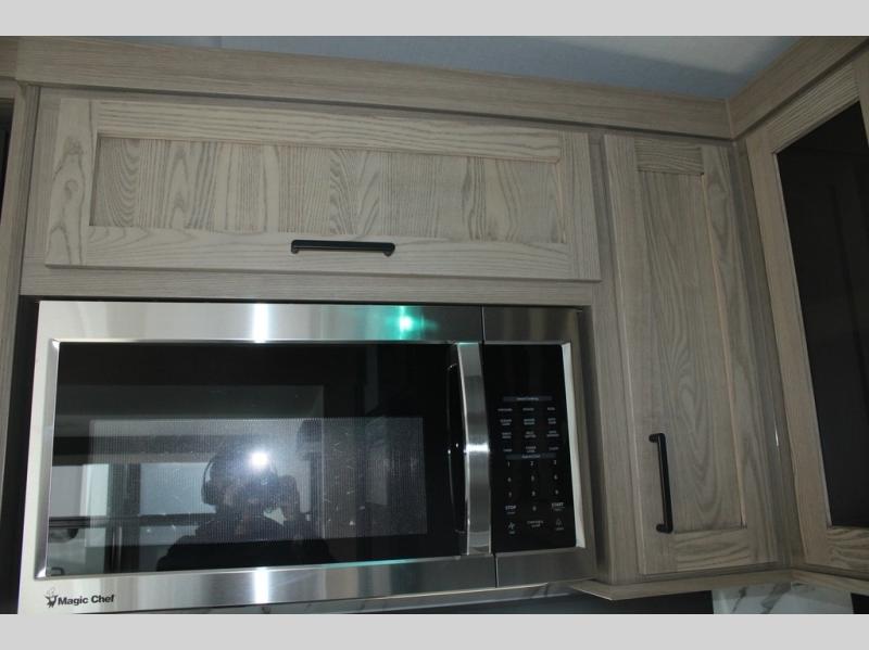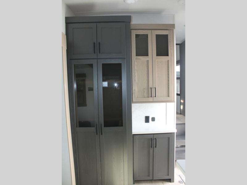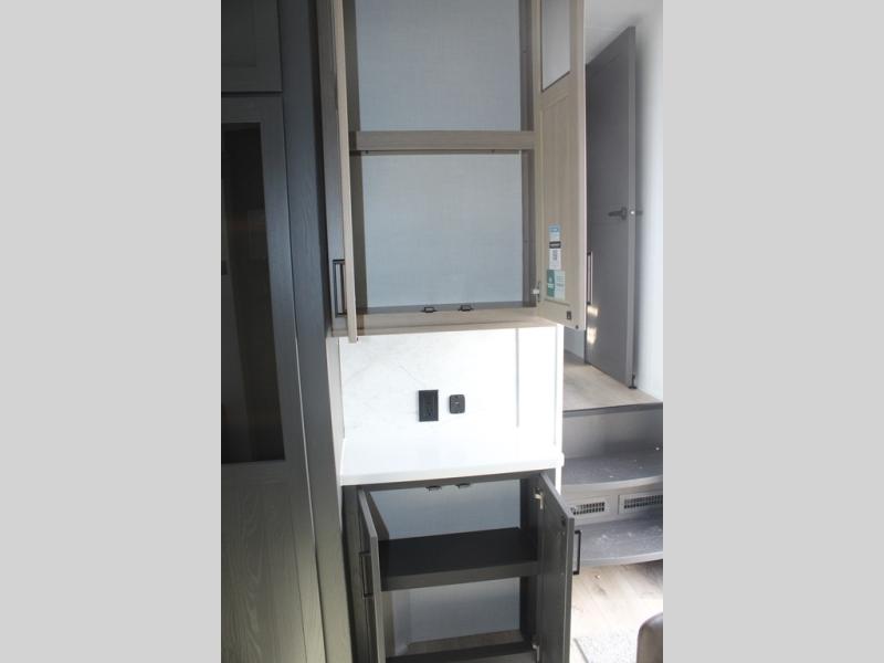 Camp in comfort with your favorite person or your friends in this spacious bedroom and bathroom fifth wheel! From the shower with a seat and linen storage to the slide out queen bed, you will feel right at home. There is also a king bed option if you want more space to stretch out at night. The bedroom also offers a dresser, a front wardrobe with shelves, and an optional TV. The main living area provides a hide-a-bed sofa that sleeps two, a rear kitchen with a 12V refrigerator to store lots of food, and a bar top with seating to dine at. You can watch the Smart TV before going to bed or each morning, and the 20' awning gives you even more living space outdoors protected from the outside elements.