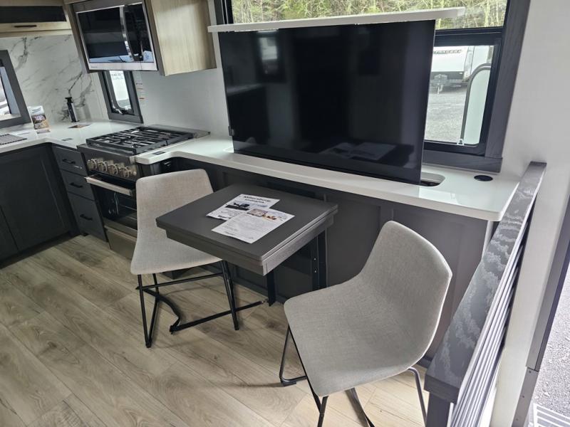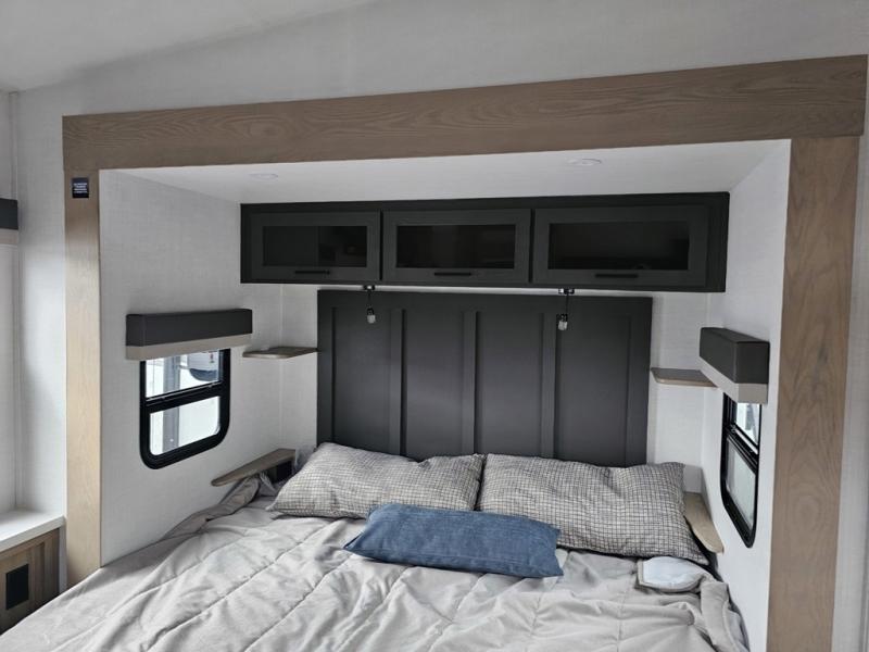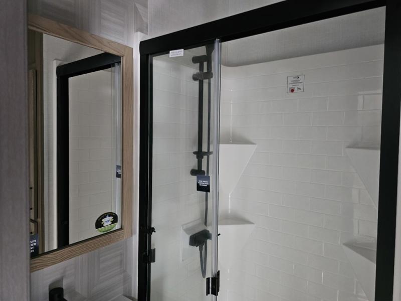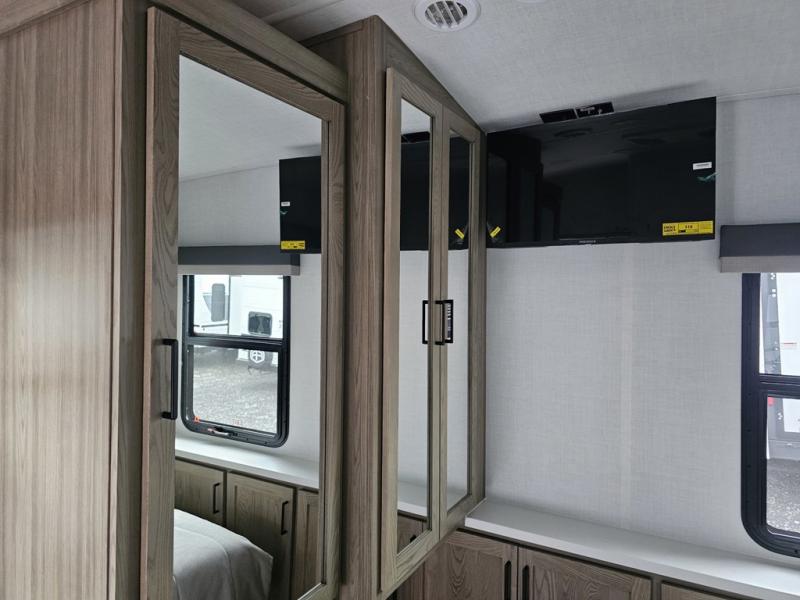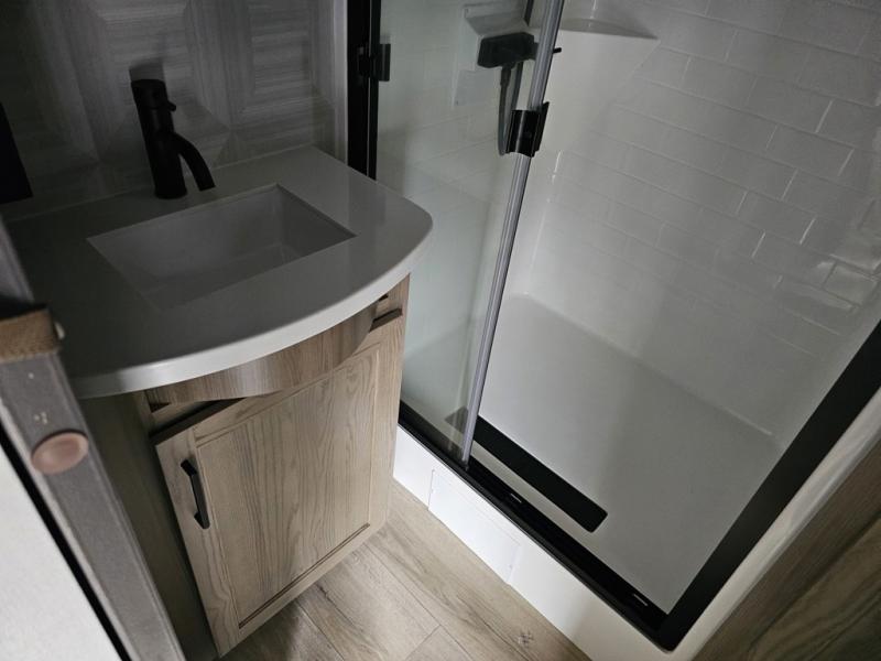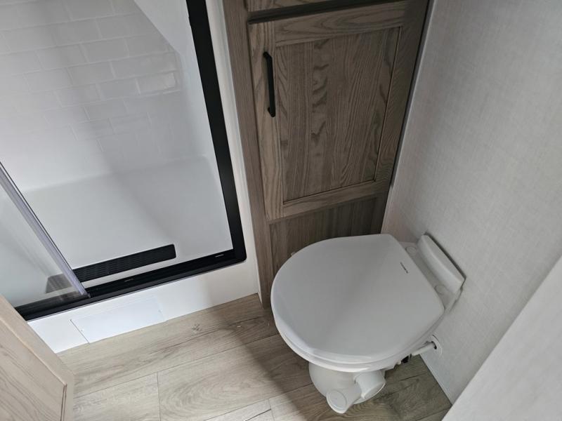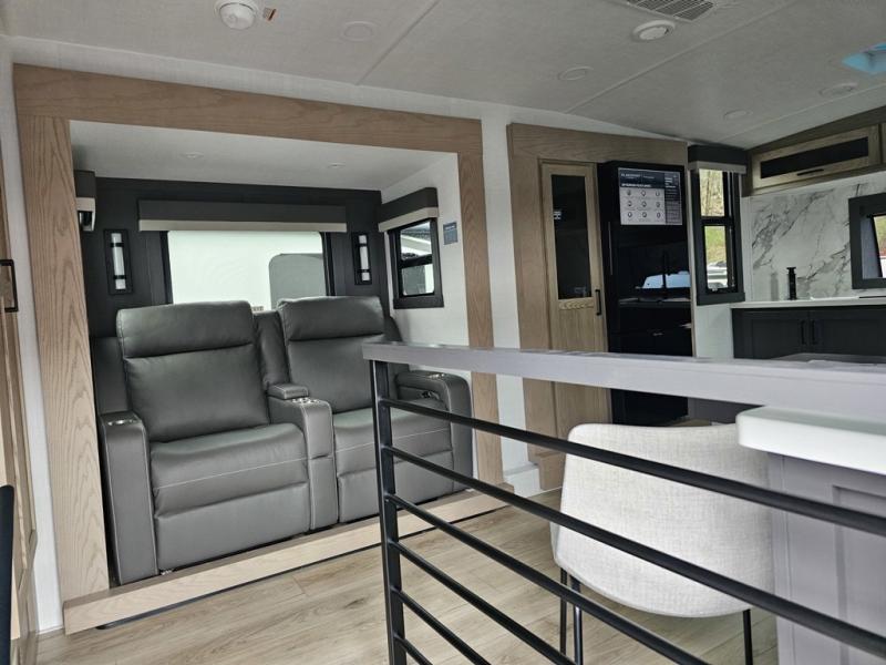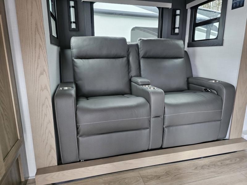 Designed for campers who want residential comfort with a layout that feels open, inviting, and easy to live in. The living area is set up for relaxing just as much as entertaining, making it a great fit for extended stays or weekends when you want to truly unwind. The theater seating gives you a comfortable spot to kick back, whether you’re watching a movie or winding down after a long day. The bedroom features a queen bed, creating a cozy retreat that still leaves room to move comfortably around the space. In the rear bedroom, a dedicated vanity adds a touch of everyday convenience, giving you a practical place. The full bathroom offers everything you need in one well-designed space, helping the coach feel more like home than a camper. Outside, generous pass-thru storage makes it easy to bring along larger gear, tools, or outdoor furniture while keeping the interior clean and uncluttered.