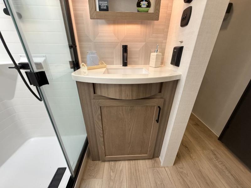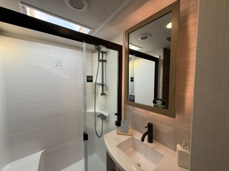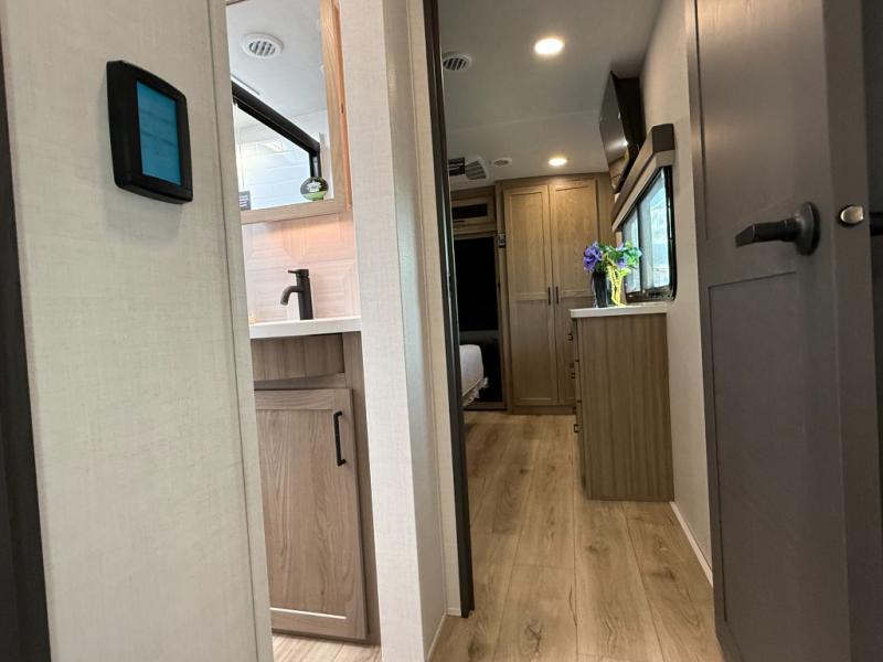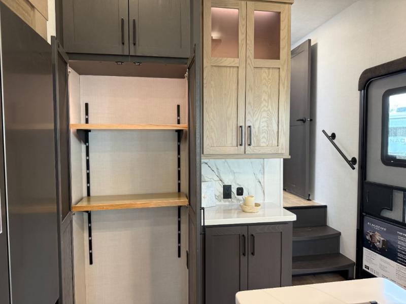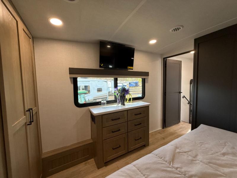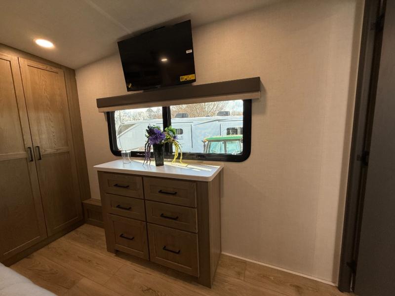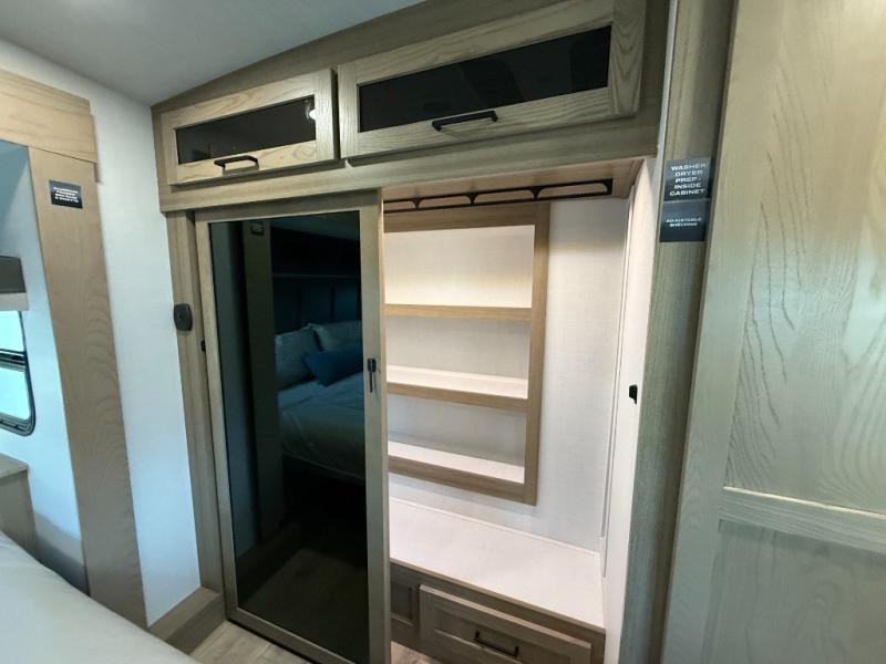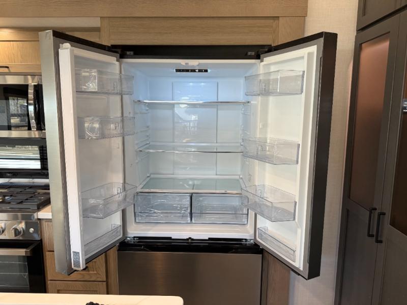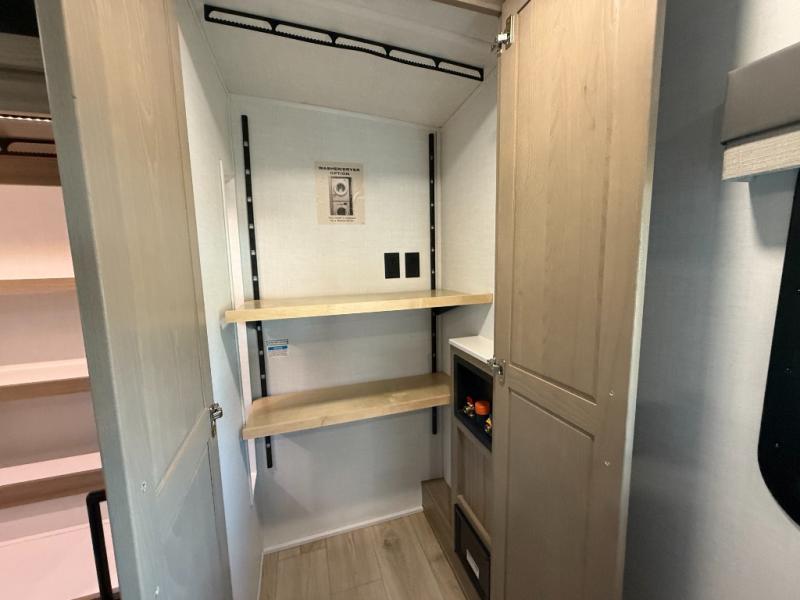 Get ready to enjoy the outdoors while inside with the spacious windows in both the rear and the door side slide of this fifth wheel. The main living area offers dual opposing slides giving you a great place to invite other RVers over to visit, eat, and even play cards. There is seating for nine from the table and chairs with a bench, the theater seats, and the rear hide-a-bed sofa. The cook will have a 12V refrigerator to store lots of drinks and cold food, plus a pantry, and the center island offers extra counter space plus seating. After everyone has left, retire to the front bedroom with a king bed slide, dresser, wardrobe, plus washer and dryer prep if you plan to go full-time!