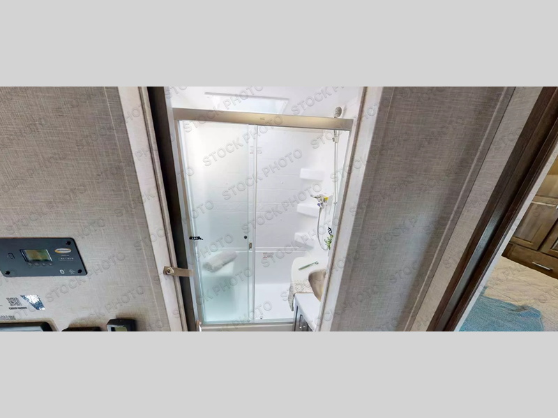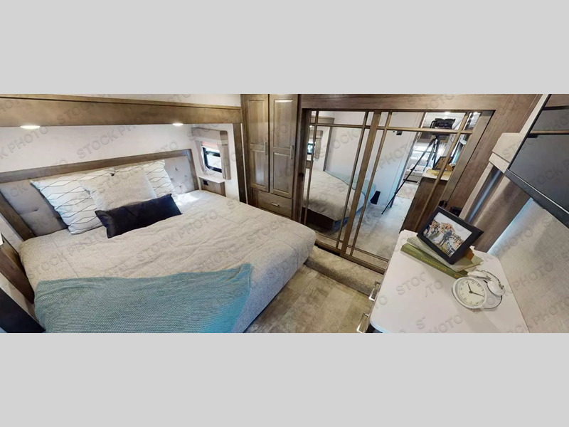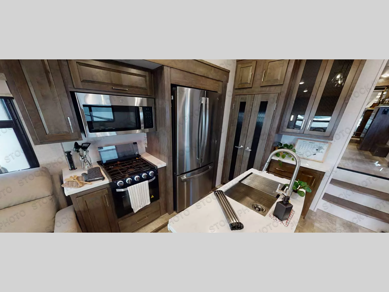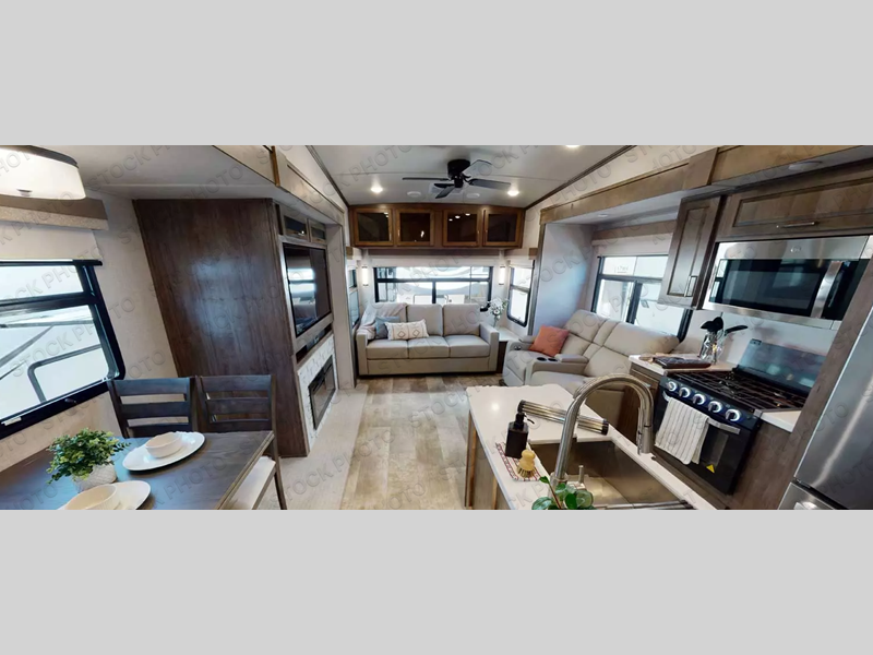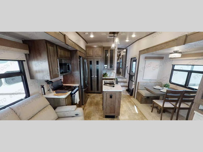 Get ready to enjoy the outdoors while inside with the enormous windows in both the rear and the door side slide of this fifth wheel. The spacious main living area offers dual opposing slides giving you a great place to invite other RVers over to visit, eat, and even play cards. There is seating for nine on the 39" chairs and bench, the theater seats, and the rear hide-a-bed sofa. The cook will have a large refrigerator to store lots of drinks and cold food, plus a pantry, and the center island offers extra counter space plus seating. After everyone has left, retire to the front bedroom with a king bed slide, a shirt closet, a wardrobe with washer/dryer prep, plus more storage and a TV option.