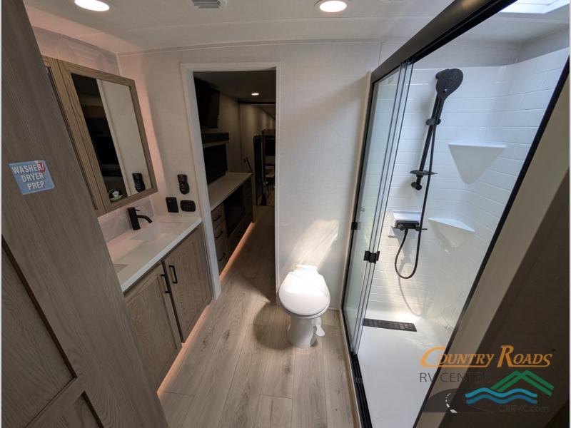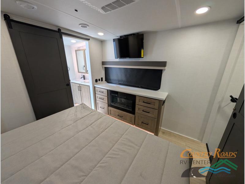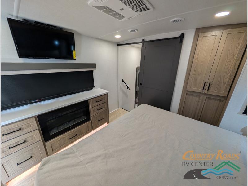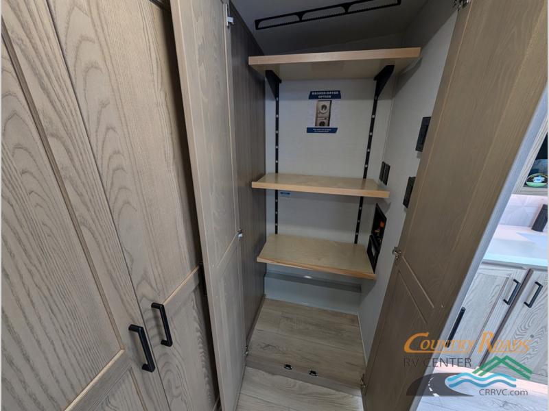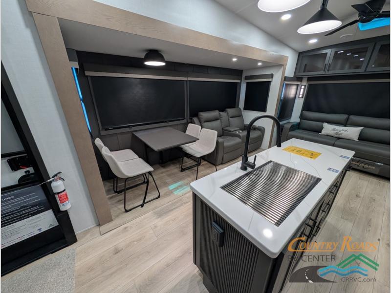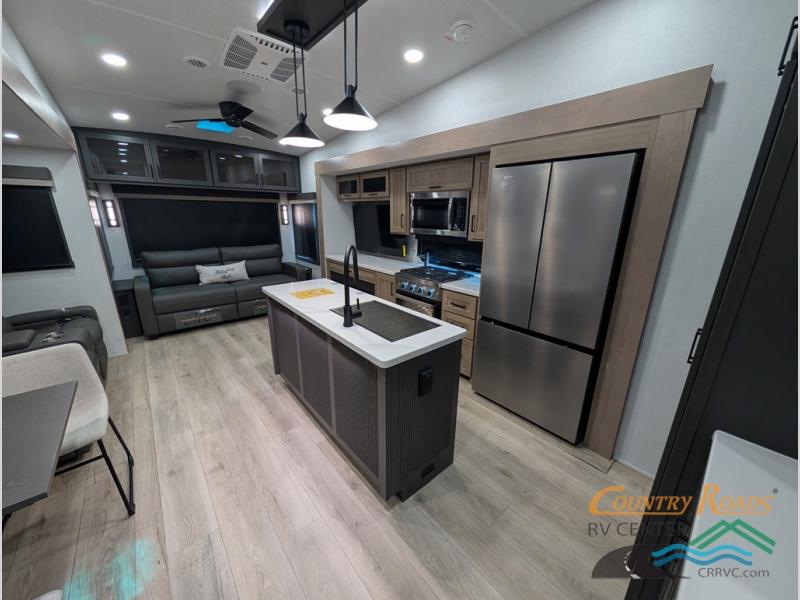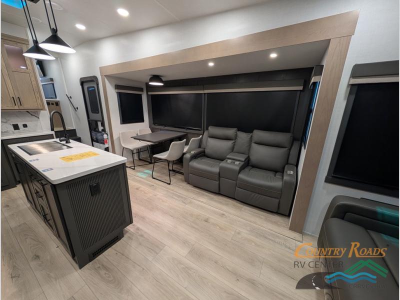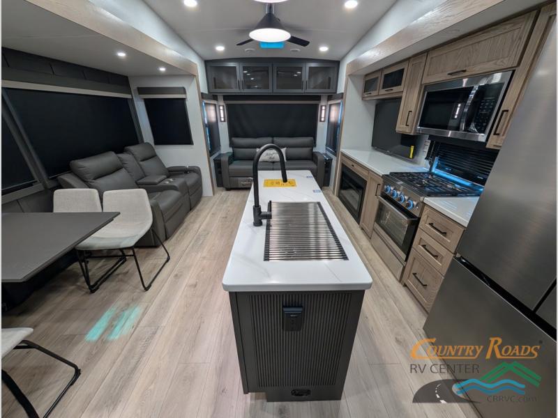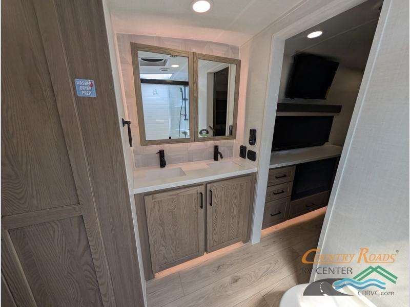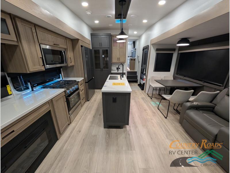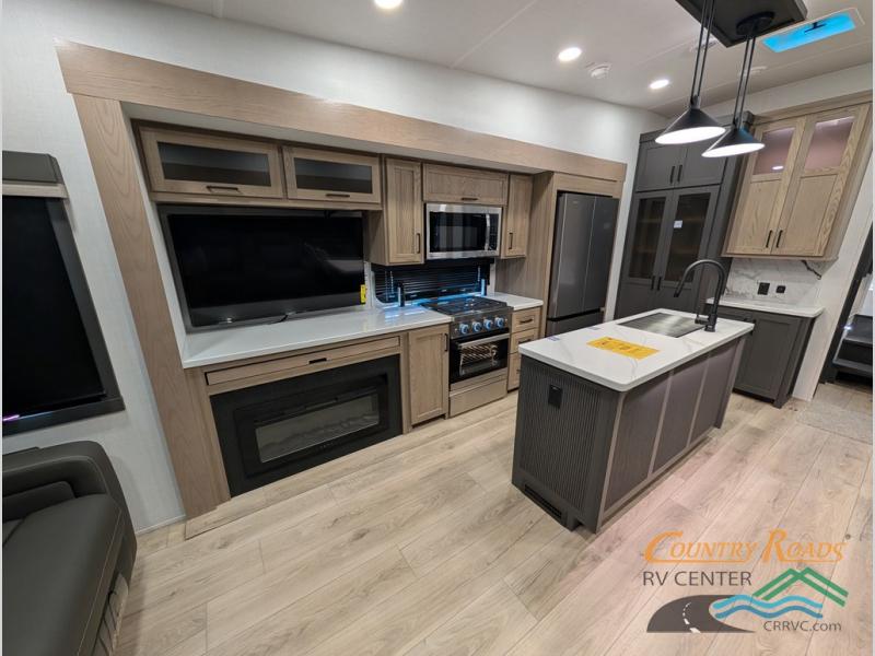 You can't go wrong when choosing this spacious fifth wheel! The master bedroom features a king bed slide out, wardrobe, and a dresser with a fireplace, and the full front bath is sure to bring comfort. There are dual bath sinks here, tons of storage, and even washer and dryer prep if you choose to add these appliances. The mid-coach half bath will come in handy if you have guests staying over on the rear hide-a-bed sofa. You'll also find a theater seat and a rotating table and chairs where you can dine and relax each day, plus there is a large kitchen island so the chef of your group has plenty of prep space. A Smart TV and fireplace will make your space feel more like home, and there is a pull-out desk here if you need to get some work done!