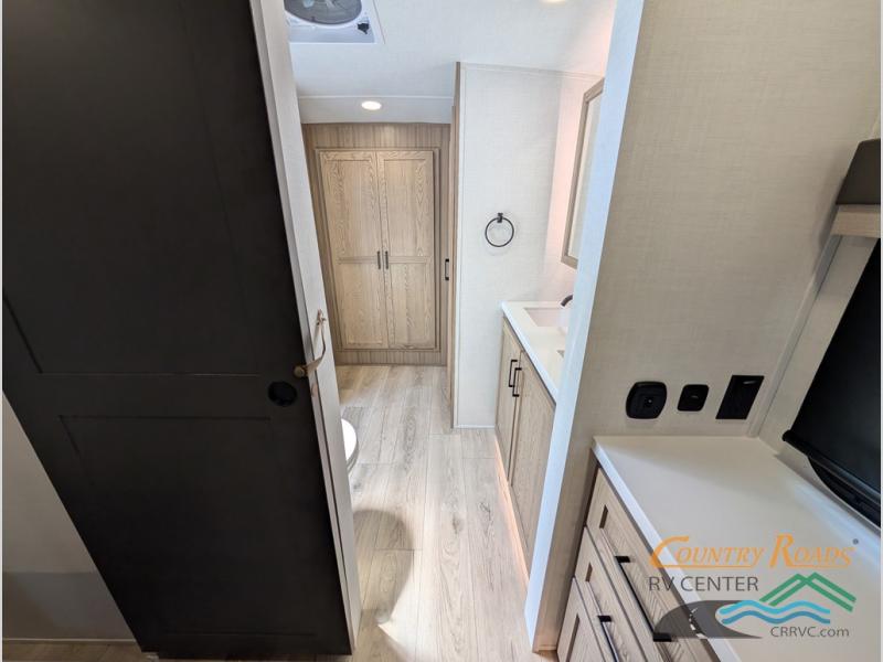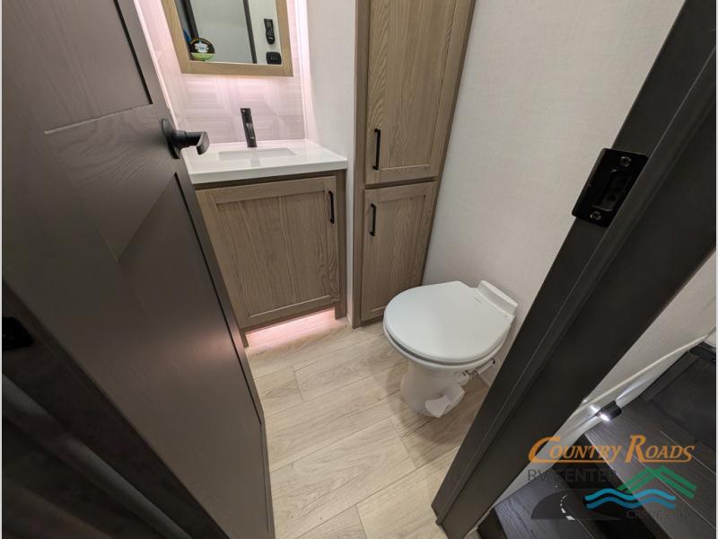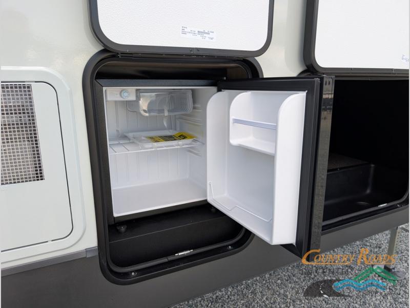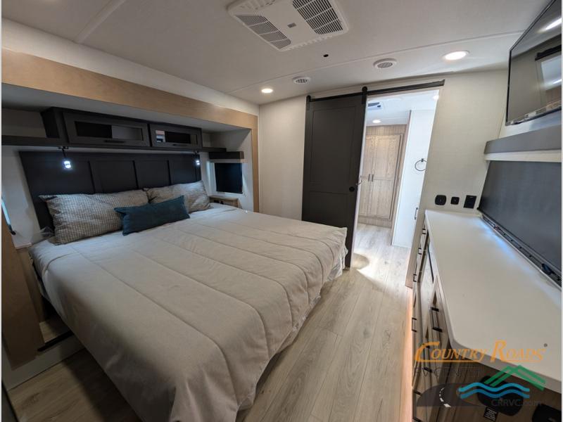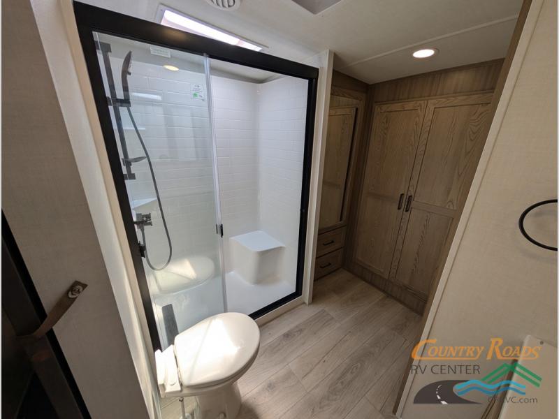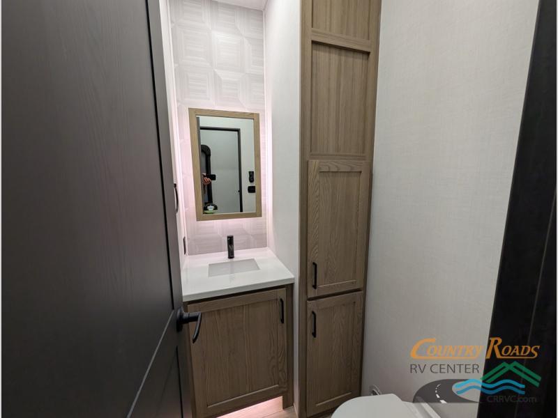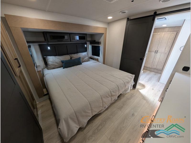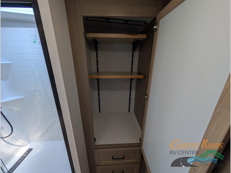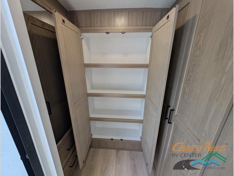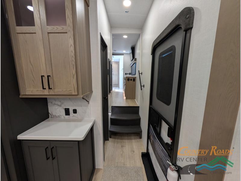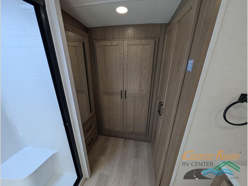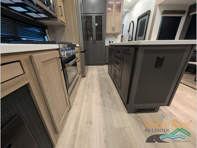 You can't go wrong when choosing this spacious fifth wheel! The master bedroom features a king bed slide out, wardrobe, and a dresser with a fireplace, and the full front bath is sure to bring comfort. There are dual bath sinks here, tons of storage, and even washer and dryer prep if you choose to add these appliances. The mid-coach half bath will come in handy if you have guests staying over on the rear hide-a-bed sofa. You'll also find a theater seat and a rotating table and chairs where you can dine and relax each day, plus there is a large kitchen island so the chef of your group has plenty of prep space. A Smart TV and fireplace will make your space feel more like home, and there is a pull-out desk here if you need to get some work done!