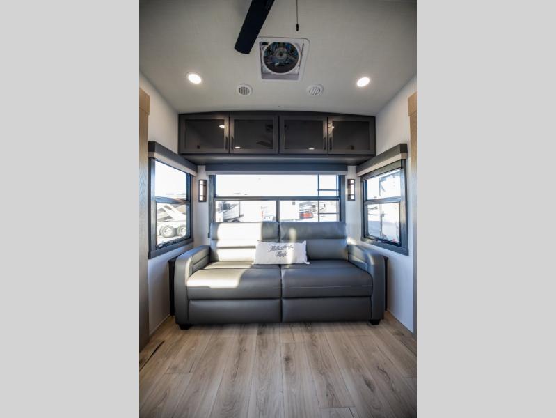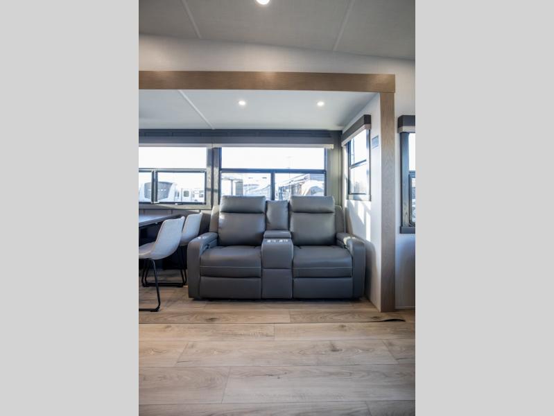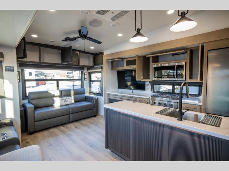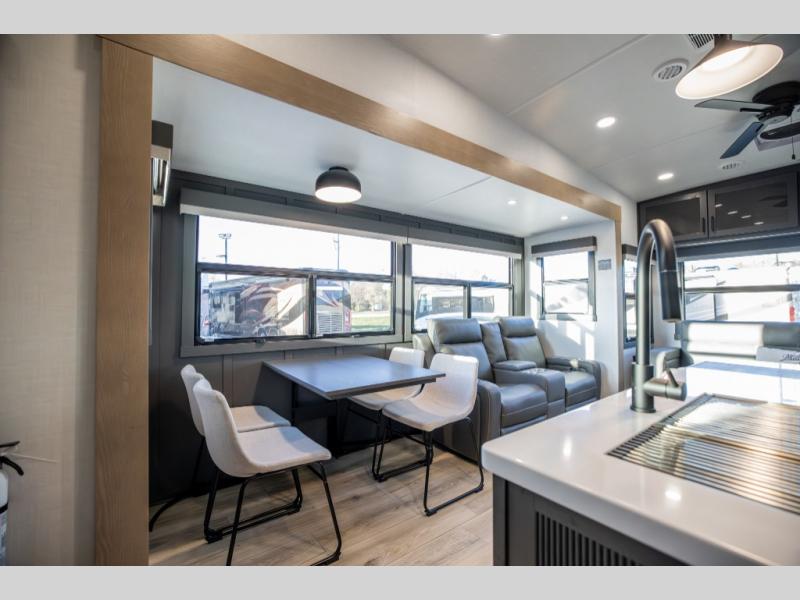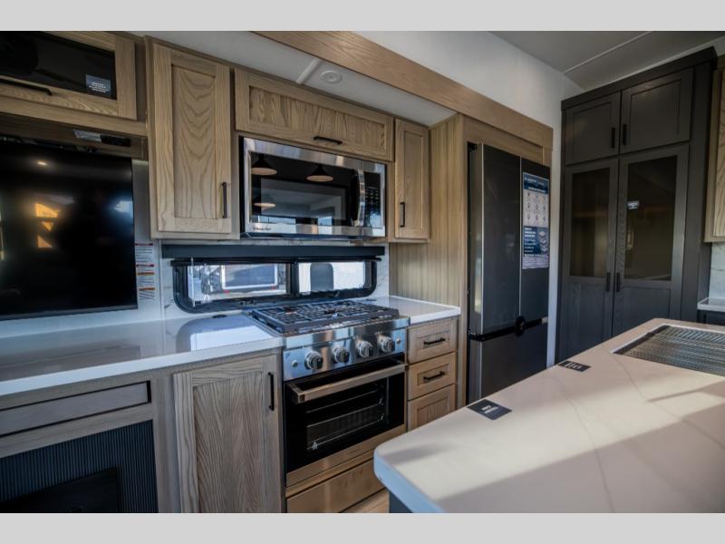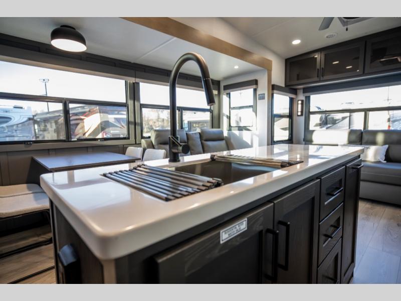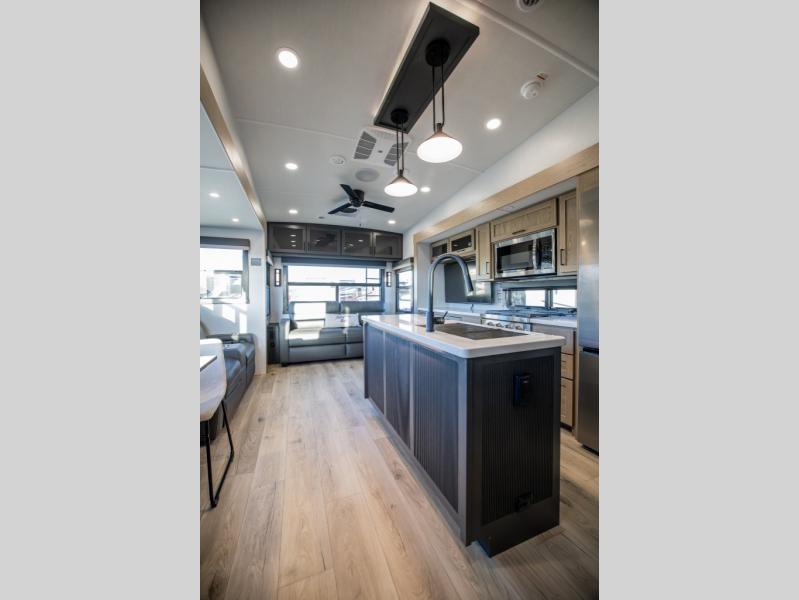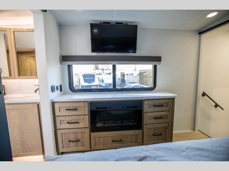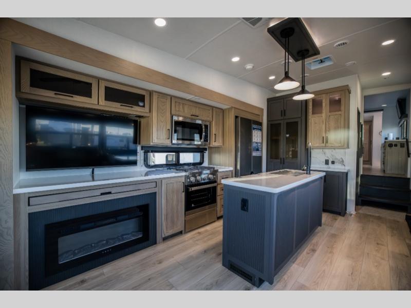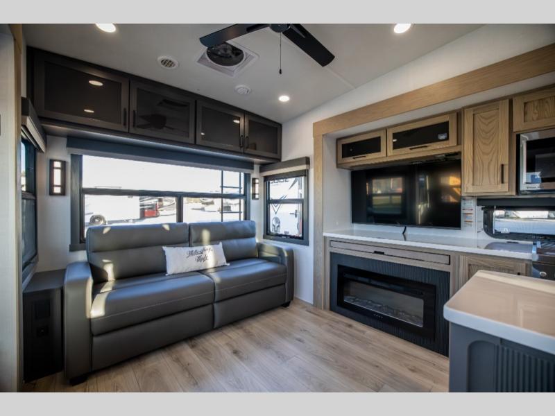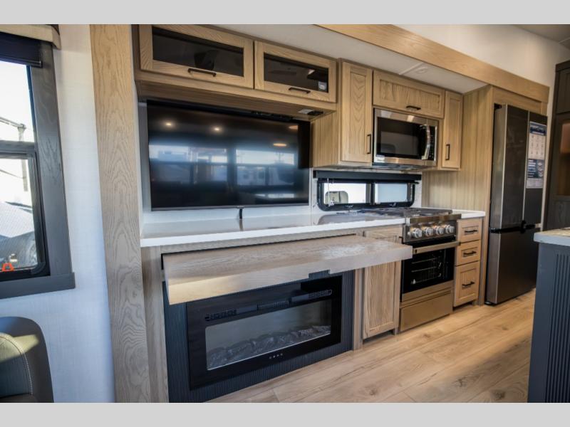 You can't go wrong when choosing this spacious fifth wheel! The master bedroom features a king bed slide out, wardrobe, and a dresser with a fireplace, and the full front bath is sure to bring comfort. There are dual bath sinks here, tons of storage, and even washer and dryer prep if you choose to add these appliances. The mid-coach half bath will come in handy if you have guests staying over on the rear hide-a-bed sofa. You'll also find a theater seat and a rotating table and chairs where you can dine and relax each day, plus there is a large kitchen island so the chef of your group has plenty of prep space. A Smart TV and fireplace will make your space feel more like home, and there is a pull-out desk here if you need to get some work done!