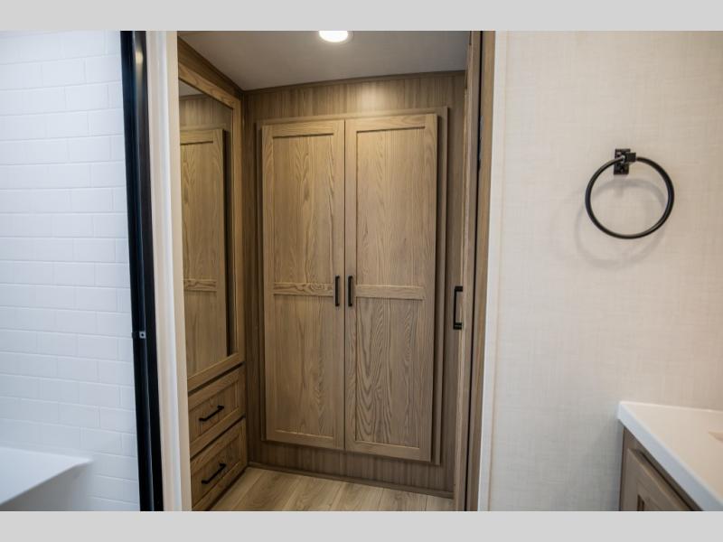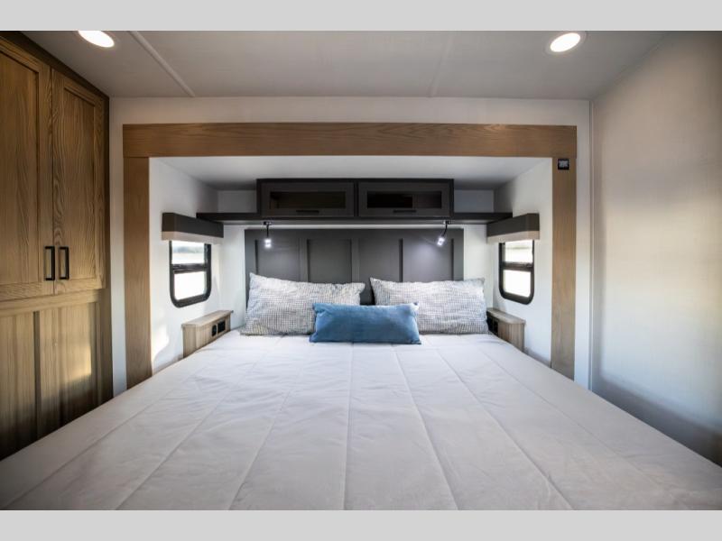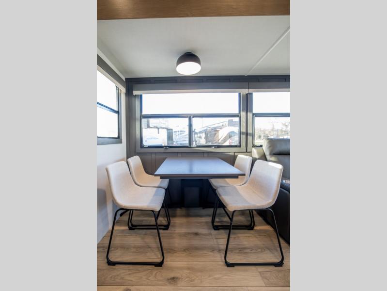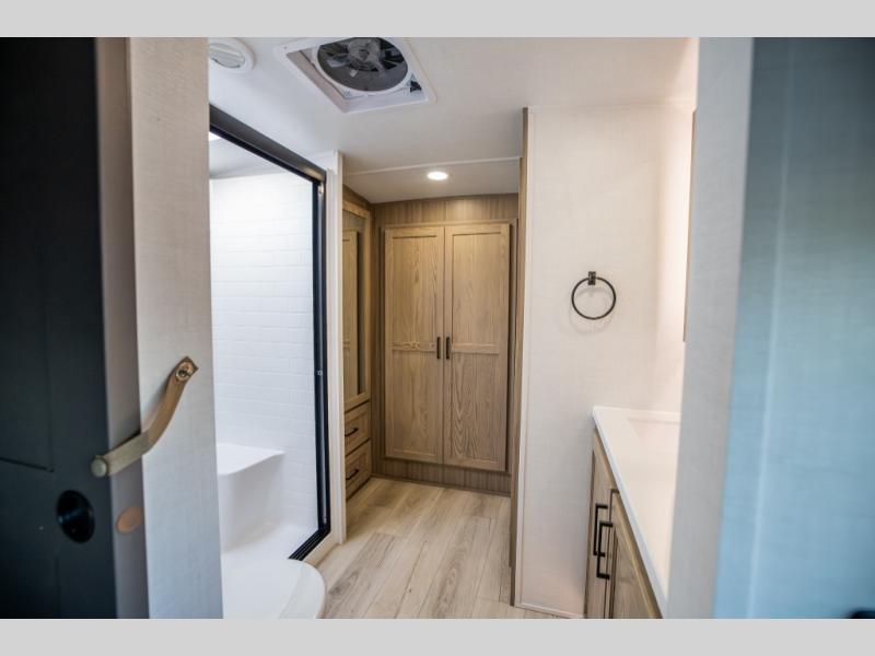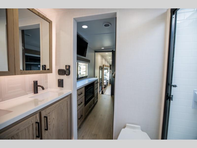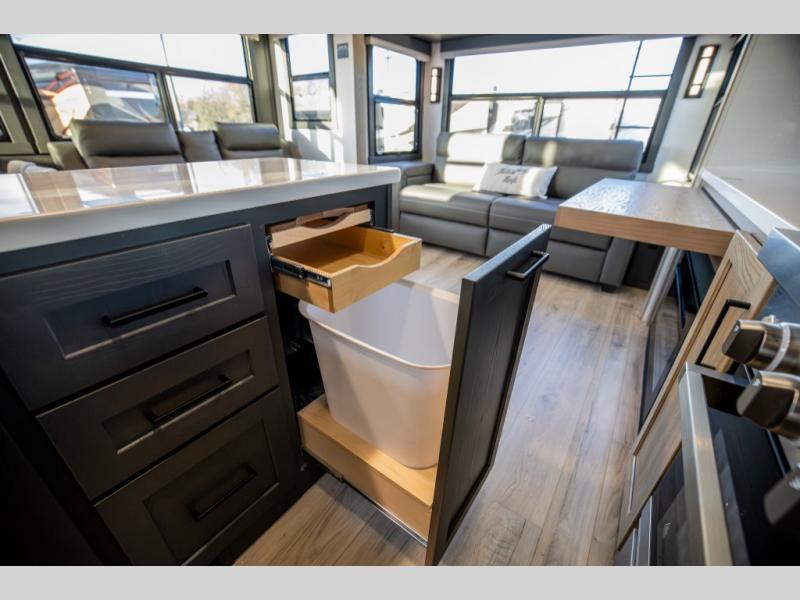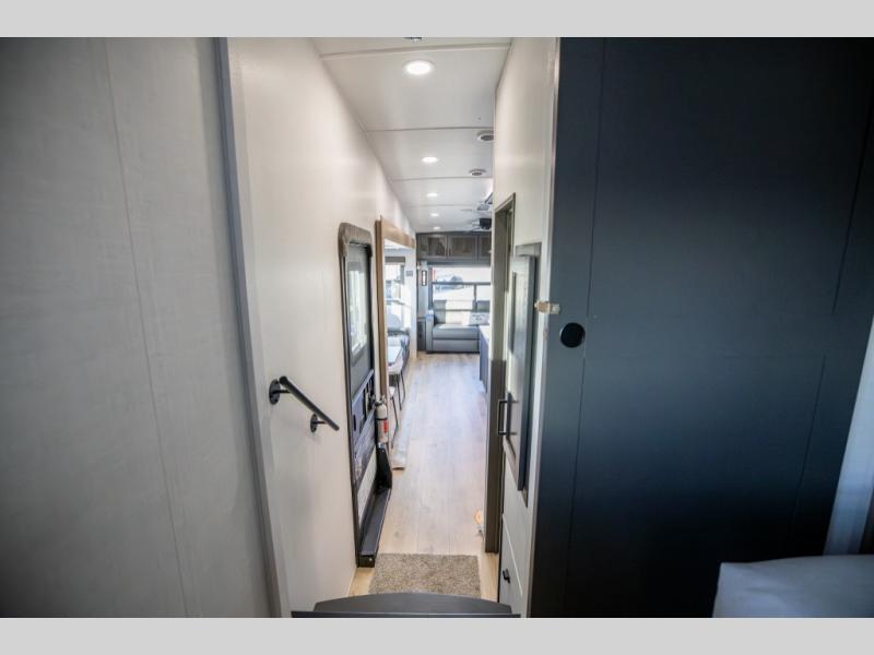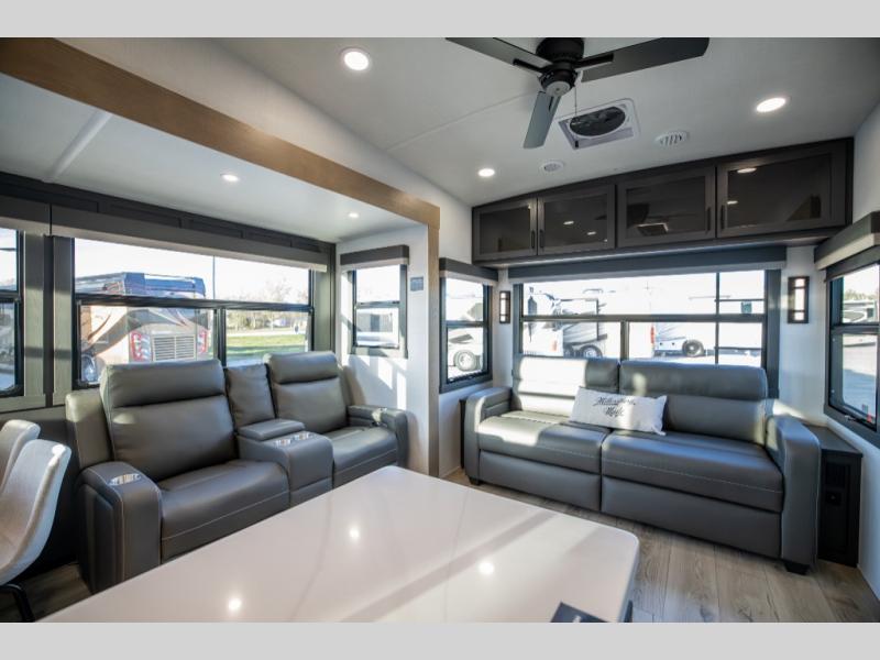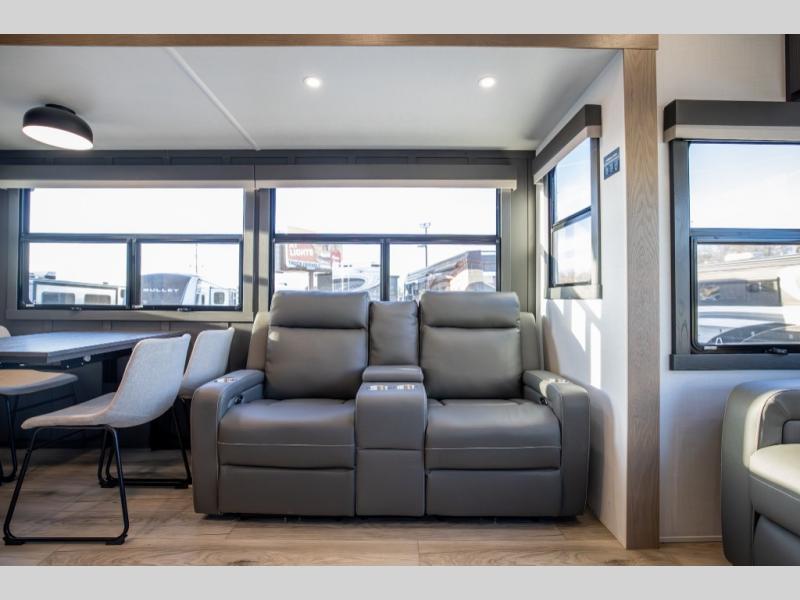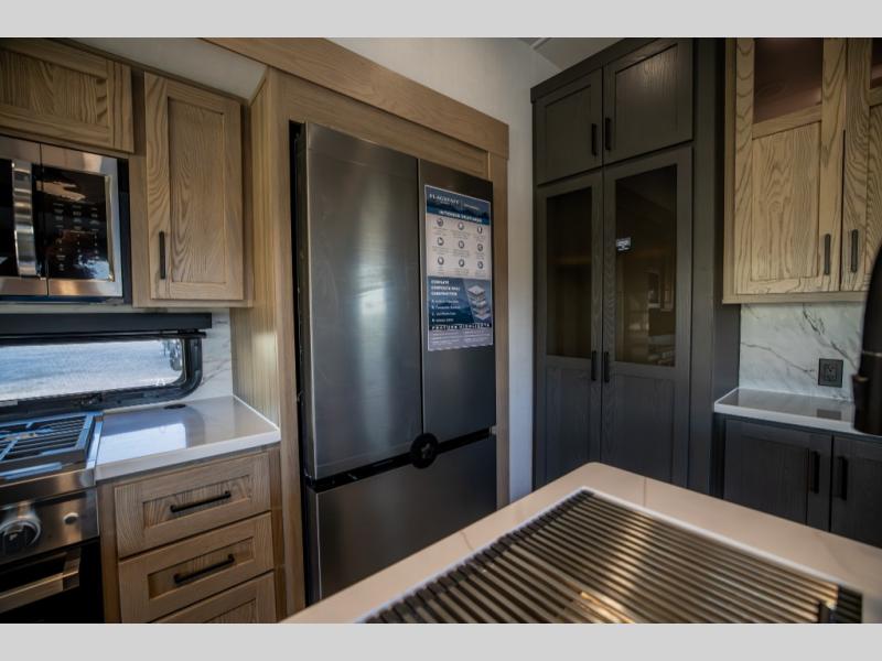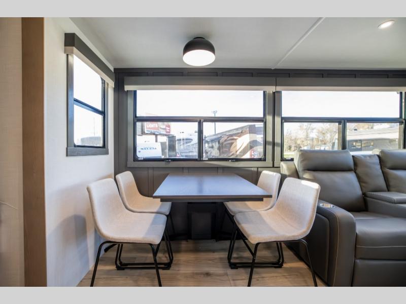 You can't go wrong when choosing this spacious fifth wheel! The master bedroom features a king bed slide out, wardrobe, and a dresser with a fireplace, and the full front bath is sure to bring comfort. There are dual bath sinks here, tons of storage, and even washer and dryer prep if you choose to add these appliances. The mid-coach half bath will come in handy if you have guests staying over on the rear hide-a-bed sofa. You'll also find a theater seat and a rotating table and chairs where you can dine and relax each day, plus there is a large kitchen island so the chef of your group has plenty of prep space. A Smart TV and fireplace will make your space feel more like home, and there is a pull-out desk here if you need to get some work done!