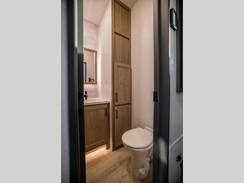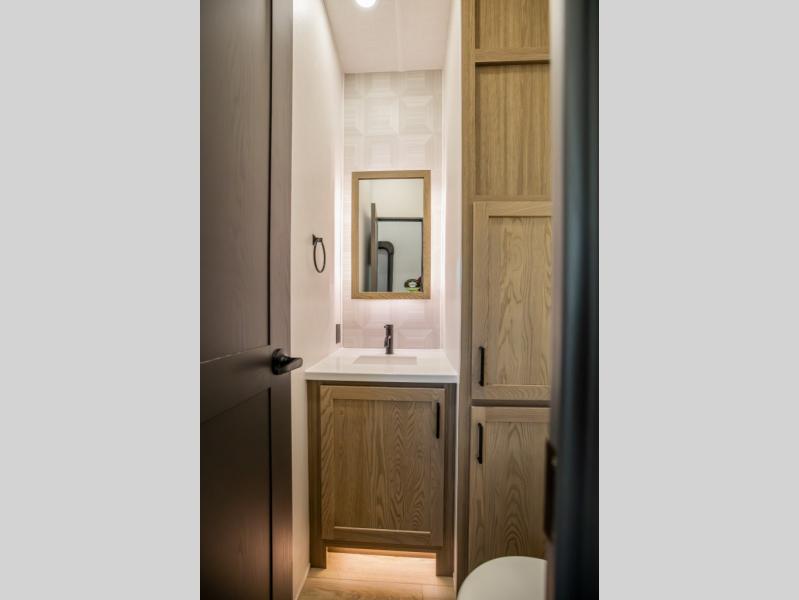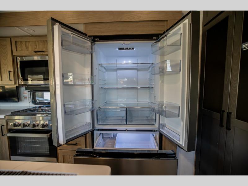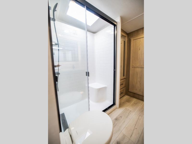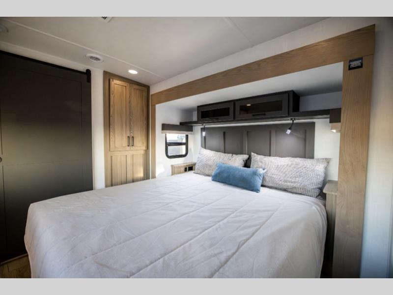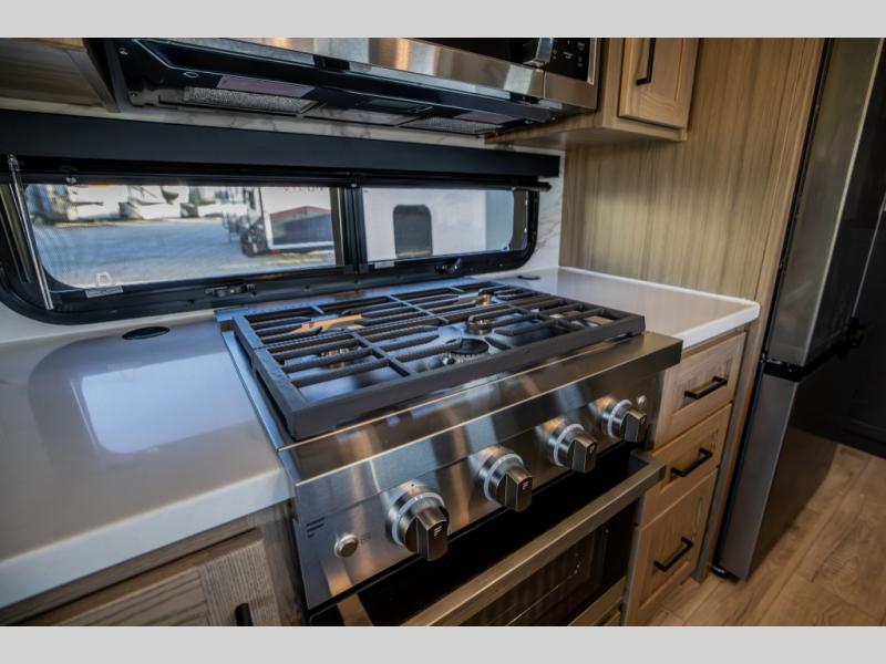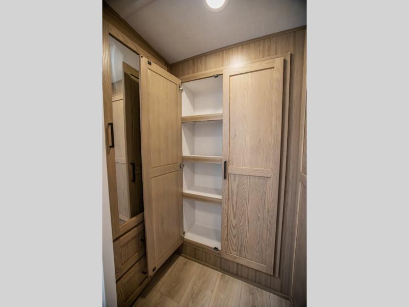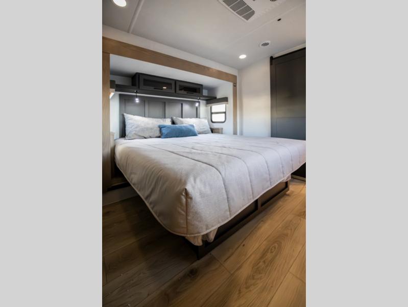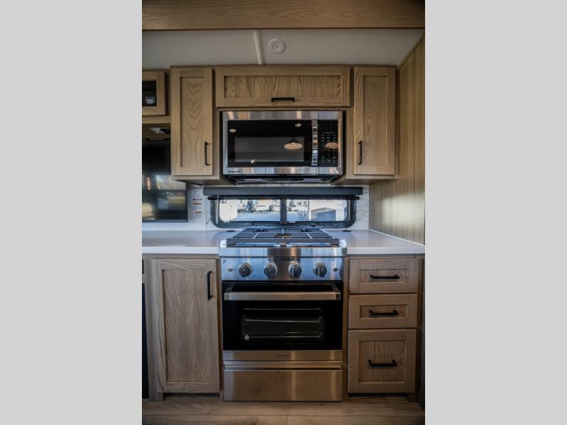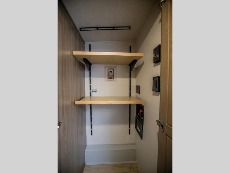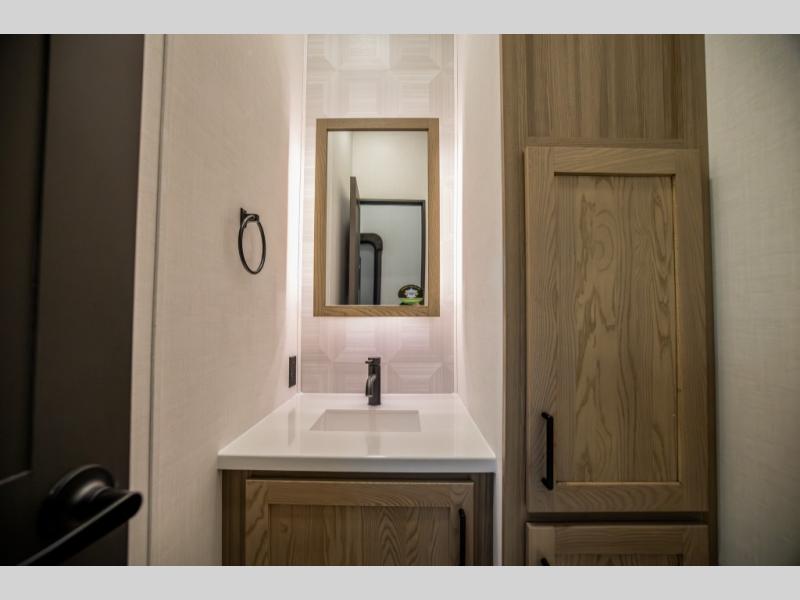 You can't go wrong when choosing this spacious fifth wheel! The master bedroom features a king bed slide out, wardrobe, and a dresser with a fireplace, and the full front bath is sure to bring comfort. There are dual bath sinks here, tons of storage, and even washer and dryer prep if you choose to add these appliances. The mid-coach half bath will come in handy if you have guests staying over on the rear hide-a-bed sofa. You'll also find a theater seat and a rotating table and chairs where you can dine and relax each day, plus there is a large kitchen island so the chef of your group has plenty of prep space. A Smart TV and fireplace will make your space feel more like home, and there is a pull-out desk here if you need to get some work done!