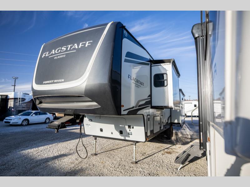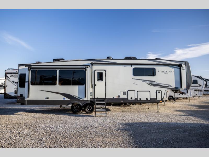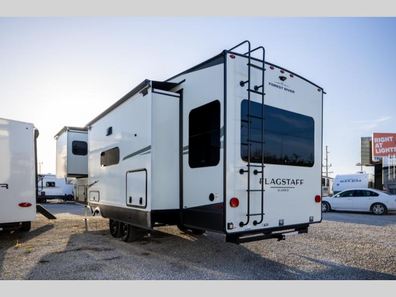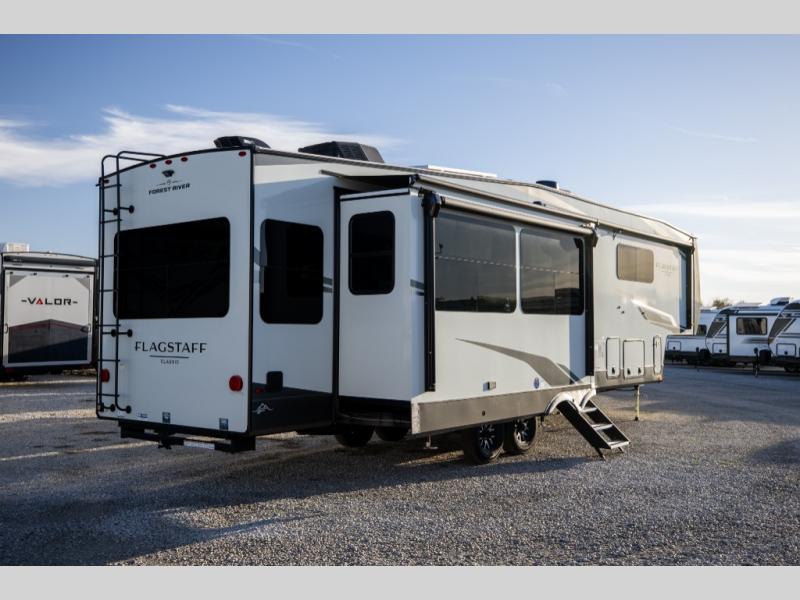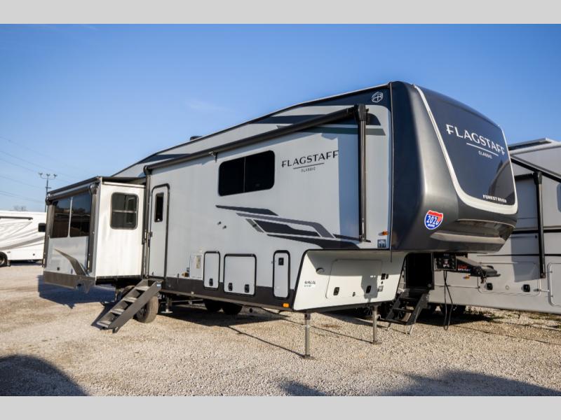 Each one of these Forest River Flagstaff Classic fifth wheels or travel trailers will be your home on wheels! Their quality craftsmanship and attention to detail shines through the enclosed underbelly, the fully laminated walkable roof, and six-sided full-aluminum frame. Towing your unit will be easy with the Goodyear Endurance tires plus RoadTech tire pressure monitoring. Additional exterior features include a 200W solar panel, slam baggage doors, a Key-Alike lock system, and double 30 lb. LP tanks to name a few conveniences. Head inside to find a residential style gas range, solid surface kitchen and bath countertops, soft close hidden cabinet hinges, and more comforts!