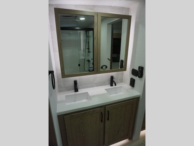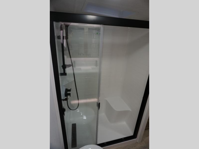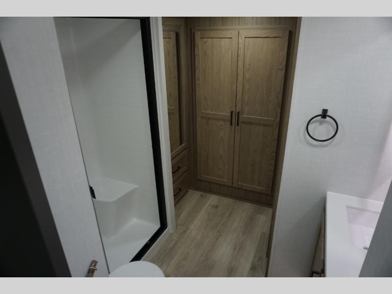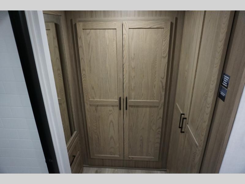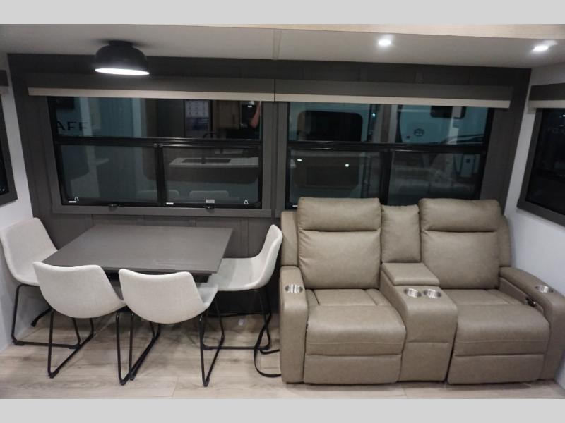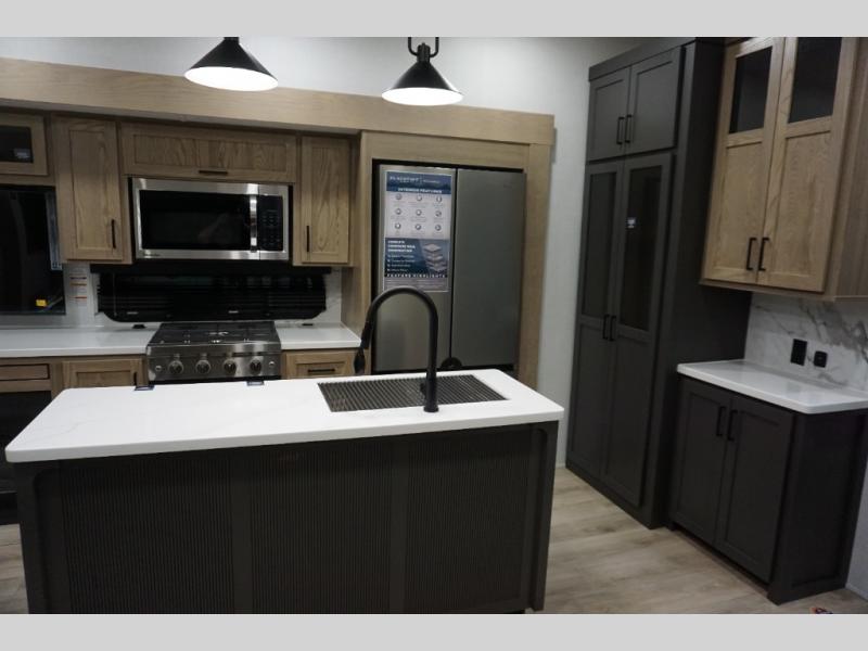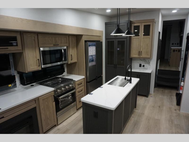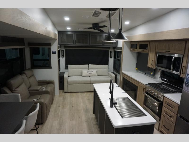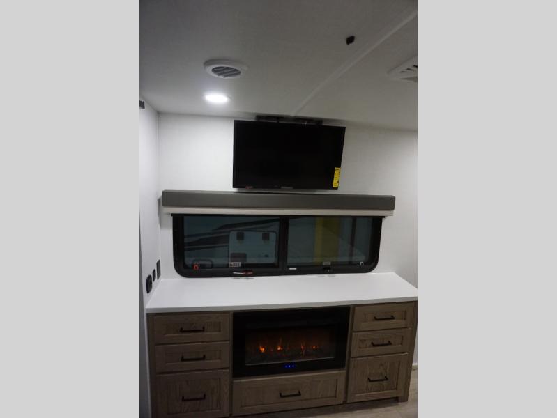 You can't go wrong when choosing this spacious fifth wheel! The master bedroom features a king bed slide out, wardrobe, and a dresser with a fireplace, and the full front bath is sure to bring comfort. There are dual bath sinks here, tons of storage, and even washer and dryer prep if you choose to add these appliances. The mid-coach half bath will come in handy if you have guests staying over on the rear hide-a-bed sofa. You'll also find a theater seat and a rotating table and chairs where you can dine and relax each day, plus there is a large kitchen island so the chef of your group has plenty of prep space. A Smart TV and fireplace will make your space feel more like home, and there is a pull-out desk here if you need to get some work done!